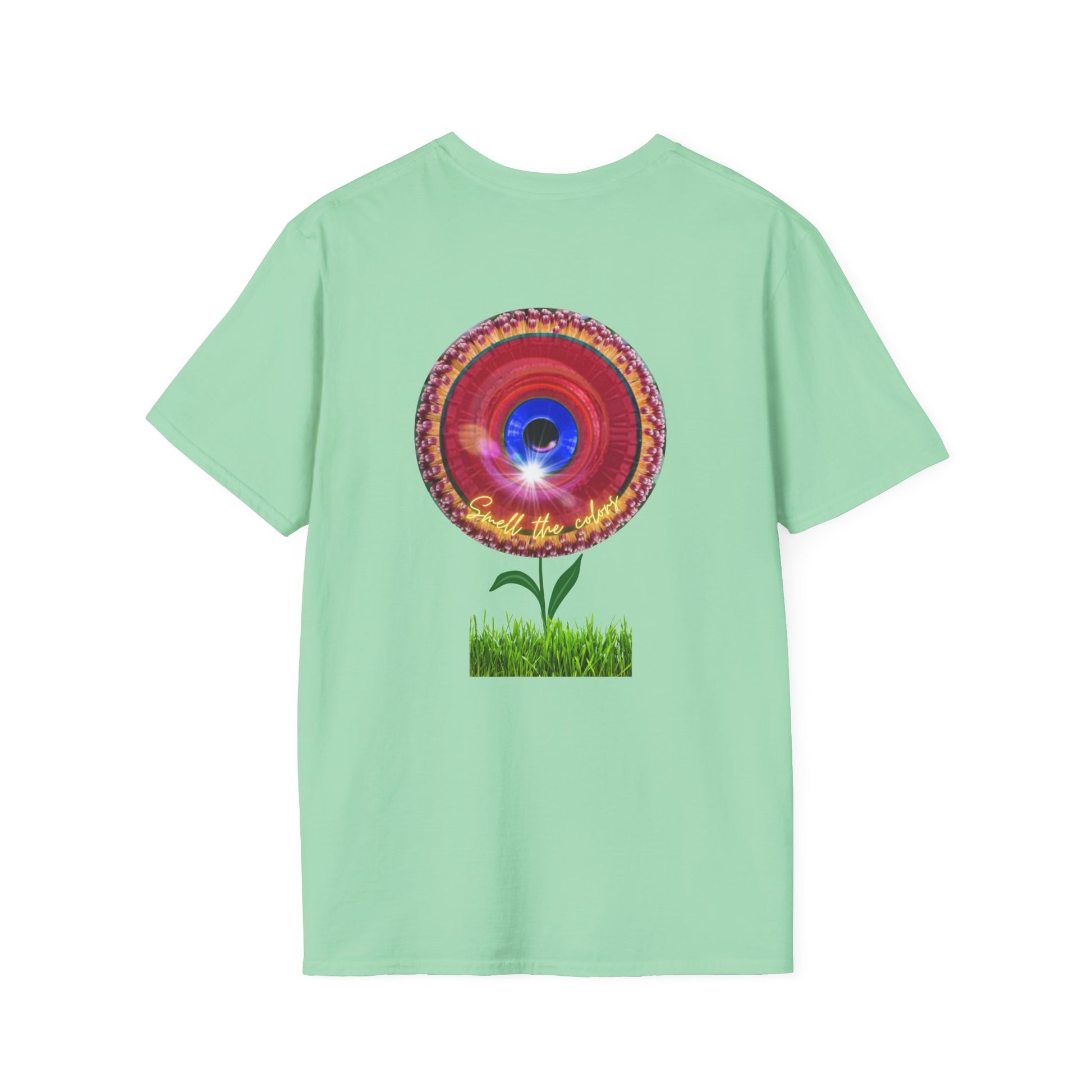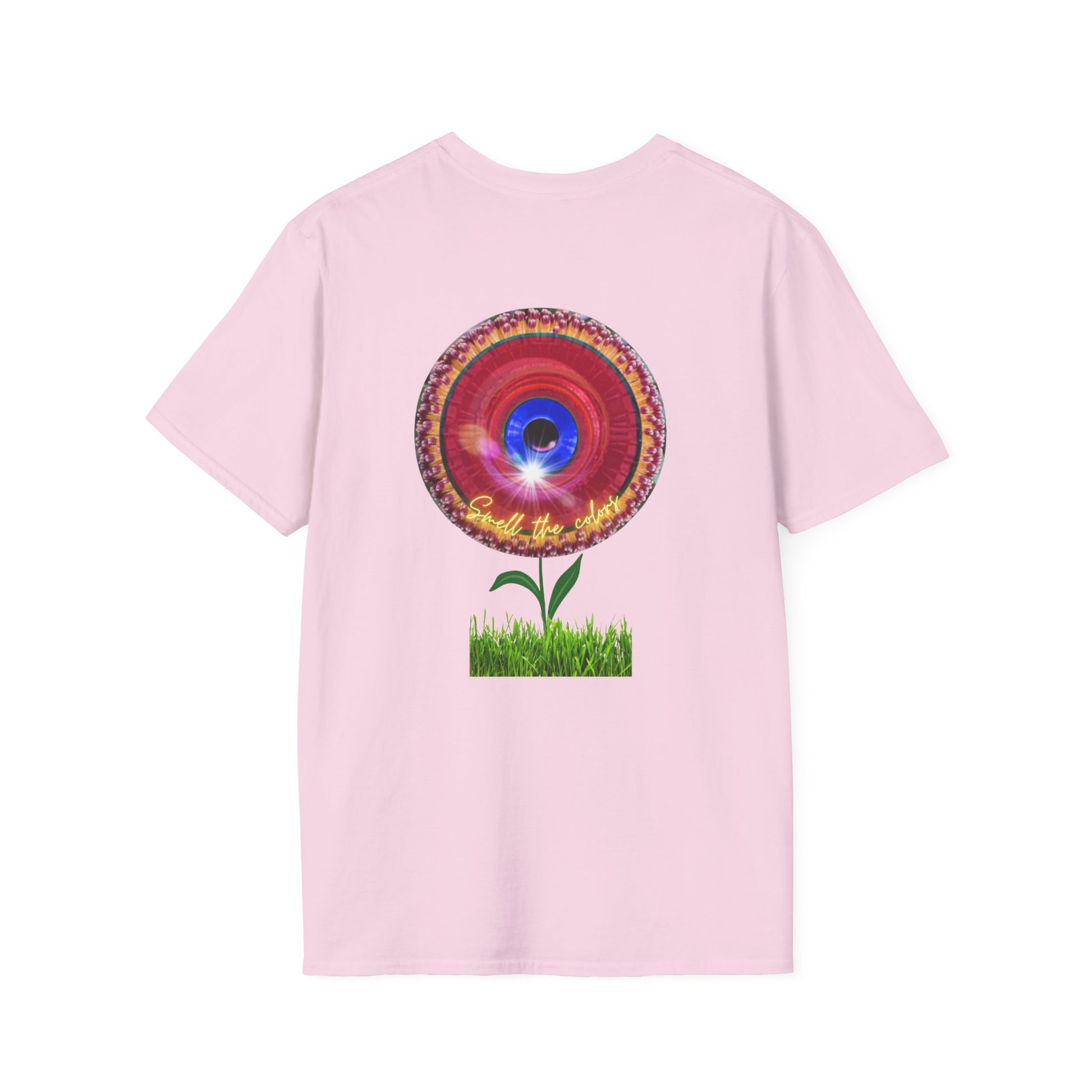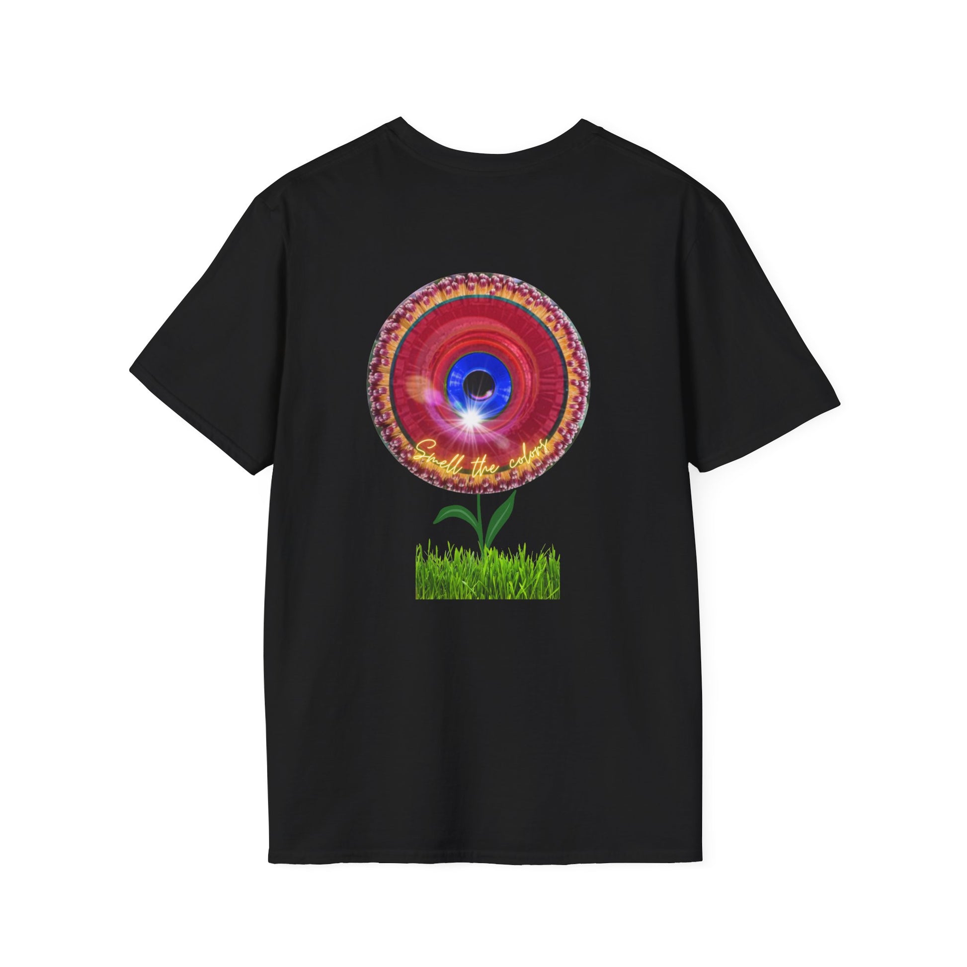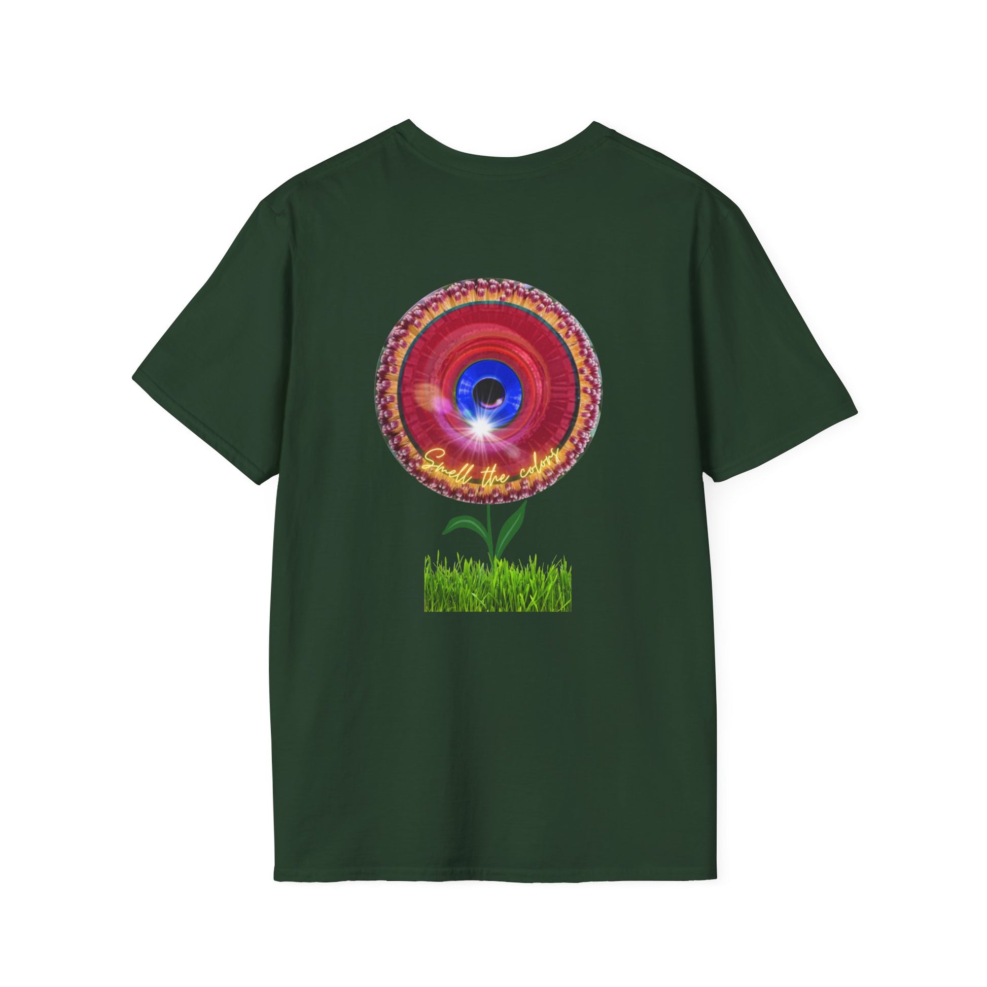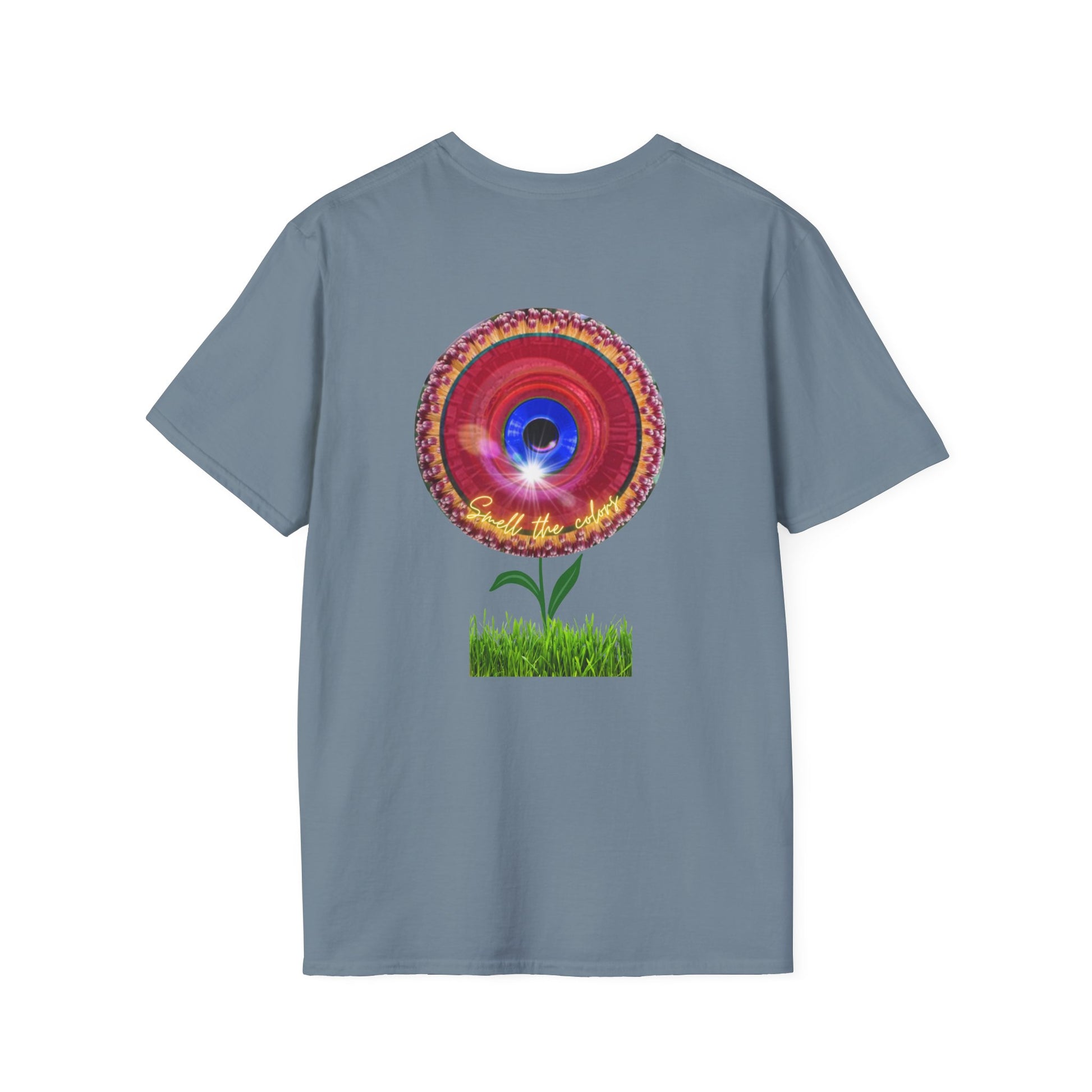 Classic Donut Tee - Unisex Soft-Style - "Smell the Donuts Outside on my Lawn" " variant 2 - blue donut on red donut/flower