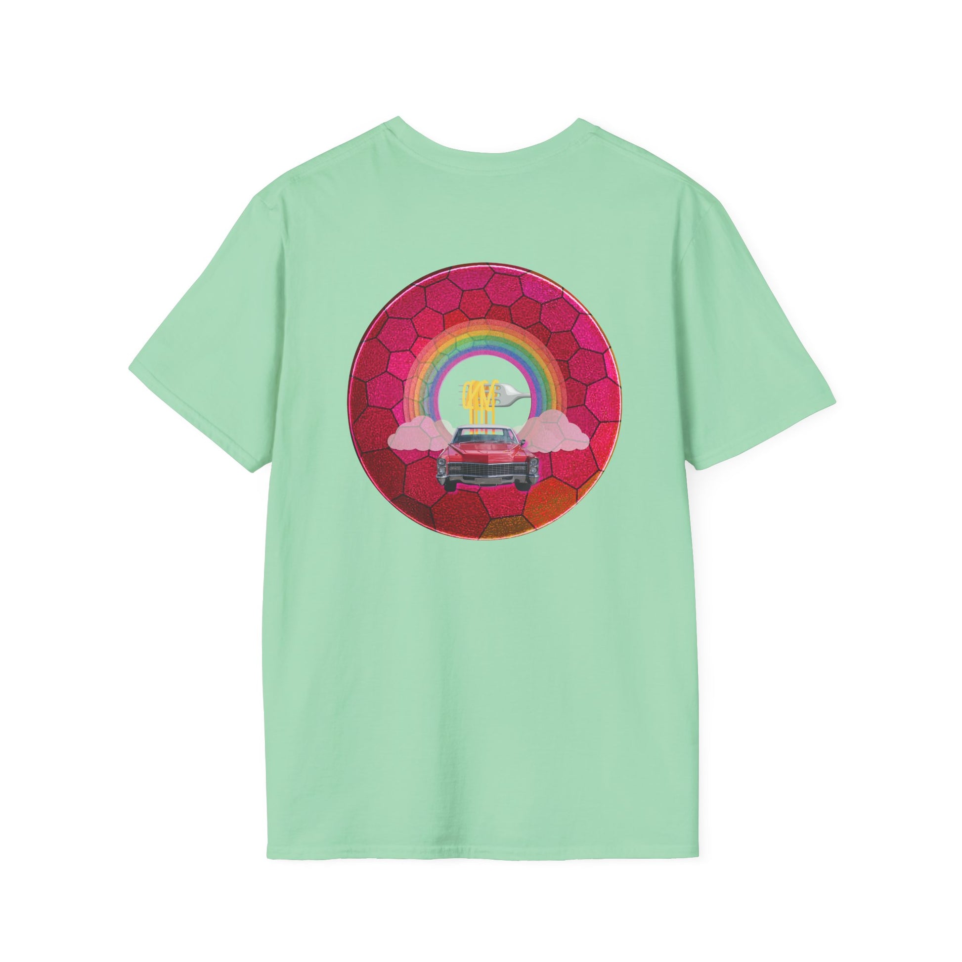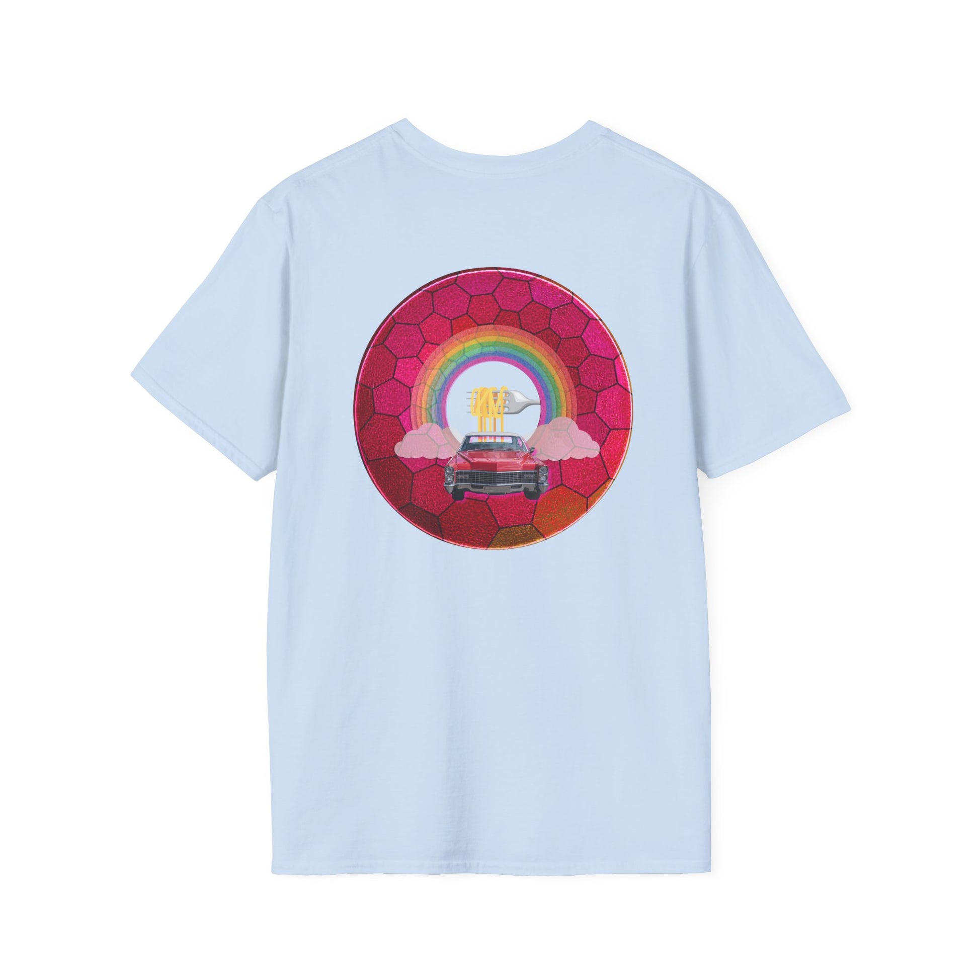 Classic Donut Tee - Unisex Soft-Style - "Cadillac Rainbows Donut Tee" - variant 1 - magenta hexadonut w/red caddy