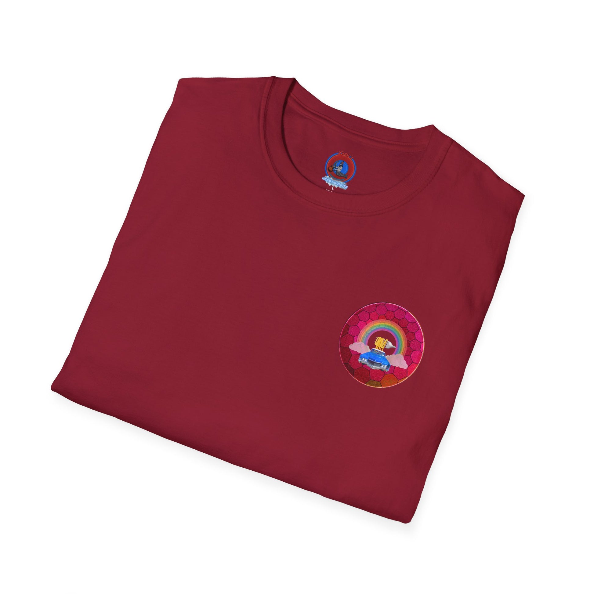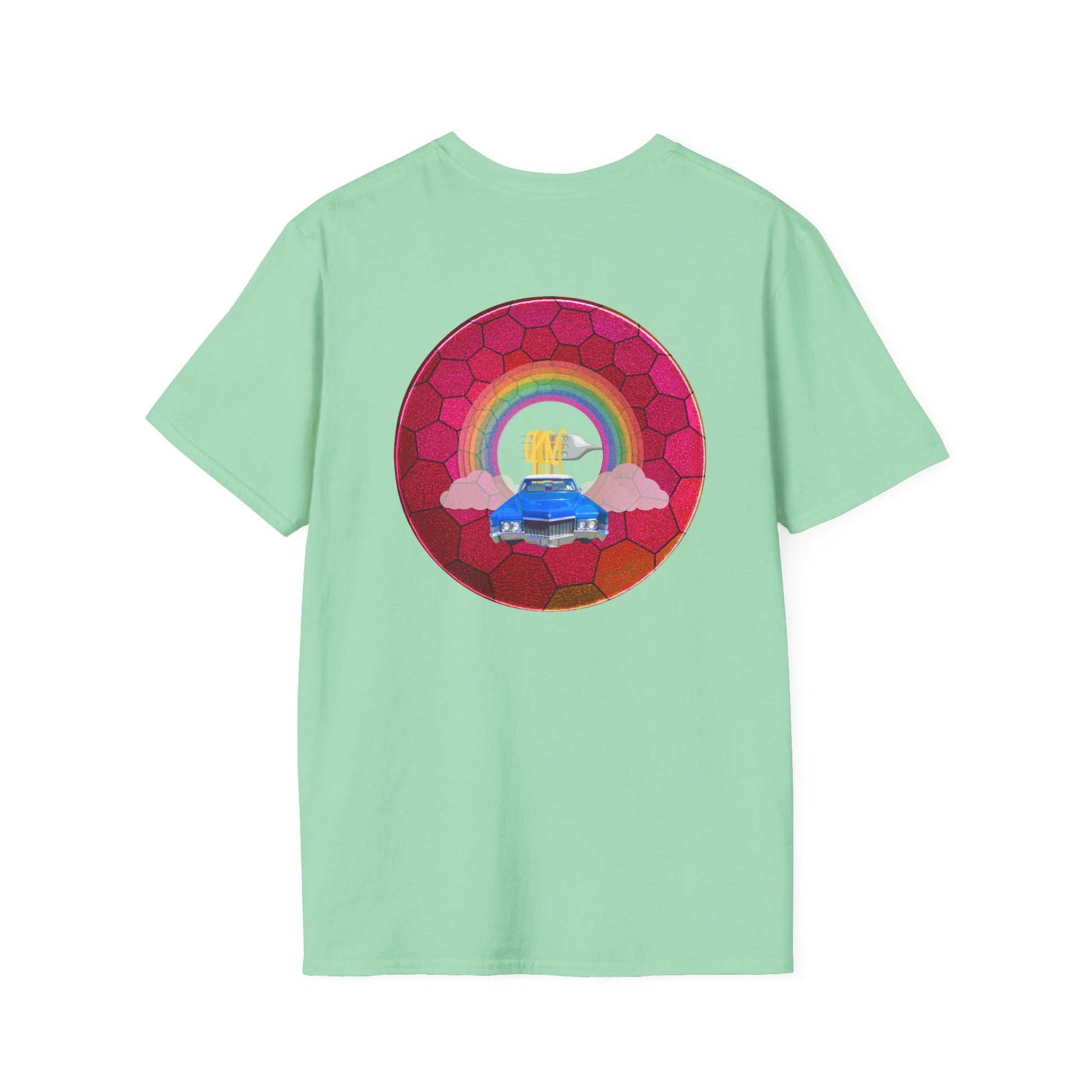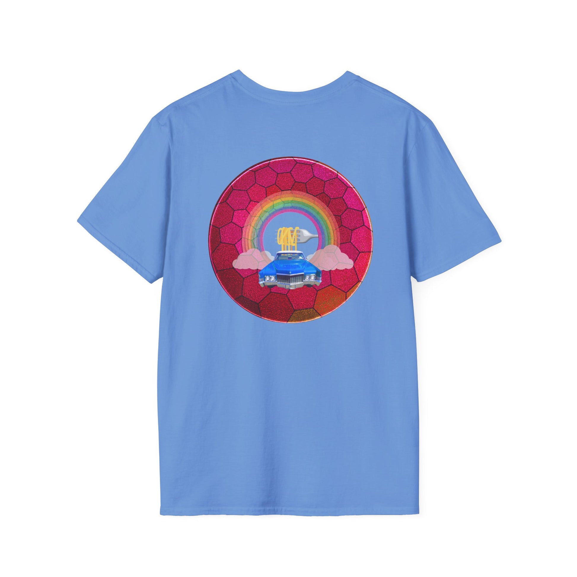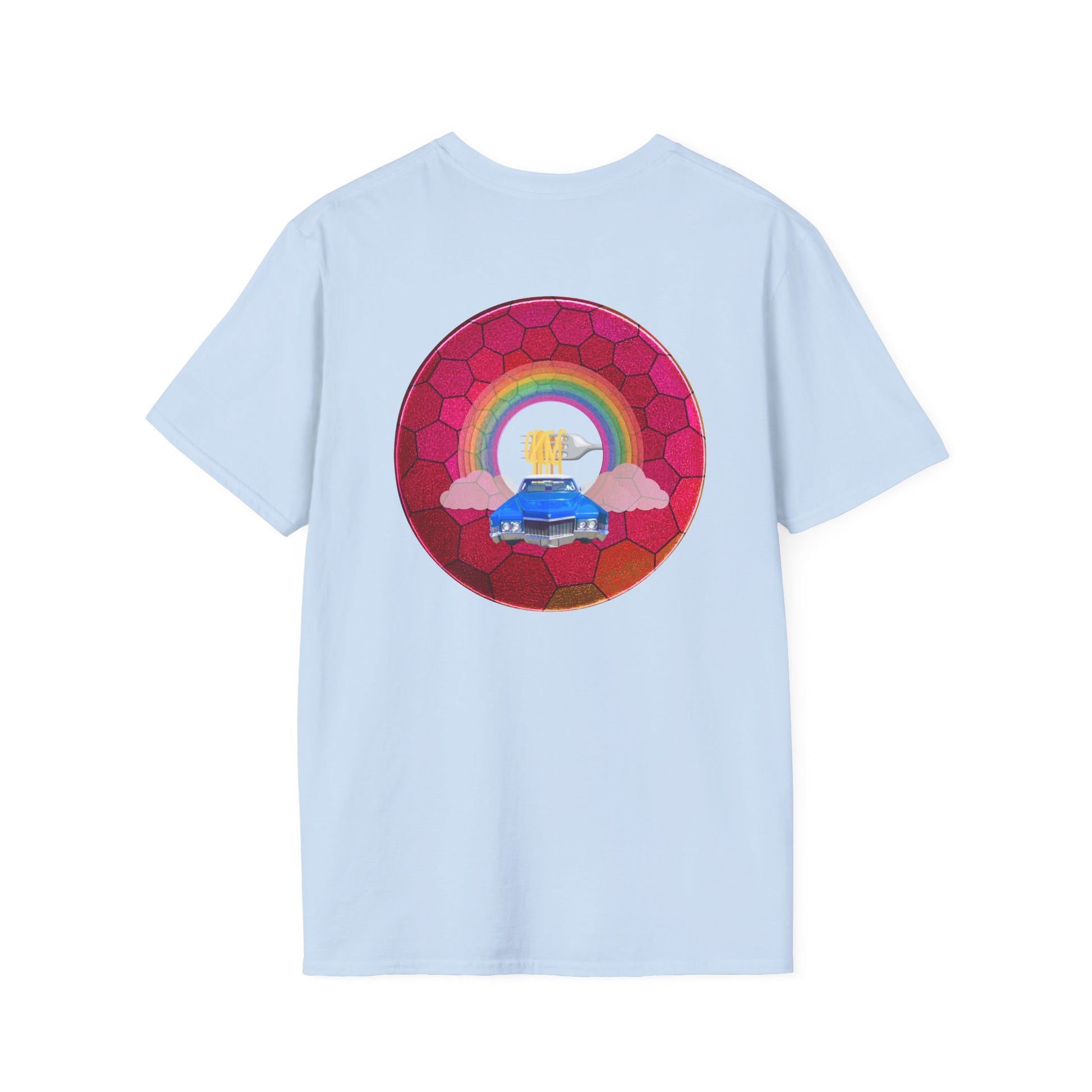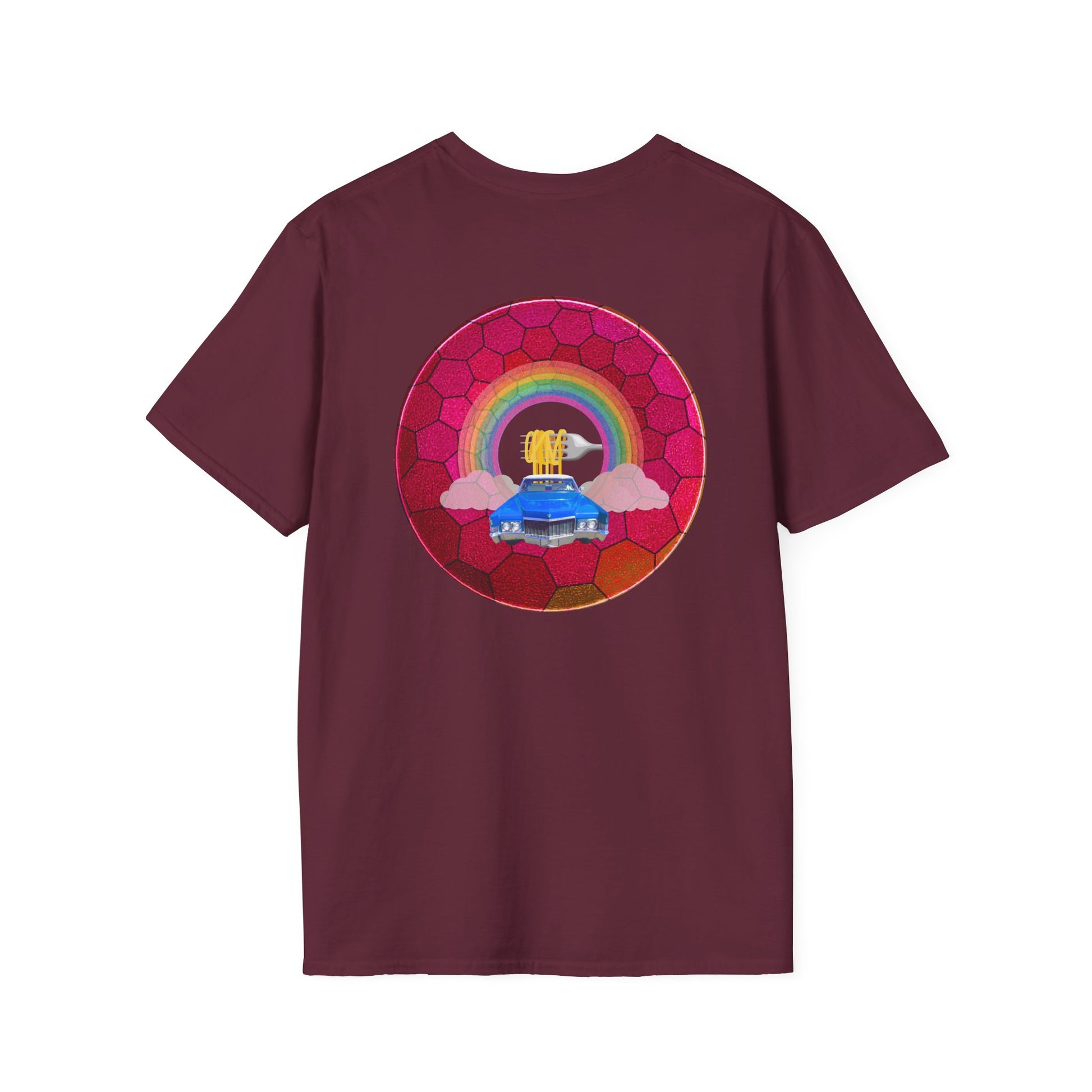 Classic Donut Tee - Unisex Soft-Style - "Cadillac Rainbows Donut Tee " - variant 2 - magenta hexadonut w/blue caddy