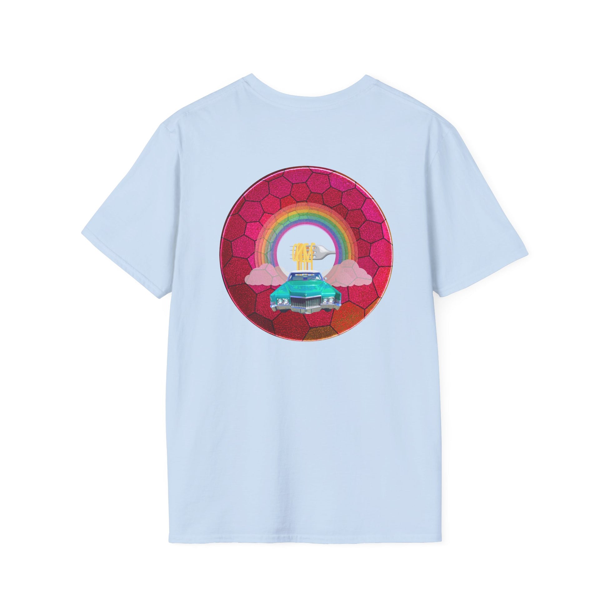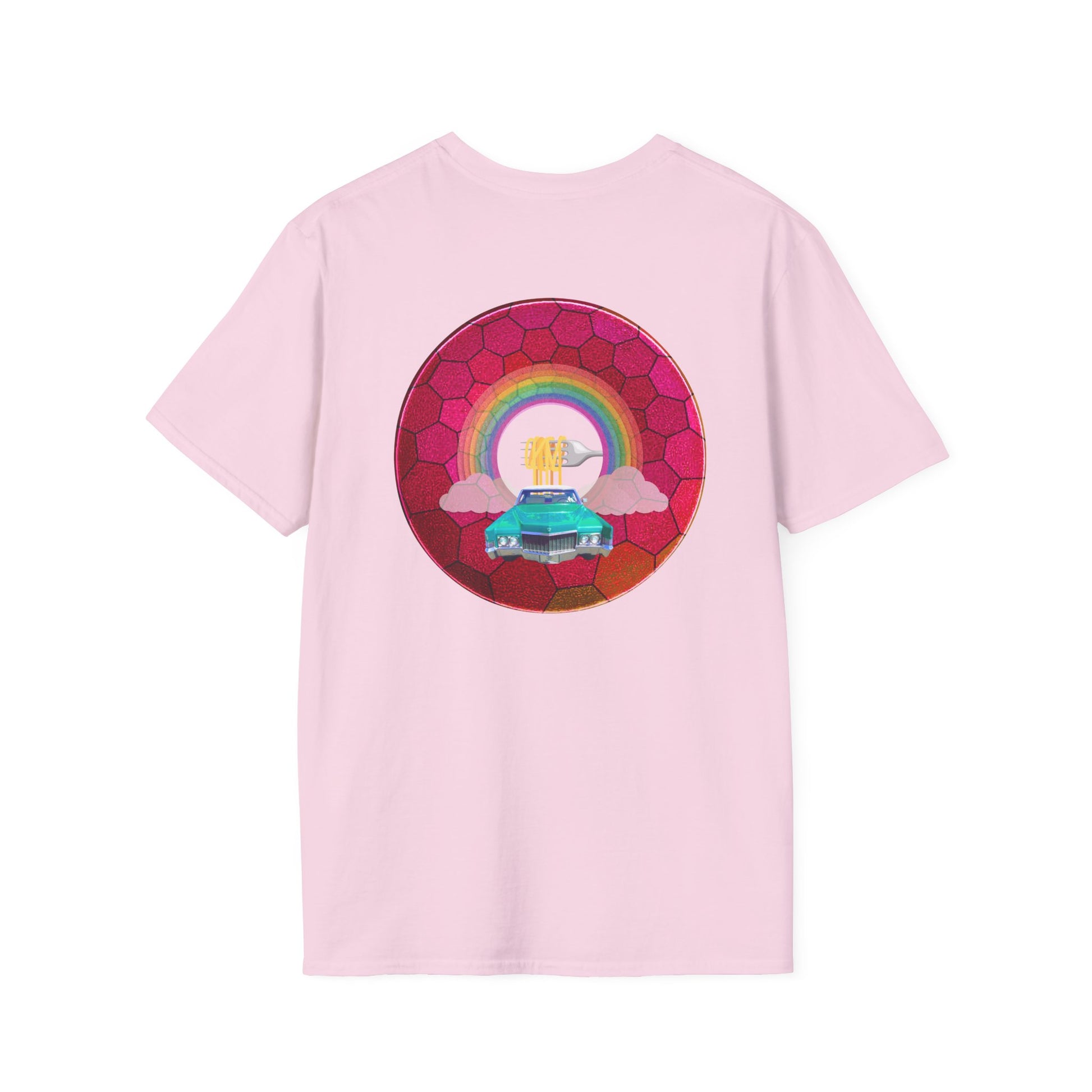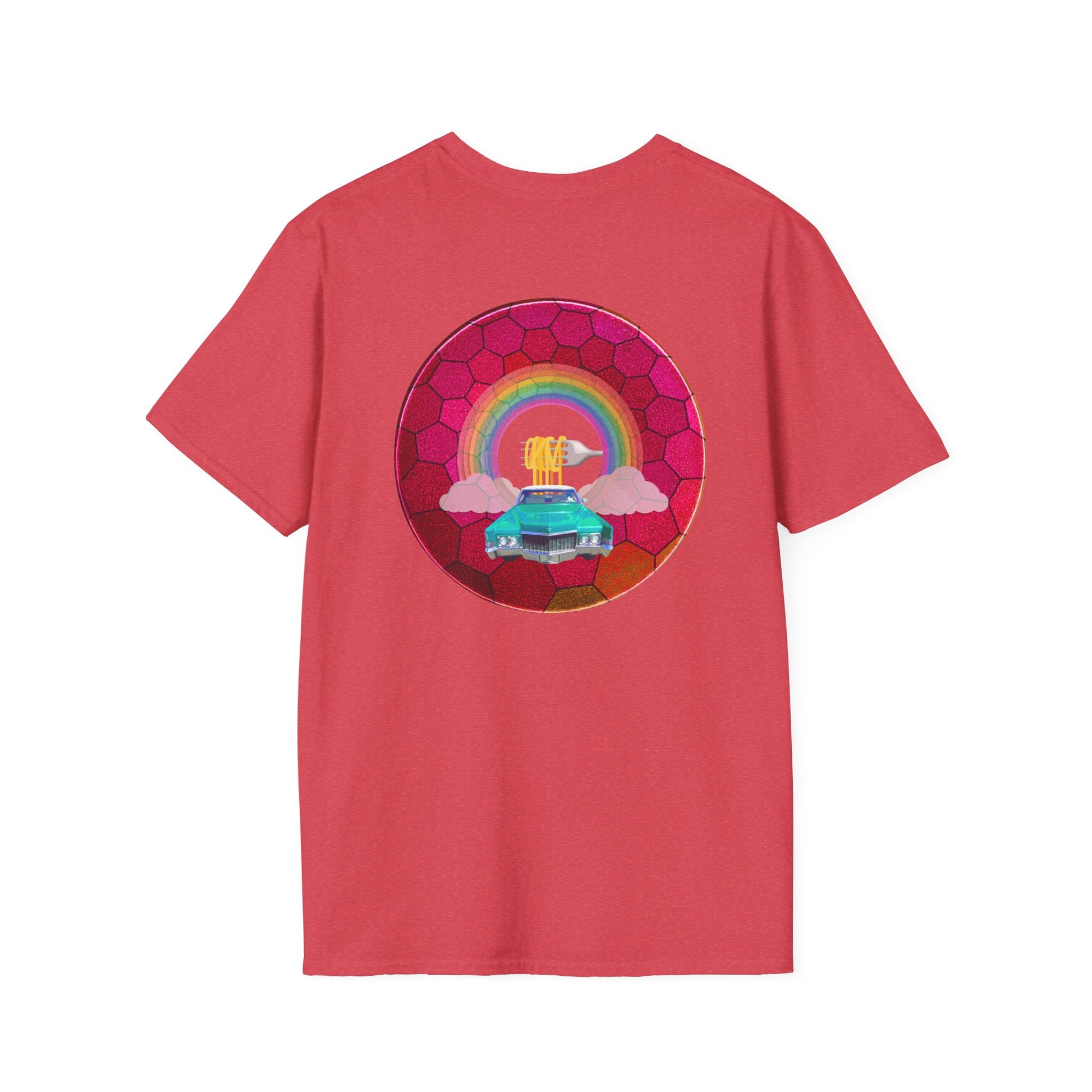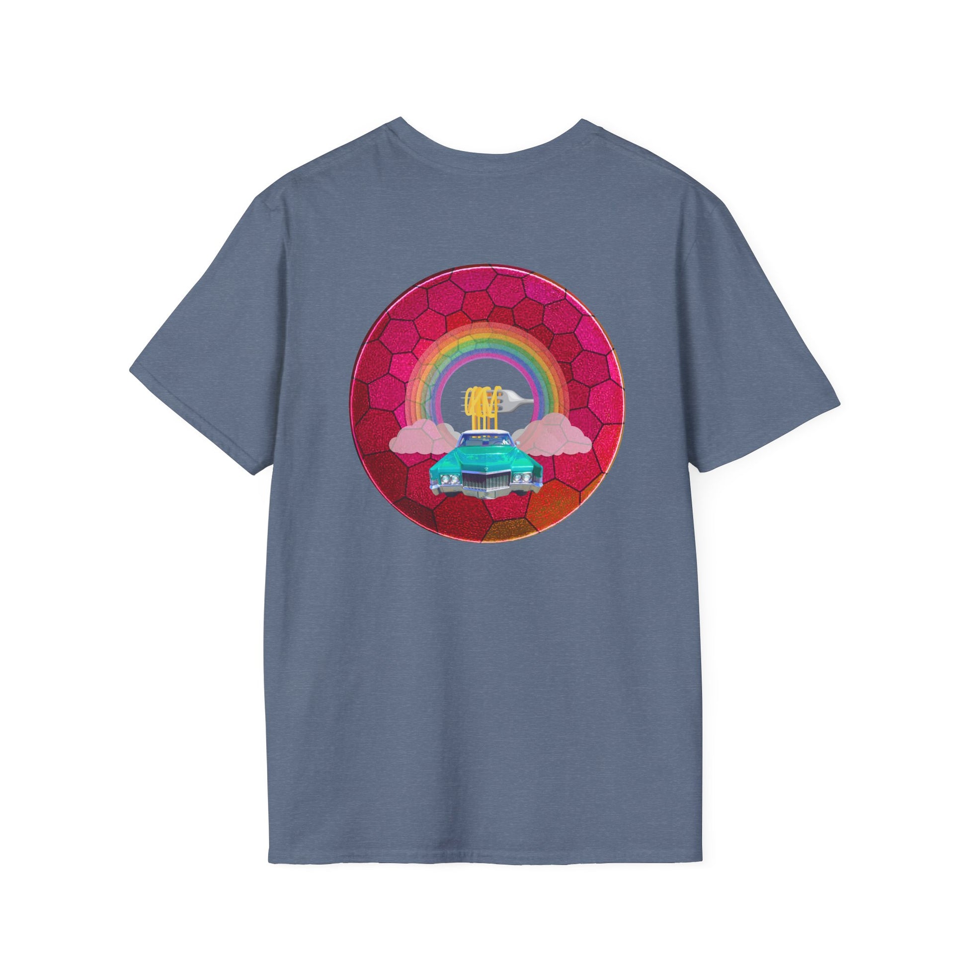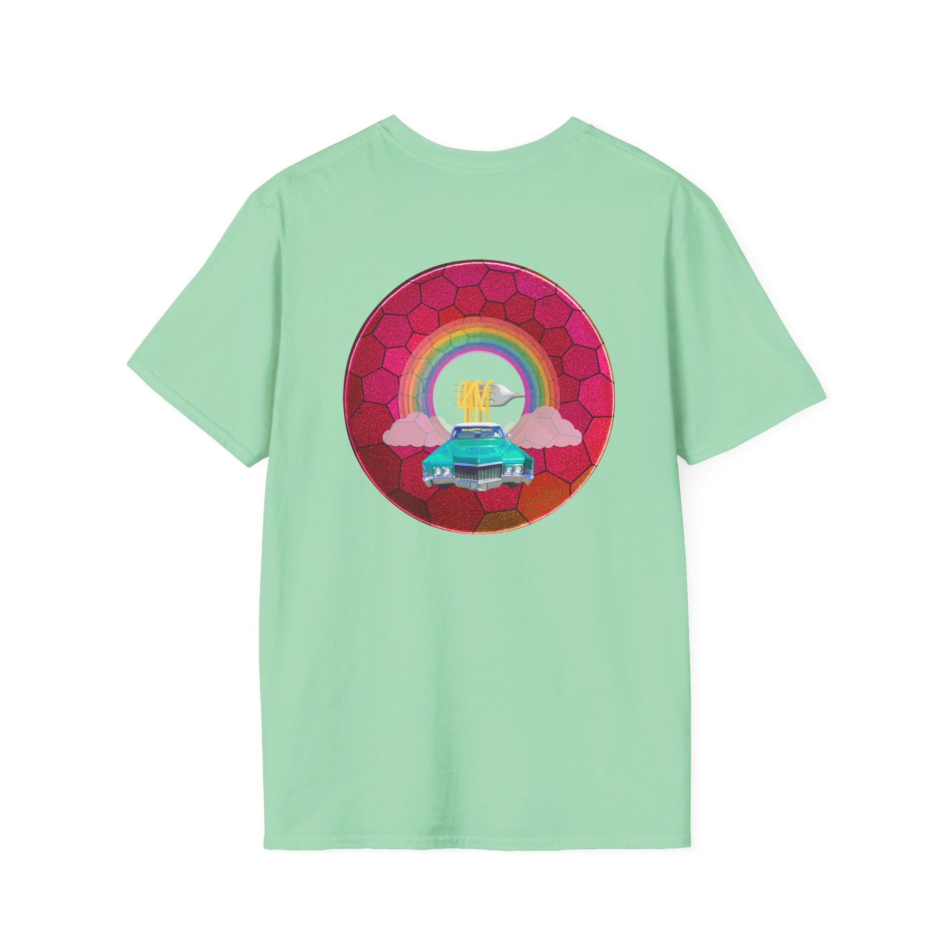 Classic Donut Tee - Unisex Soft-Style - "Cadillac Rainbows Donut Tee" - variant 3 - magenta hexadonut w/mint green caddy