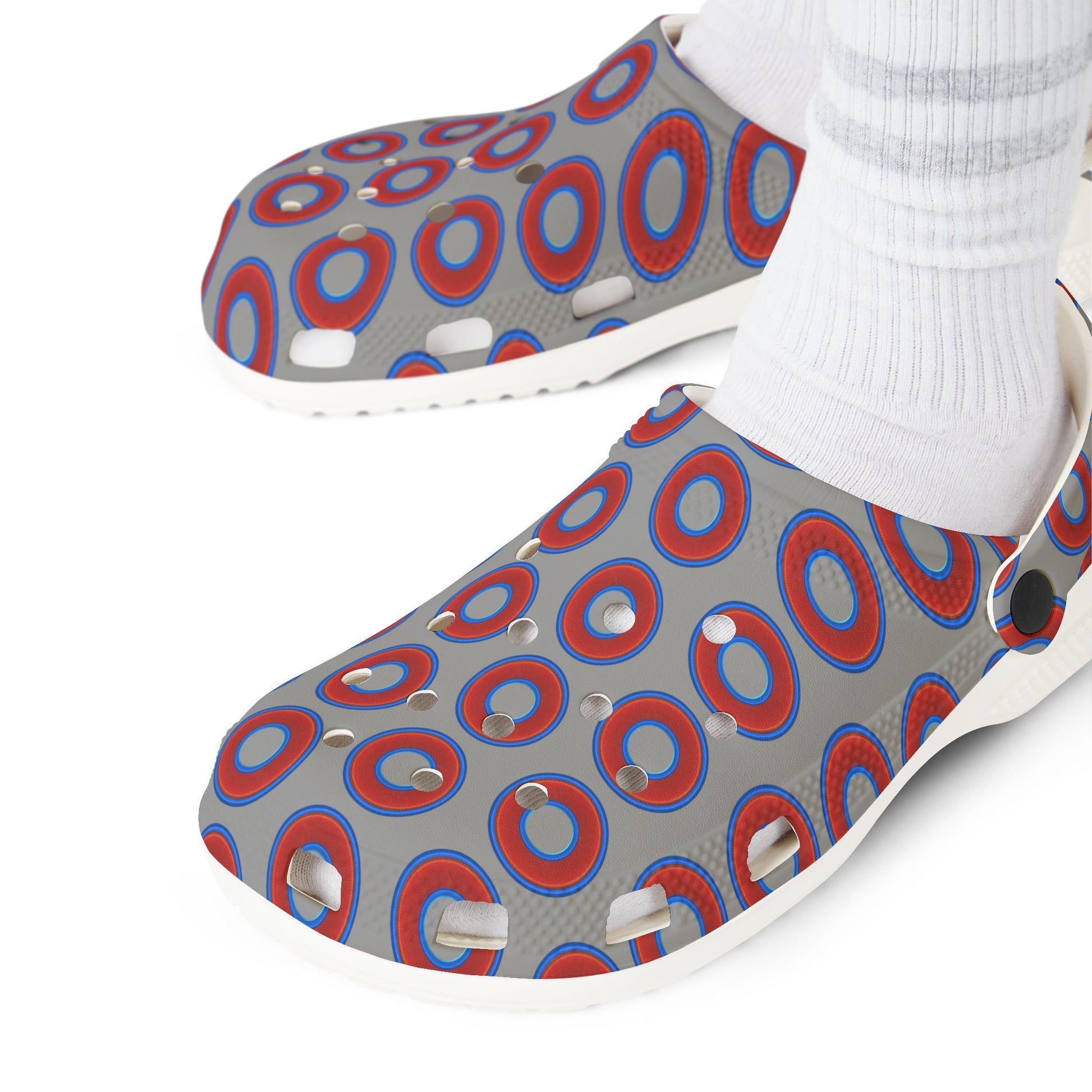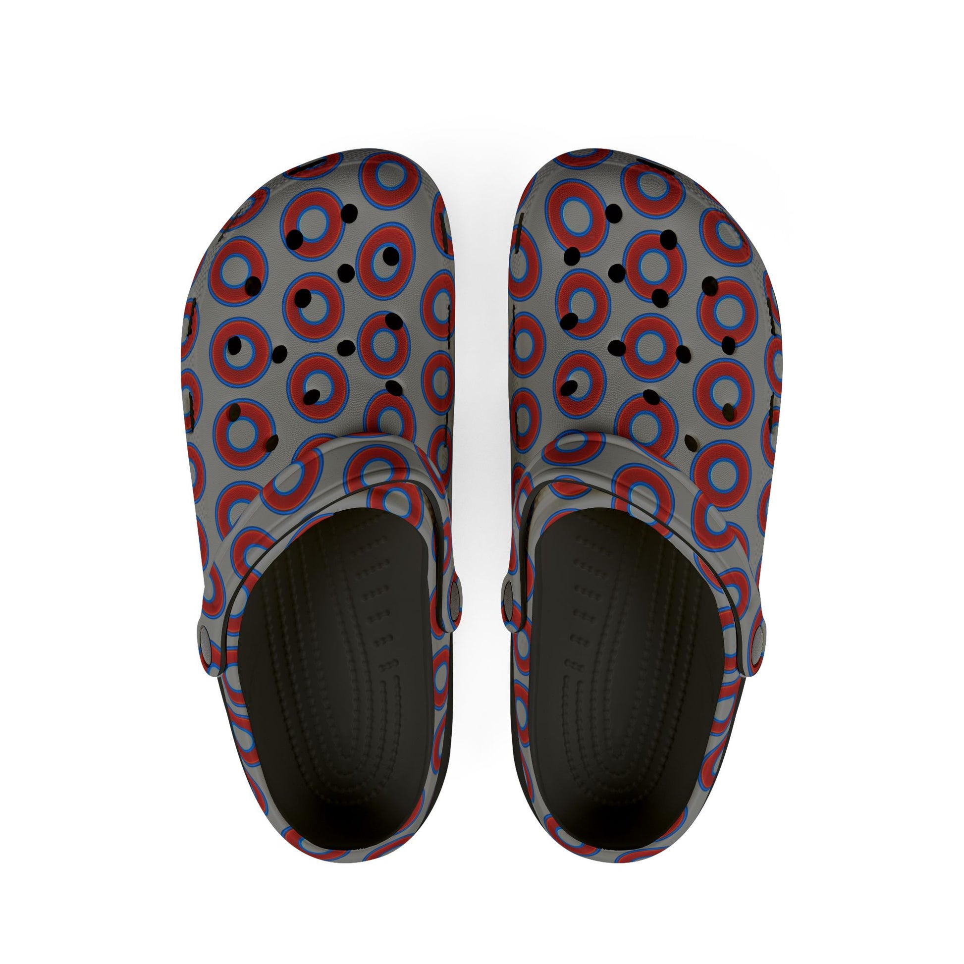 Spatchcocks - donut slip-on shoes - red rustic donuts w/gray background [unisex]