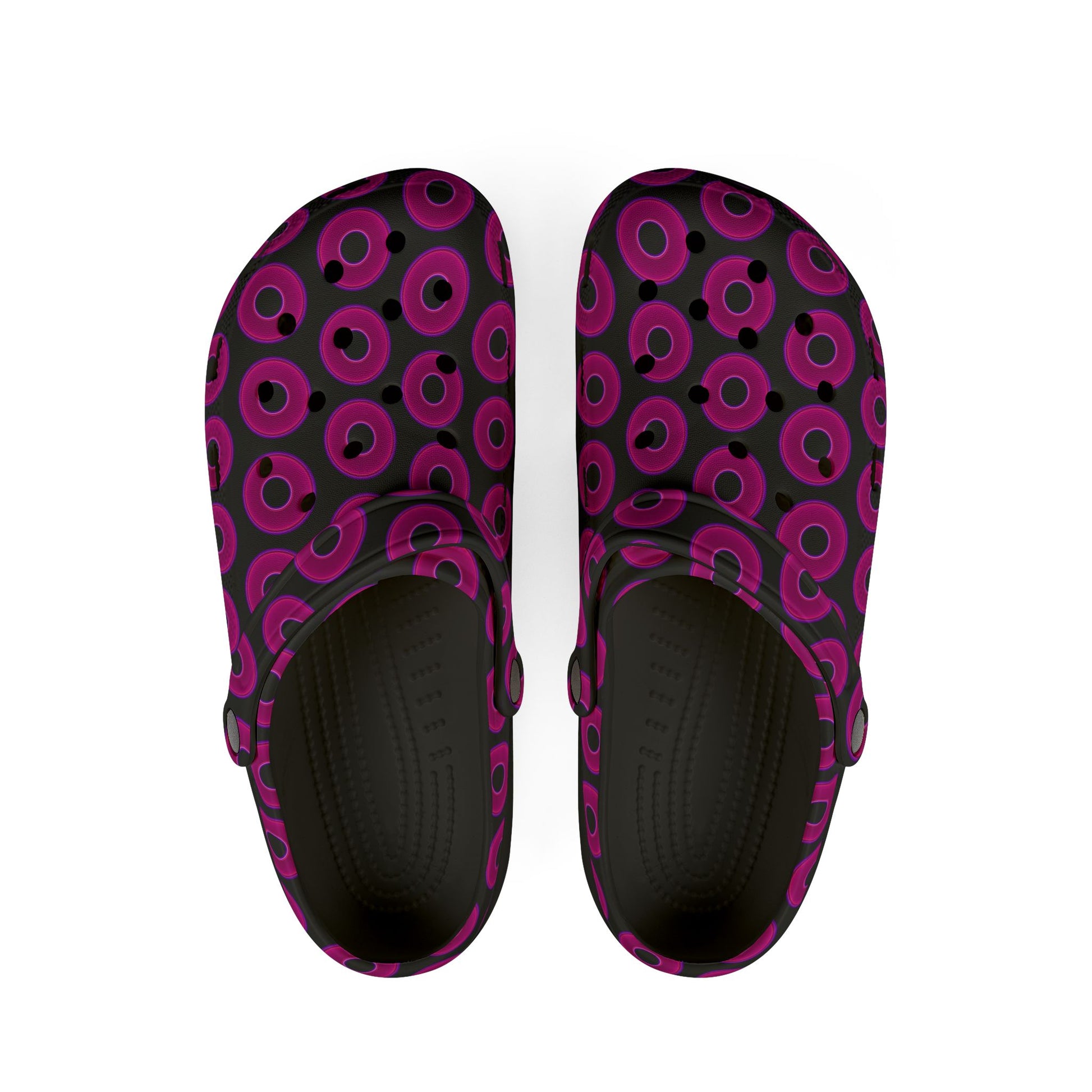 Spatchcocks - donut slip-on shoes - vivid magenta donuts w/black background [unisex]