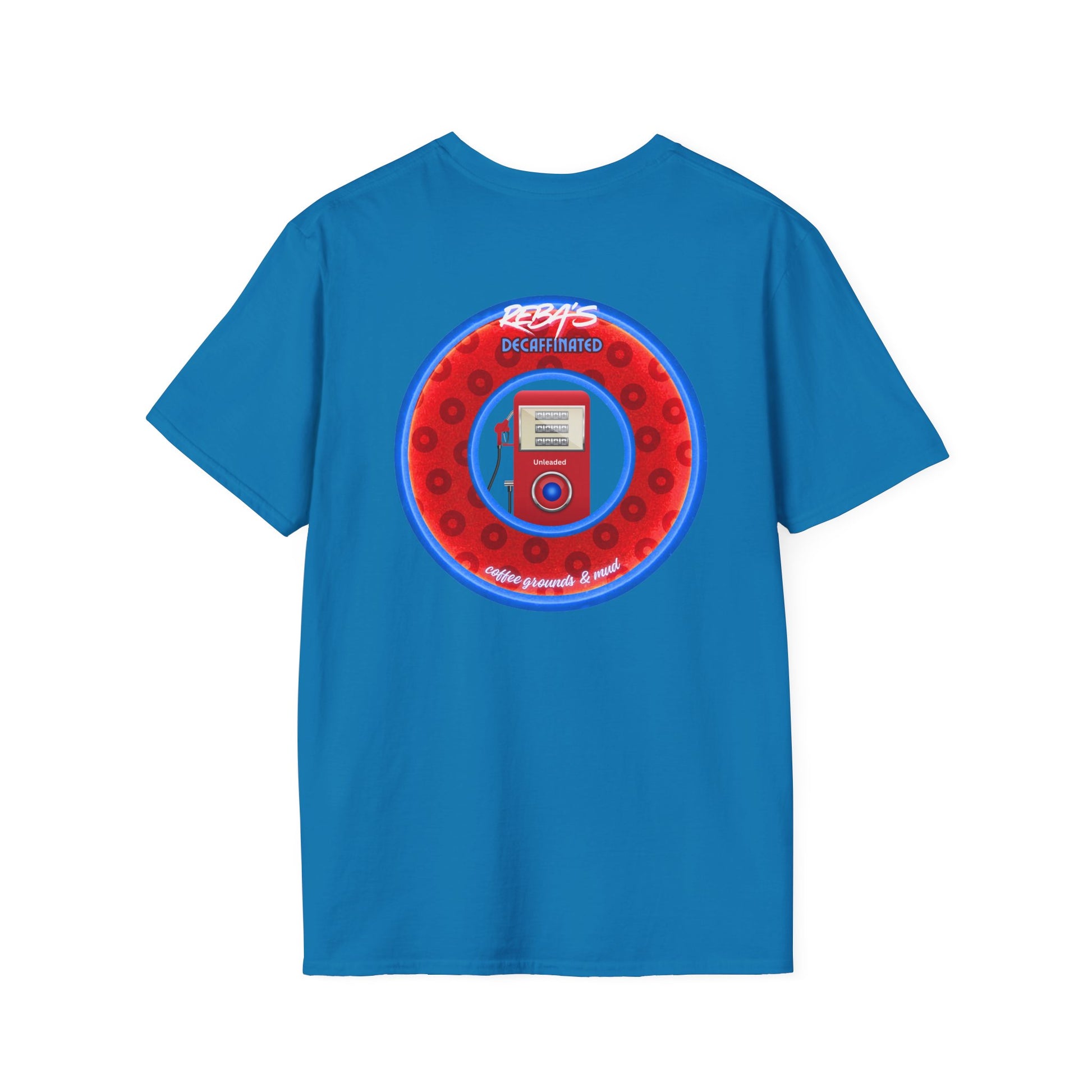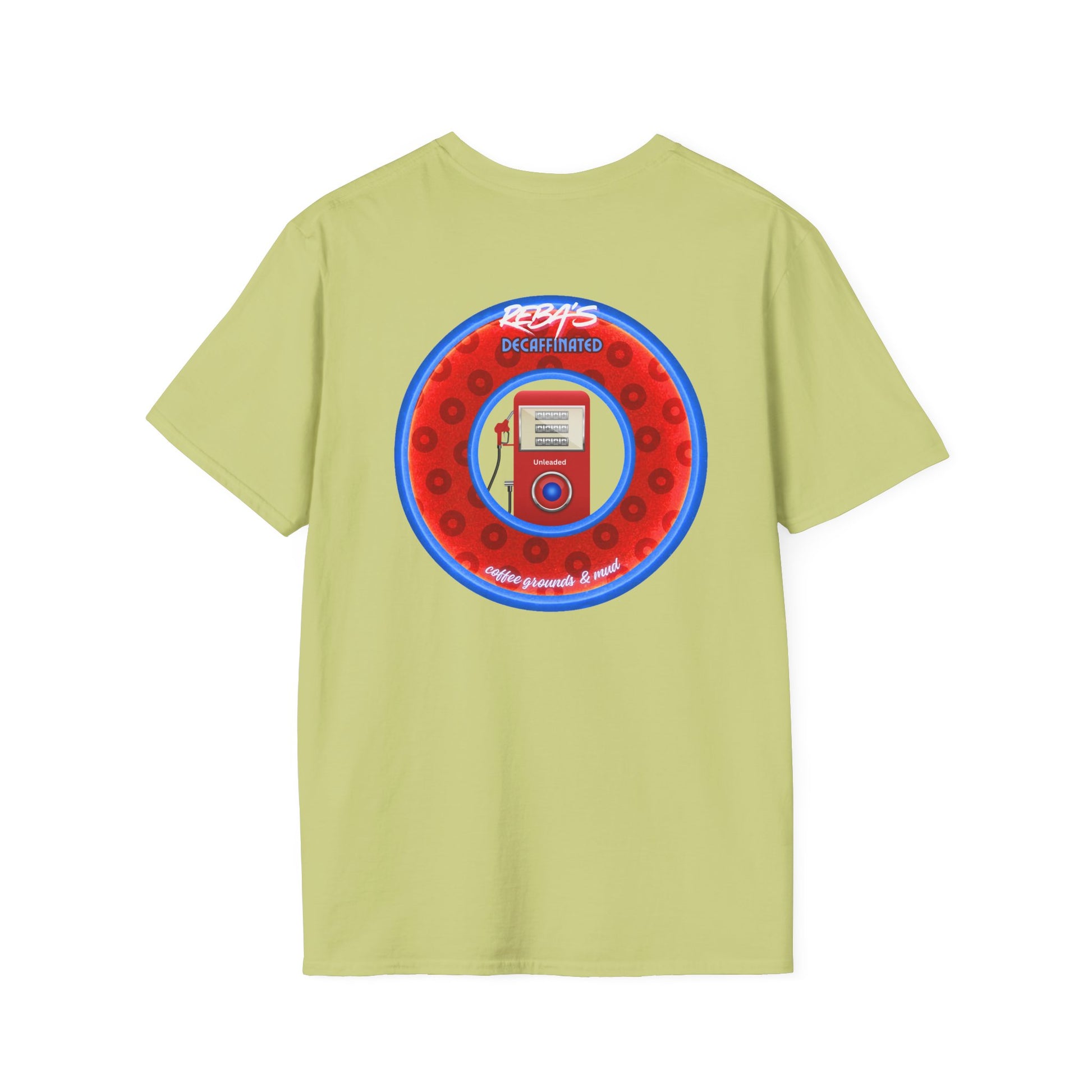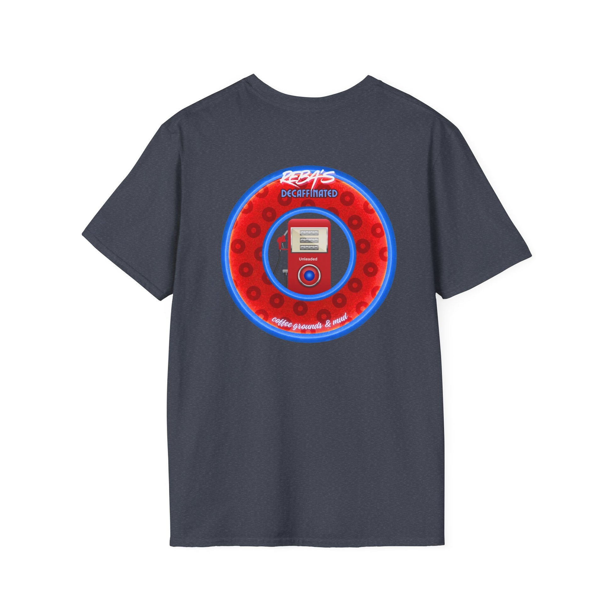 Coffee Traders Tee - Unisex Soft-Style - "Reba's Decaf: Coffee Grounds & Mud " - paradoxical donut - variant 2 - logo front/Reba back
