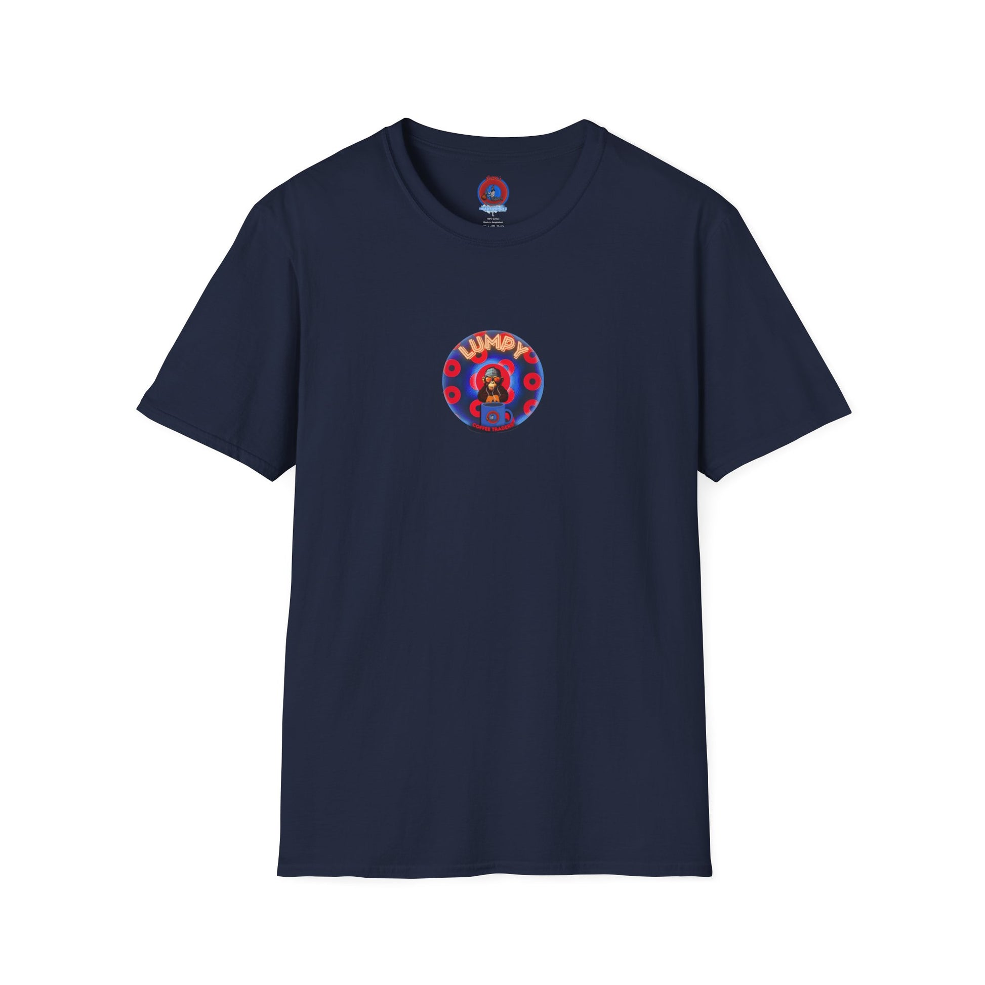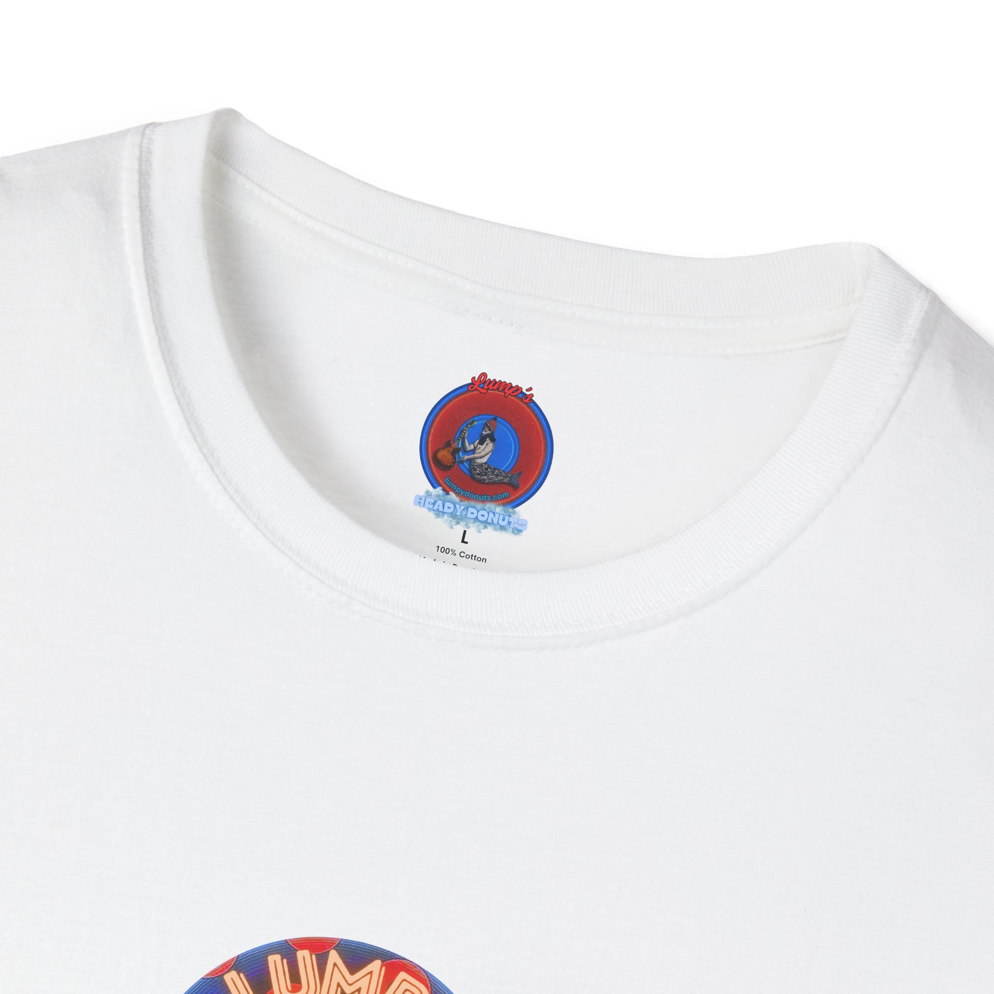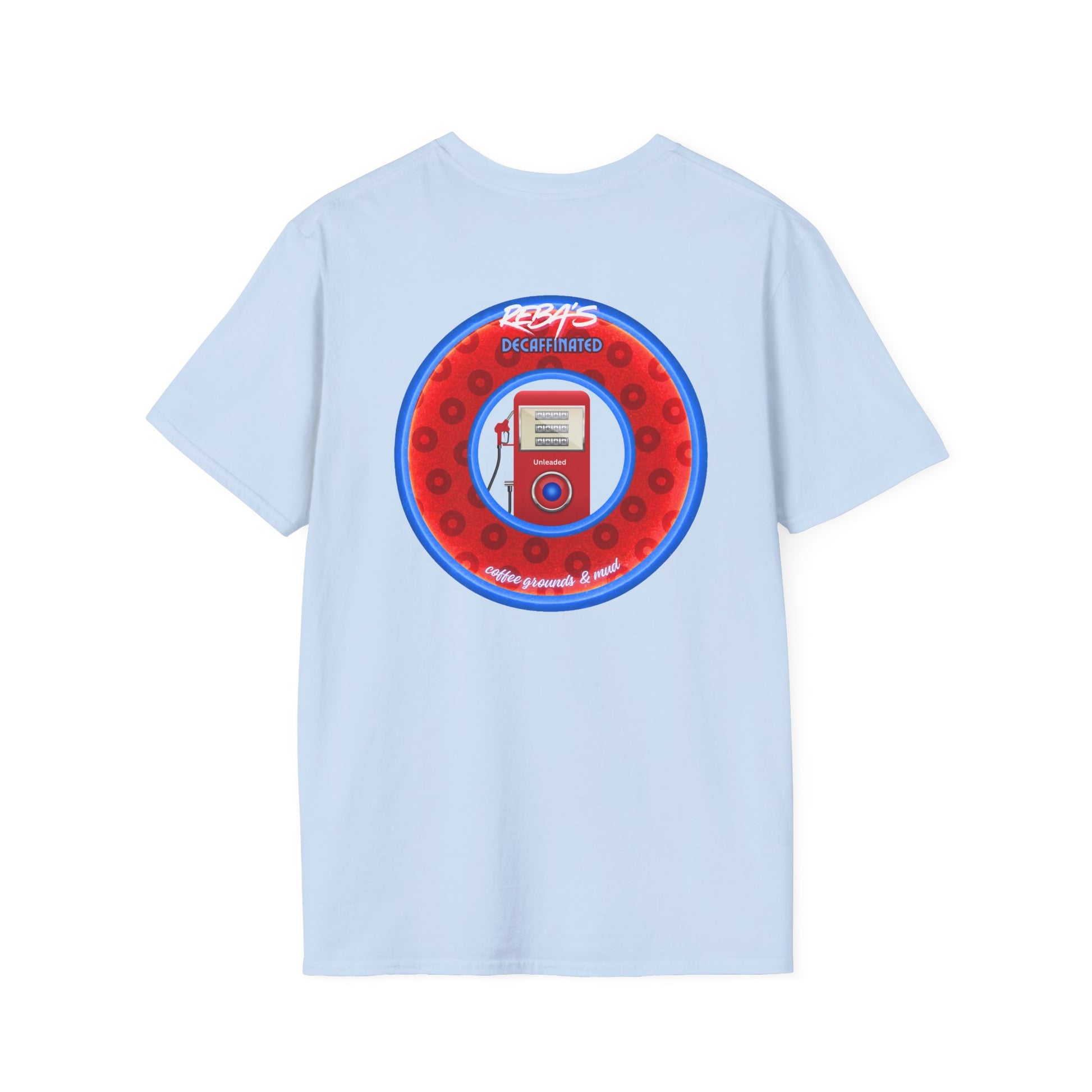 Coffee Traders Tee - Unisex Soft-Style - "Reba's Decaf: Coffee Grounds & Mud " - paradoxical donut - variant 2 - logo front/Reba back