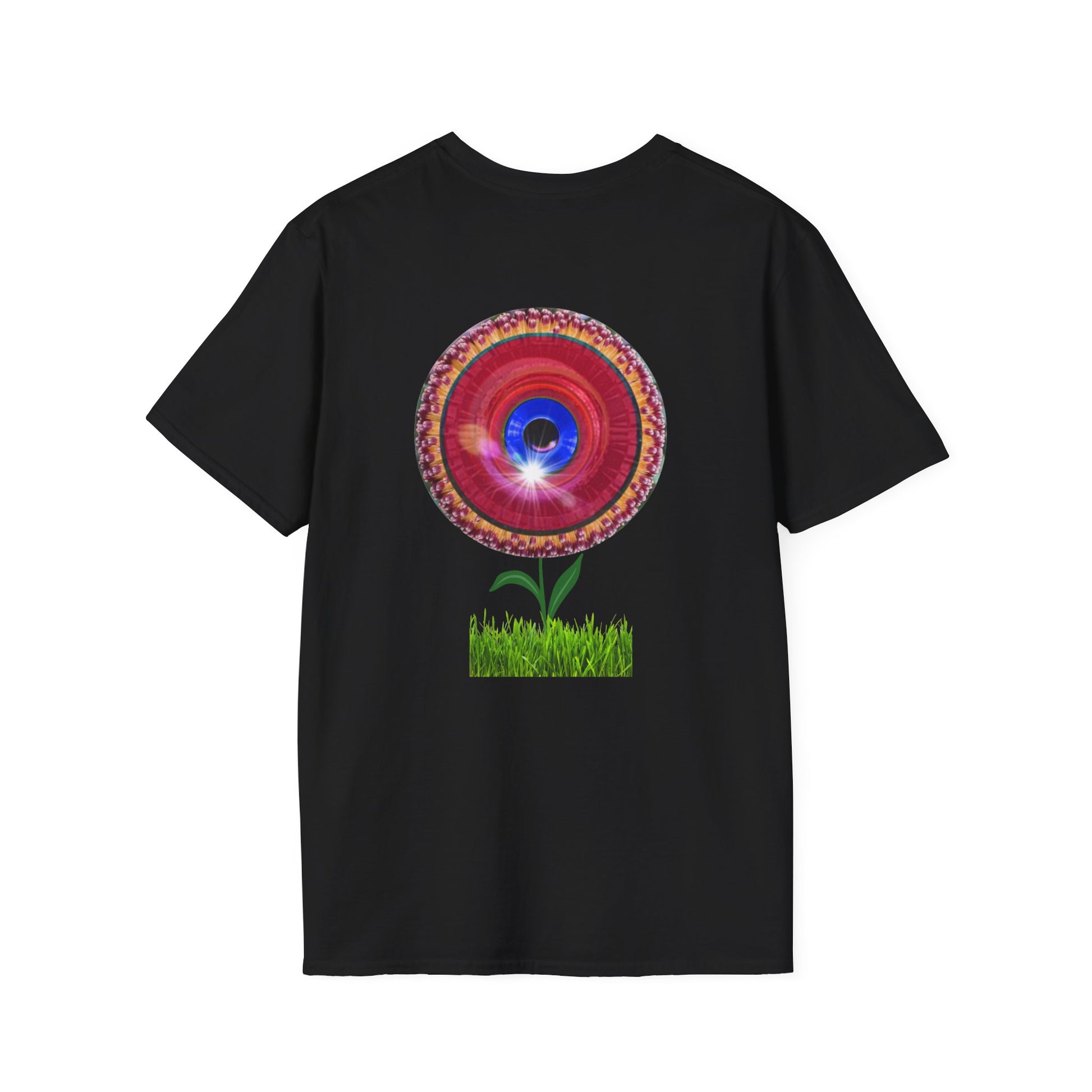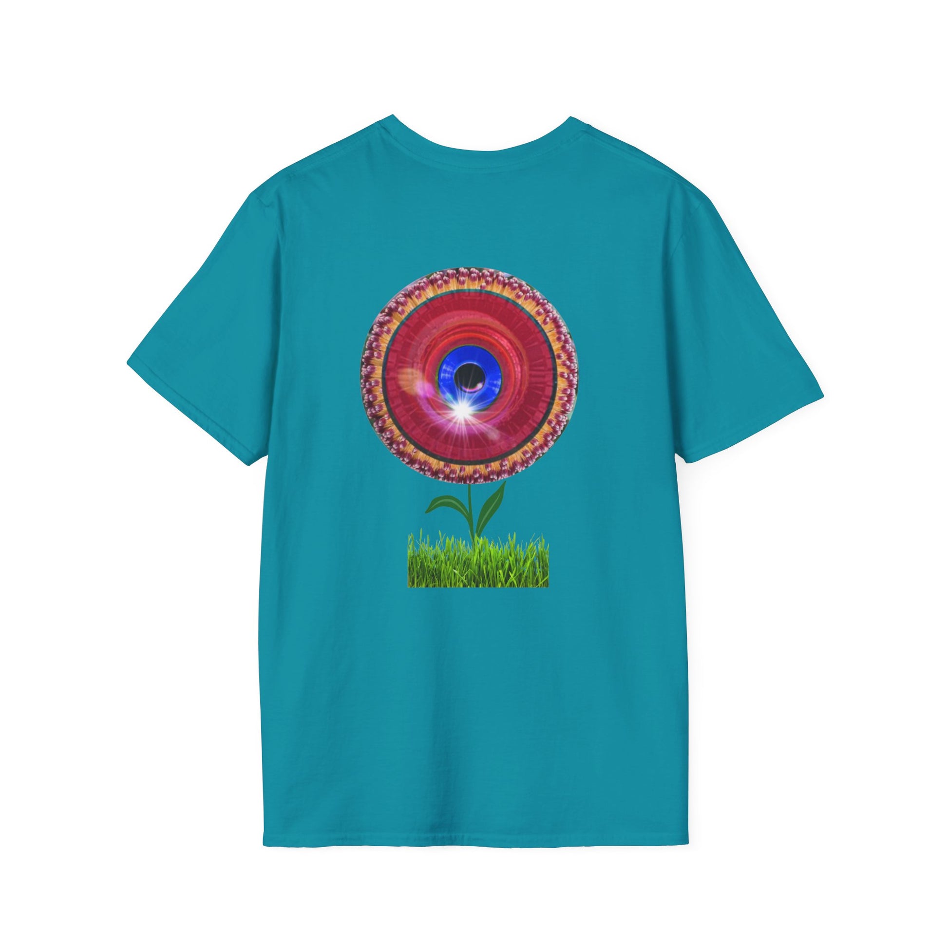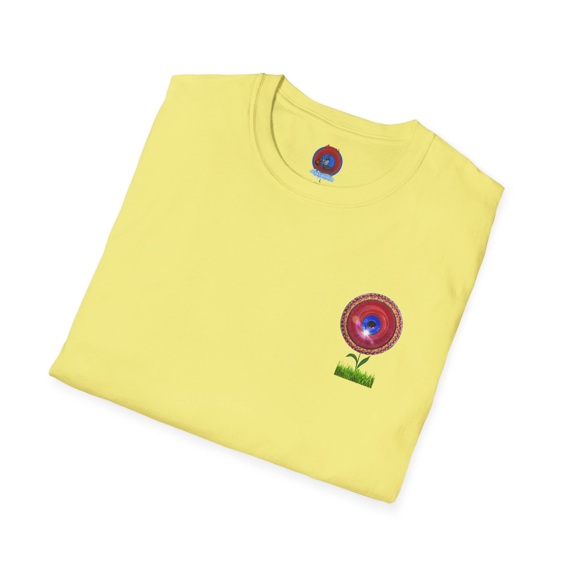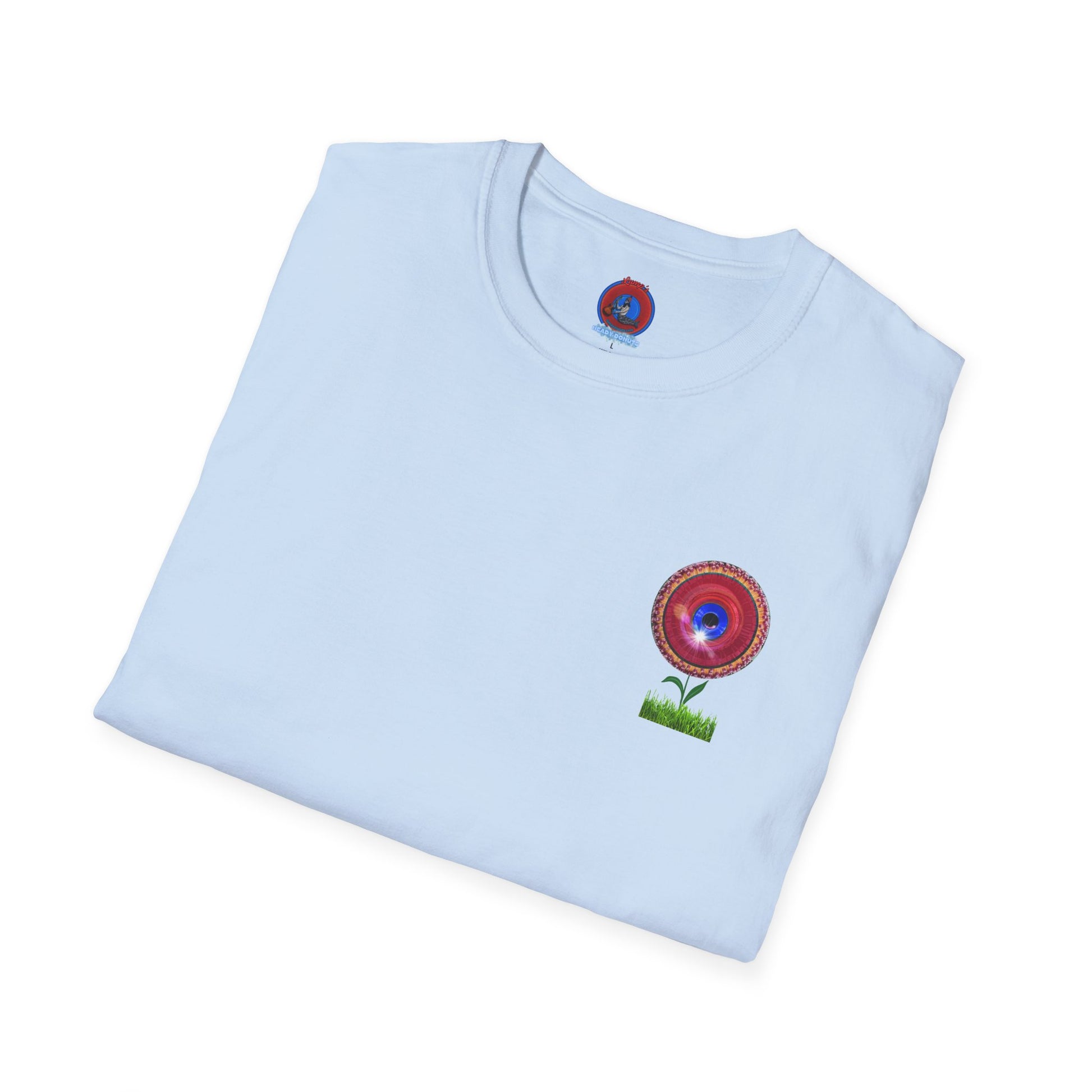 Classic Donut Tee - Unisex Soft-Style - "Smell the Donuts Outside on my Lawn" " variant 1 - blue donut on red donut/flower