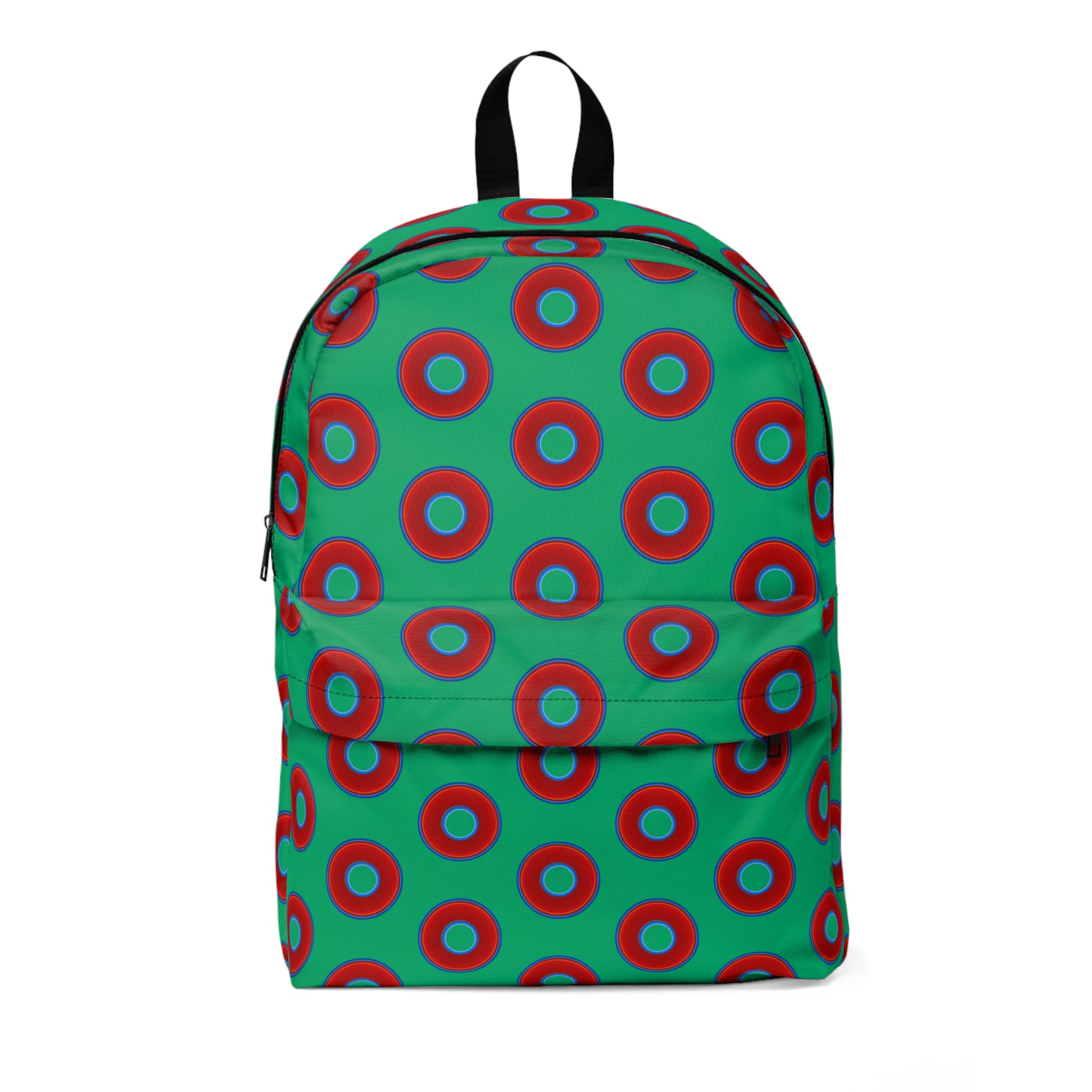 Donut Backpack - red vivid donuts w/jade green background