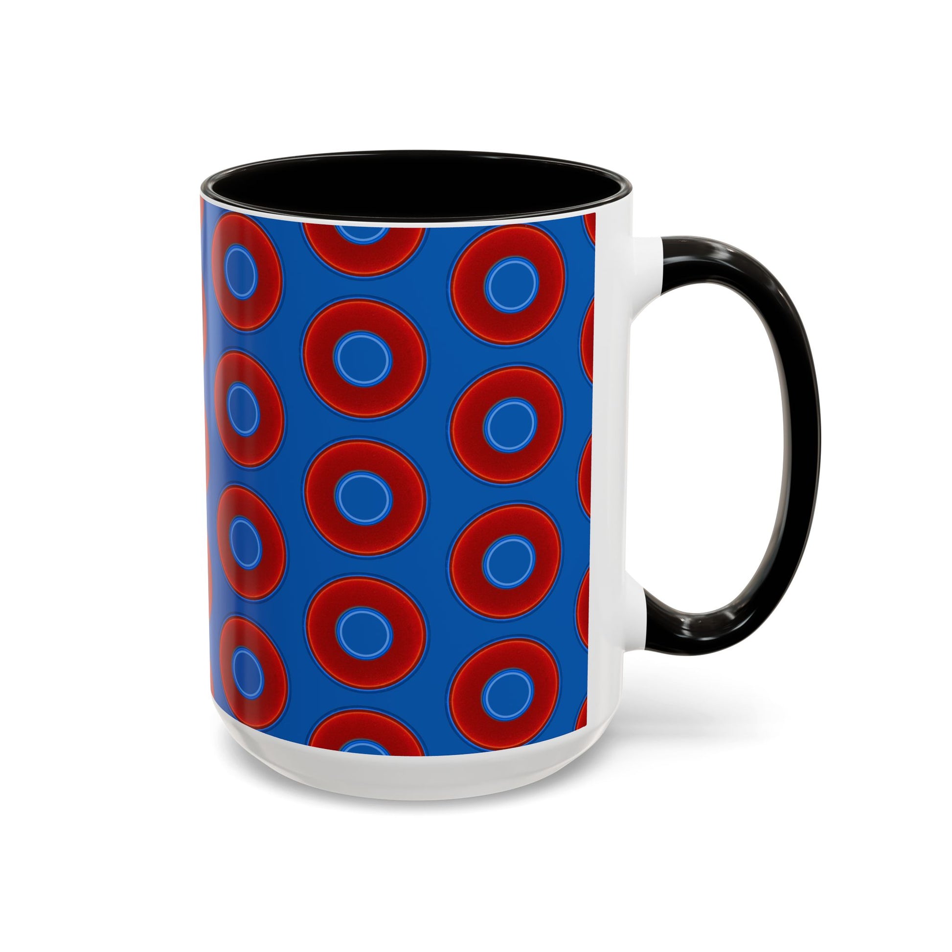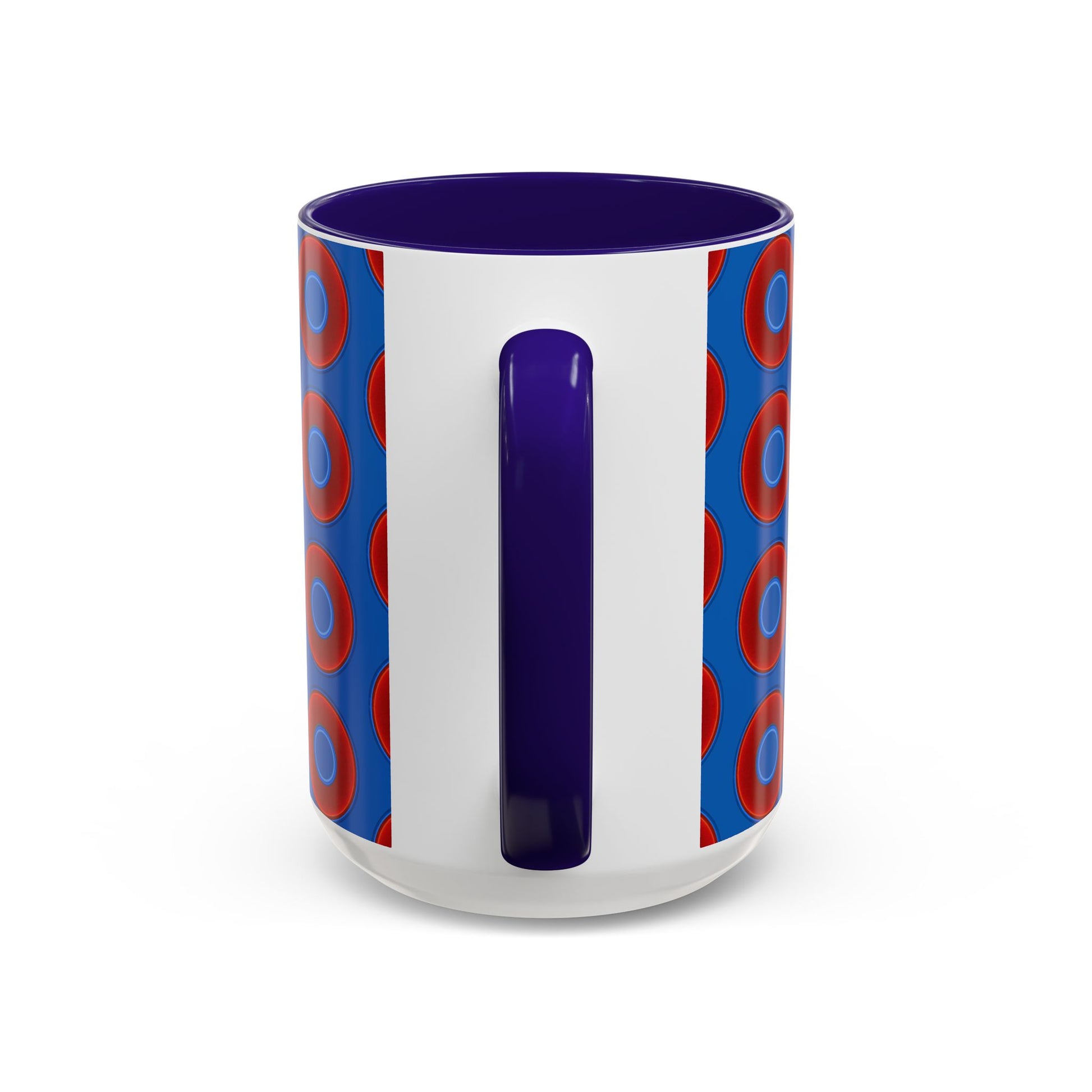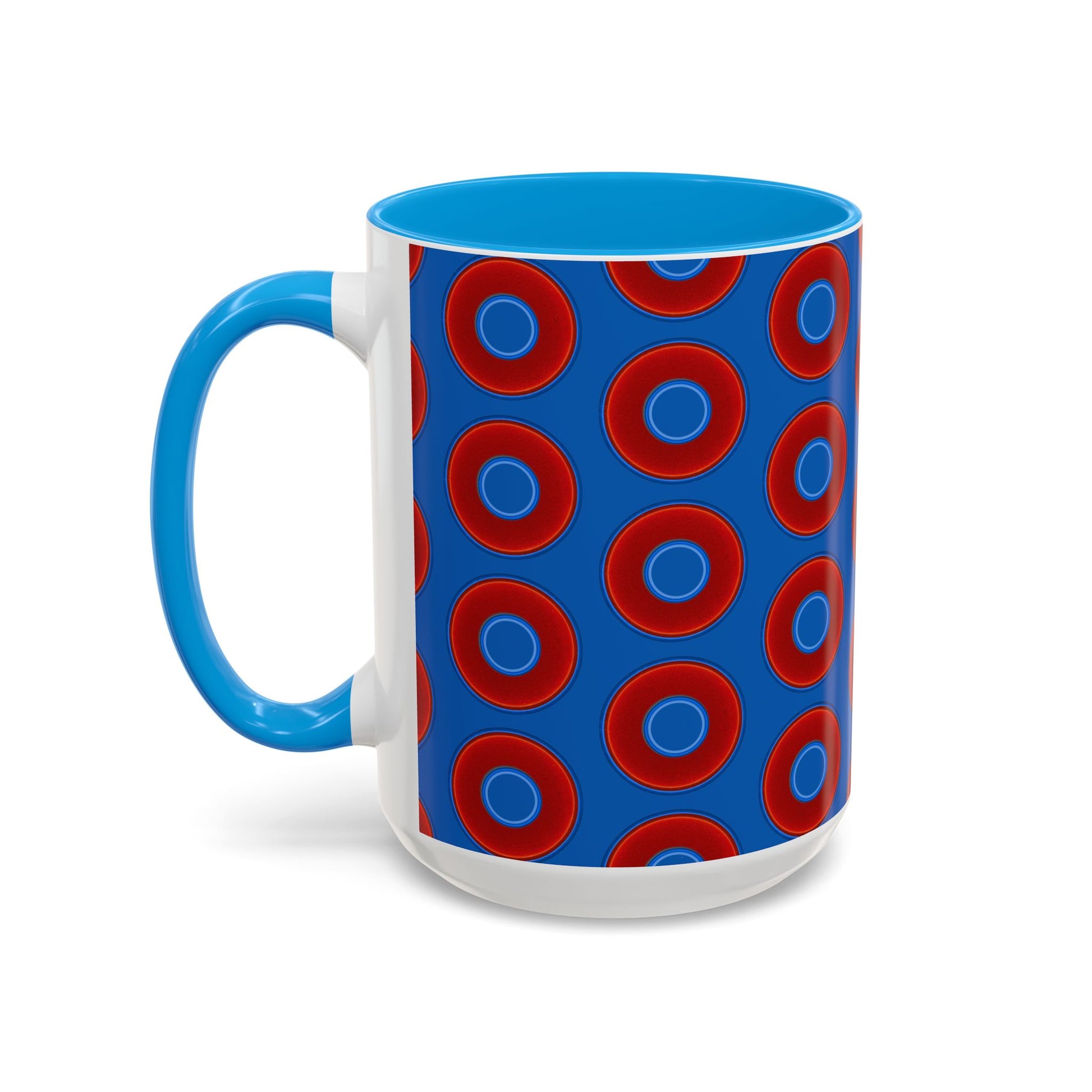 Lump's Grumpy Coffee Mug - vivid red donuts w/dark royal blue background