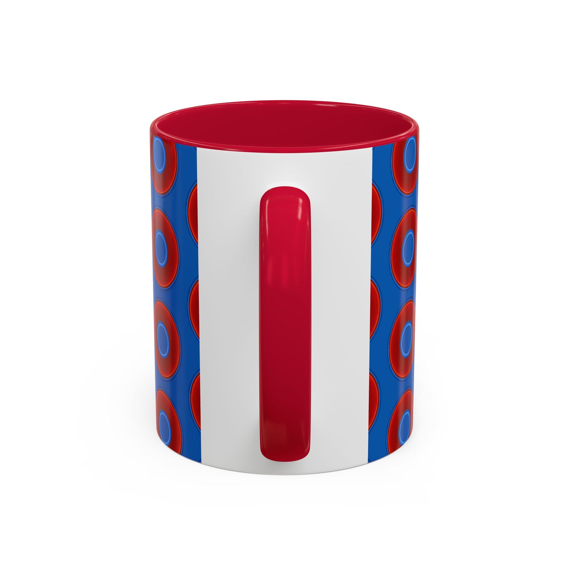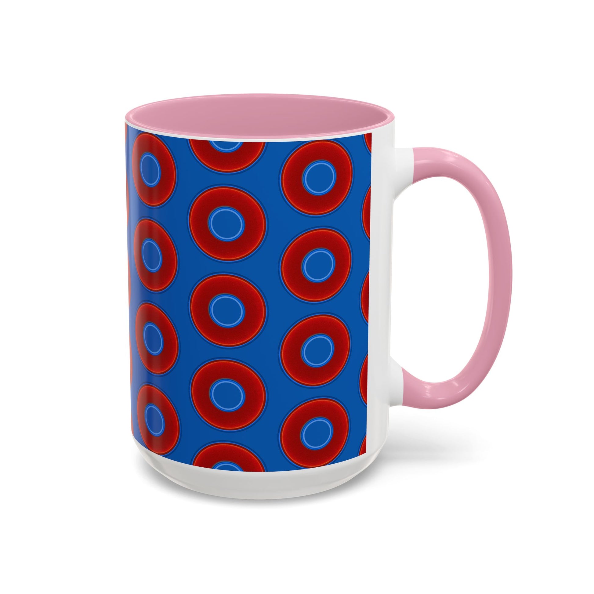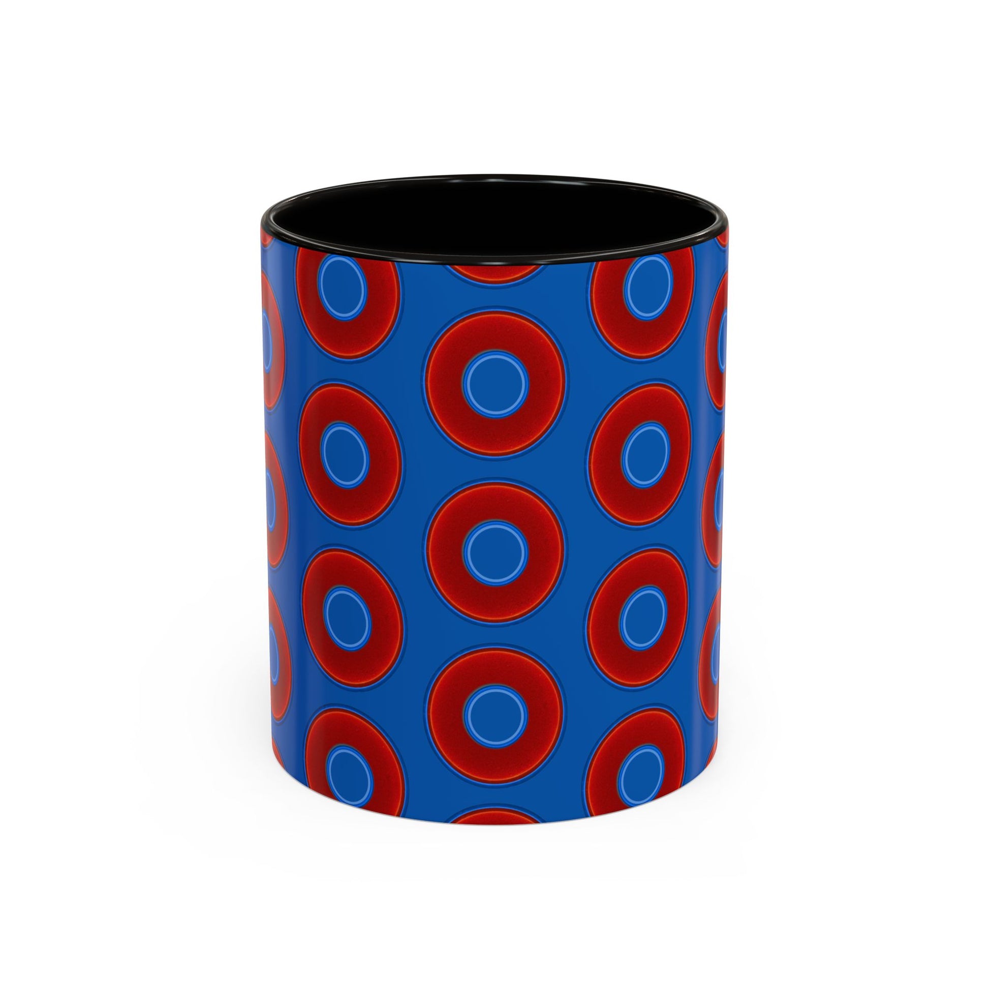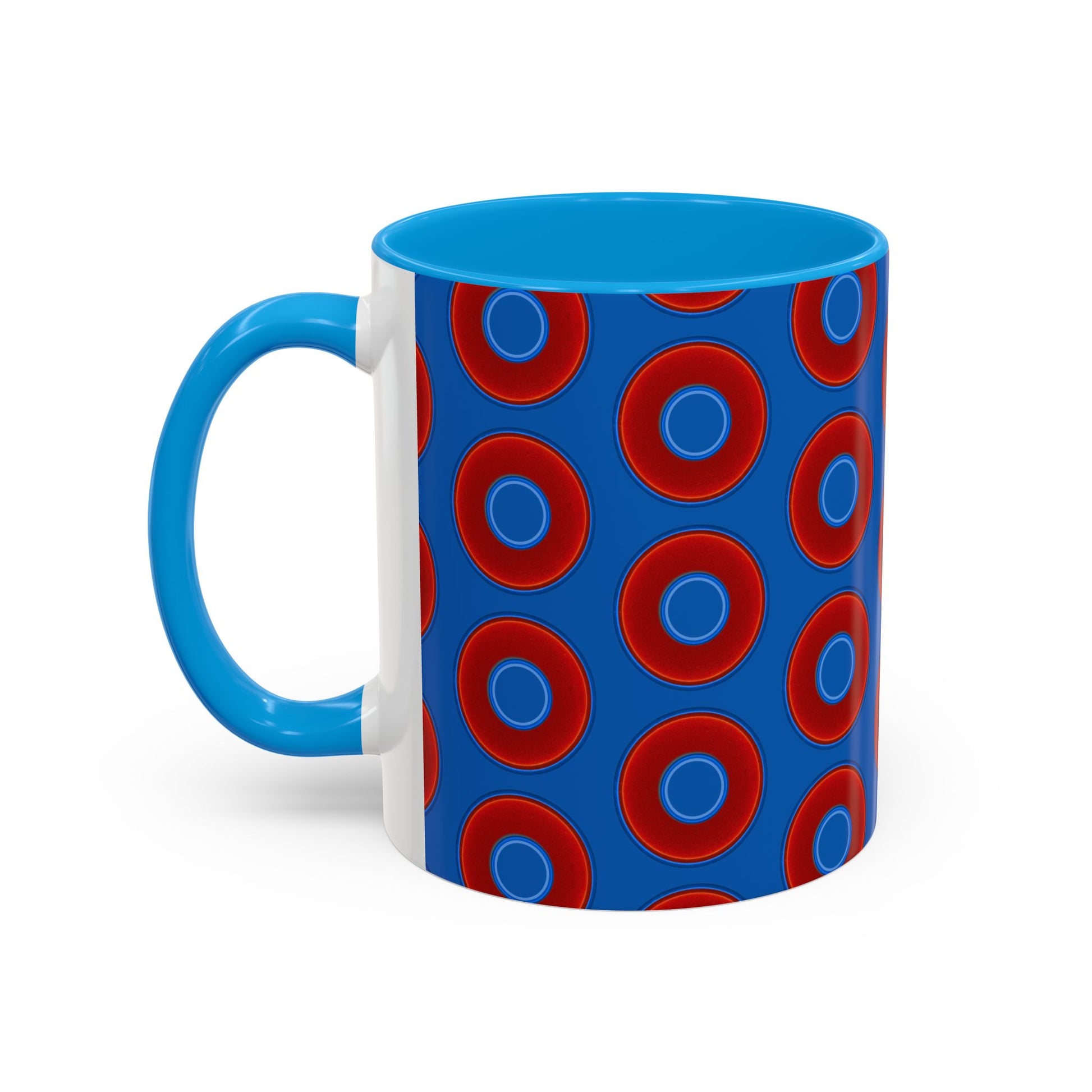 Lump's Grumpy Coffee Mug - vivid red donuts w/dark royal blue background