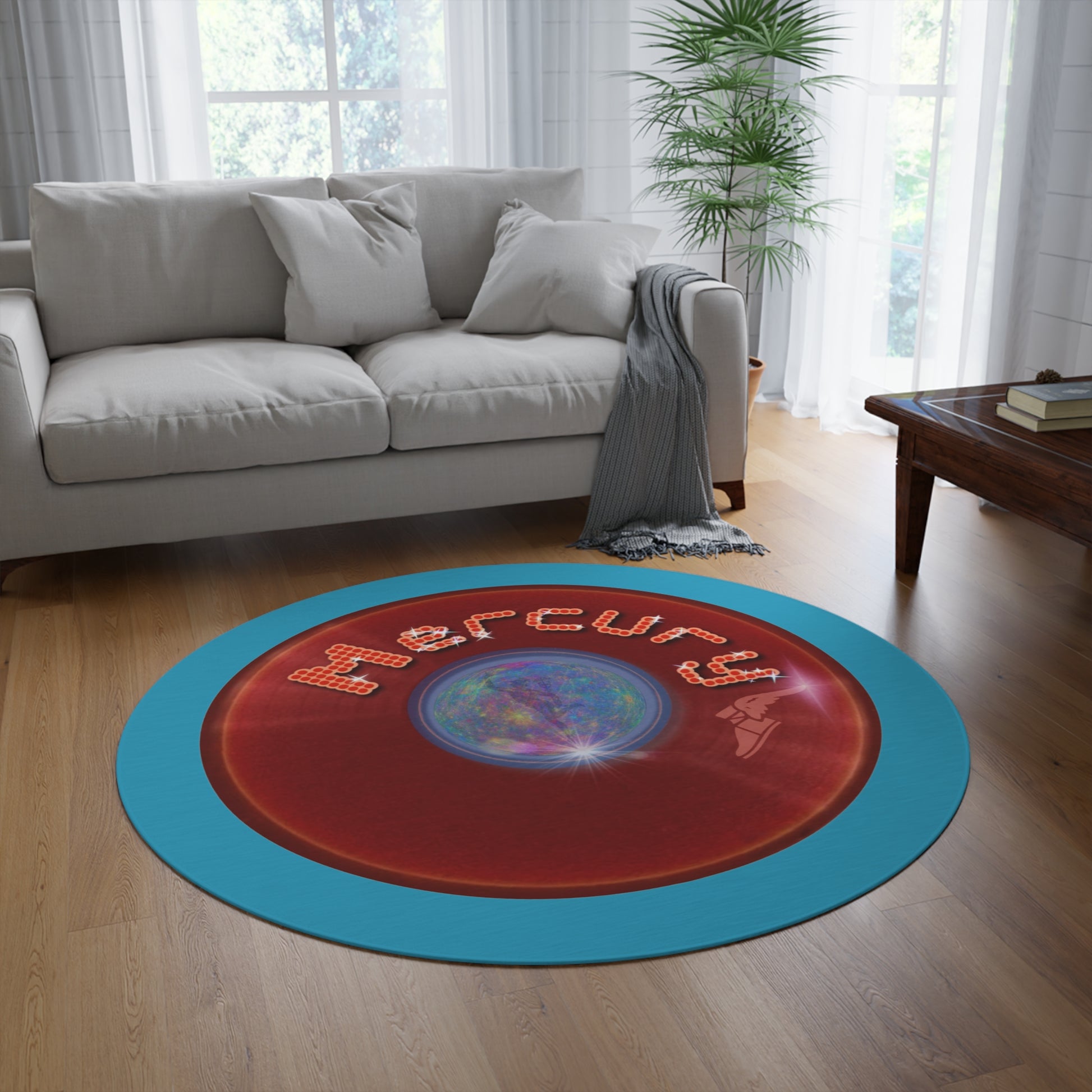 Round Room - 5 ft x 5 ft Lumpy Donut Rug - "Donut Rug of the Gods" - vivid red donut w/turquoise background - variant 2
