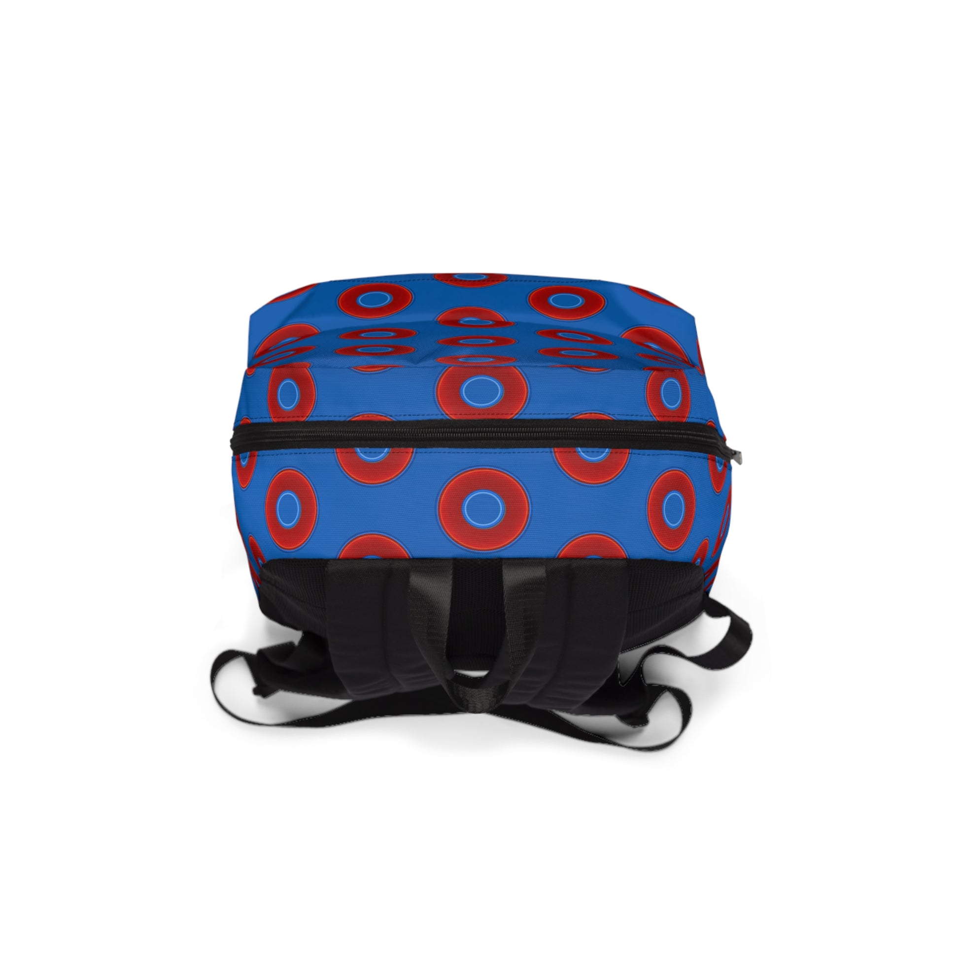 Donut Backpack - red vivid donuts w/dark royal blue background