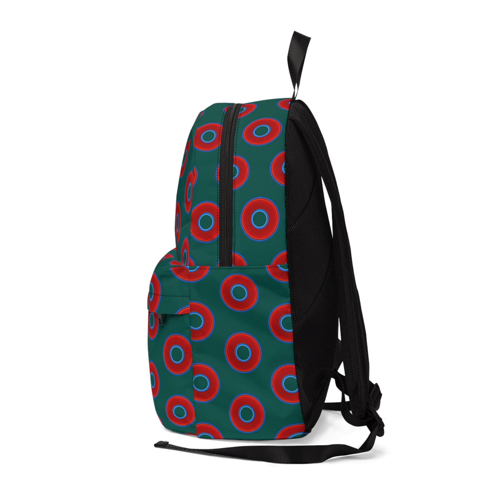 Donut Backpack - red vivid donuts w/dark grayish green background
