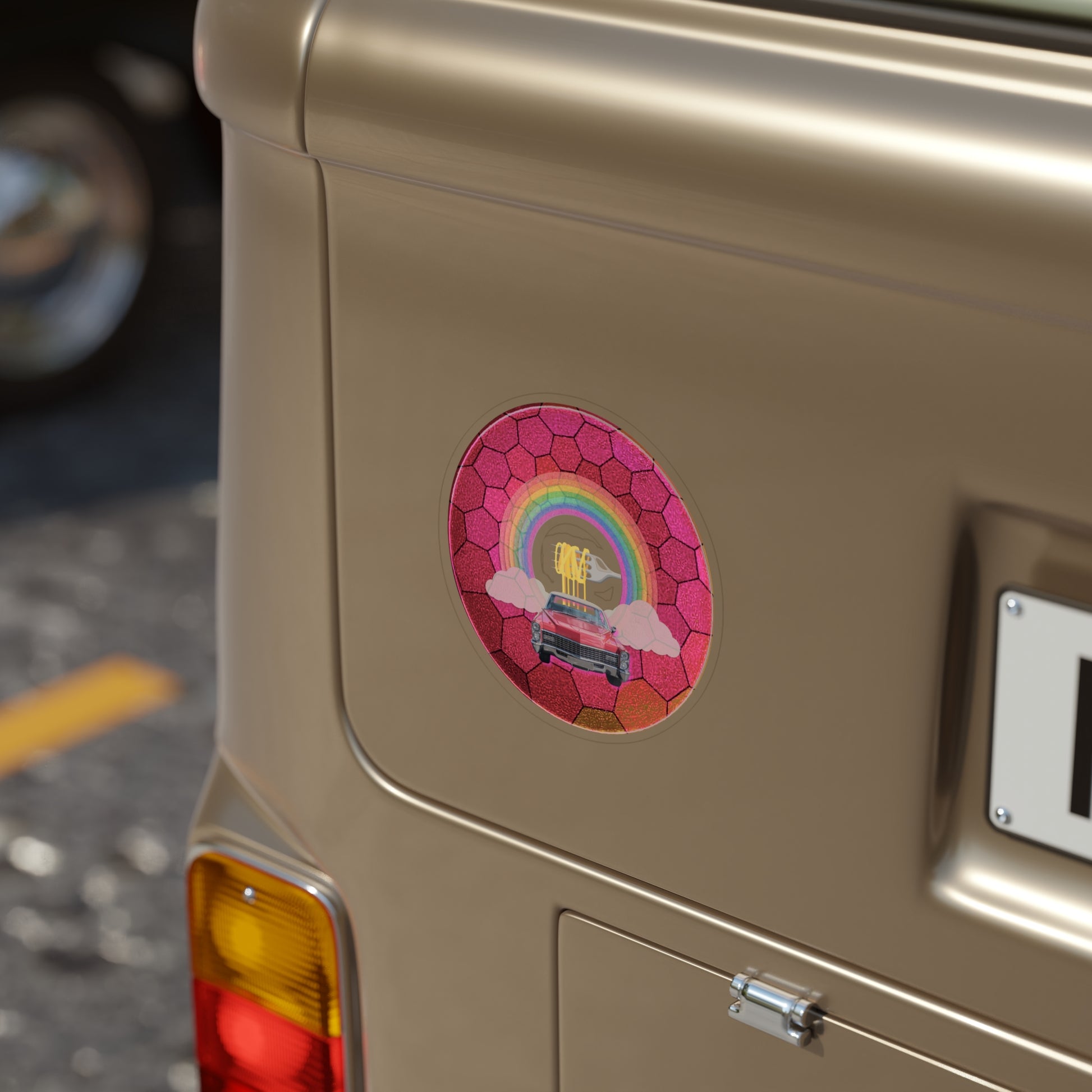 Donut Bumper/Outdoor Sticker - "Spaghetti Incident in my Caddy" - series 1.0 - variant - 3 - red caddy on magenta hexadonut - [Die-Cut] 6"x 6"