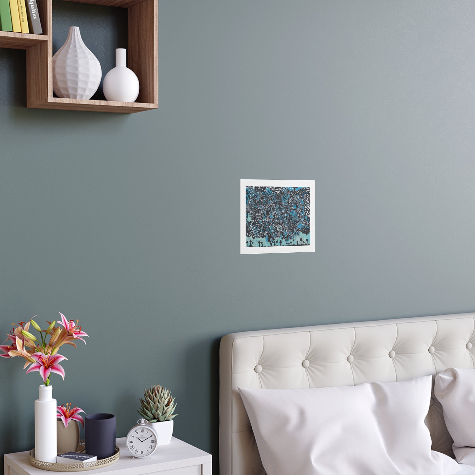 A detailed psychedelic art piece in black, white, and blue colors. The top portion features intricate maze-like patterns with swirling lines and abstract shapes in black and white, with red accents throughout. The central area contains a detailed skull-like figure rendered in black and white with red highlights. The bottom section shows a row of small mushroom silhouettes in black against a pink textured background. The mushrooms are arranged in a repeating pattern along the horizon line. The entire artwork has a complex, interconnected design with flowing curves and geometric patterns. The red color is used primarily as accent throughout the piece, creating contrast against the black and white elements. The artwork has a trippy, otherworldly quality with its mix of organic and geometric shapes. The texture of the piece is created through a combination of solid fills, hatching, and stippling techniques.