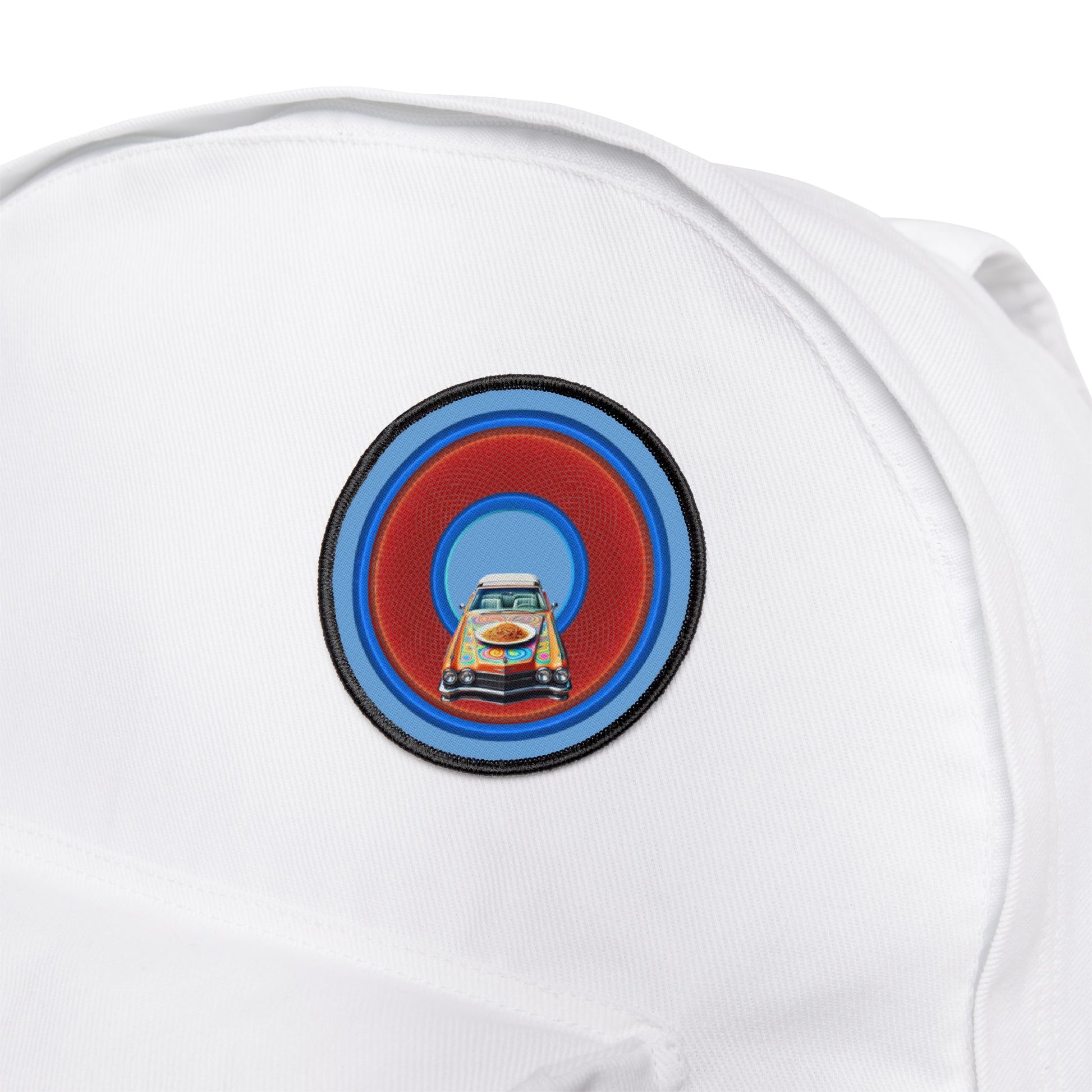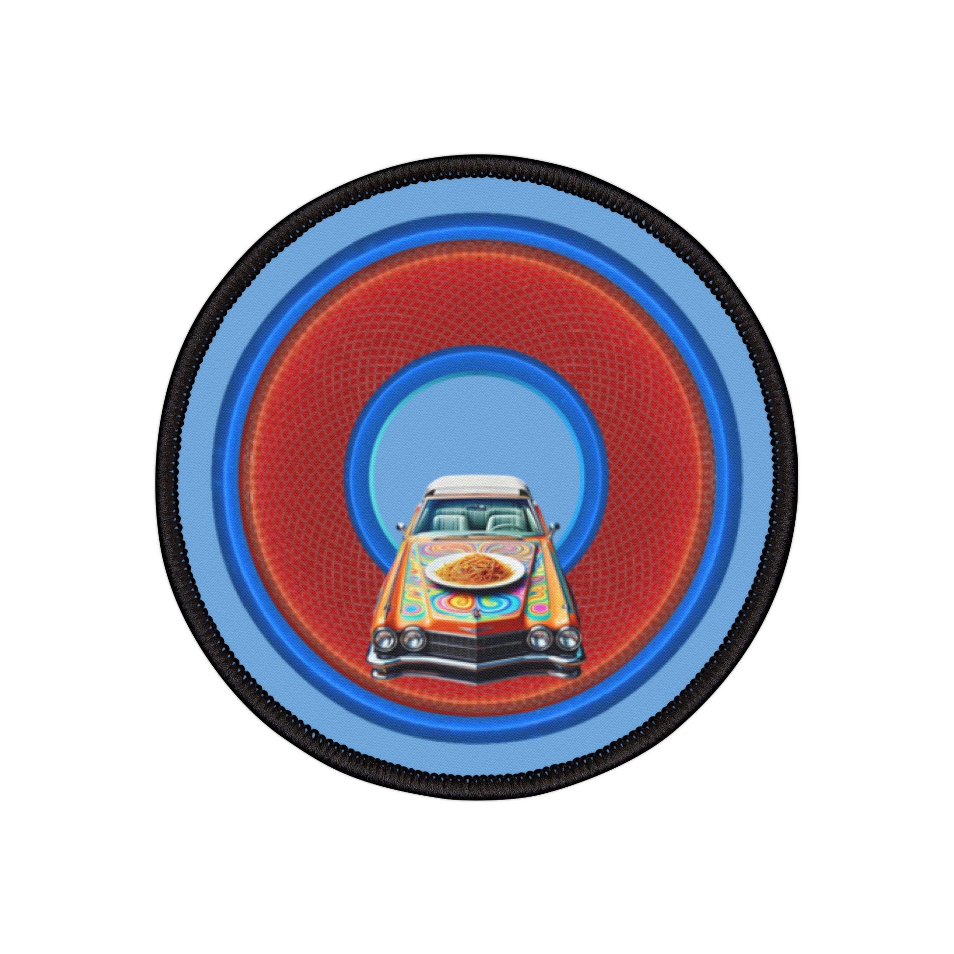 Iron-On Donut Patch - "Caddy Spaghetti Incident Donut Patch" - rustic red/blue donut - variant 1