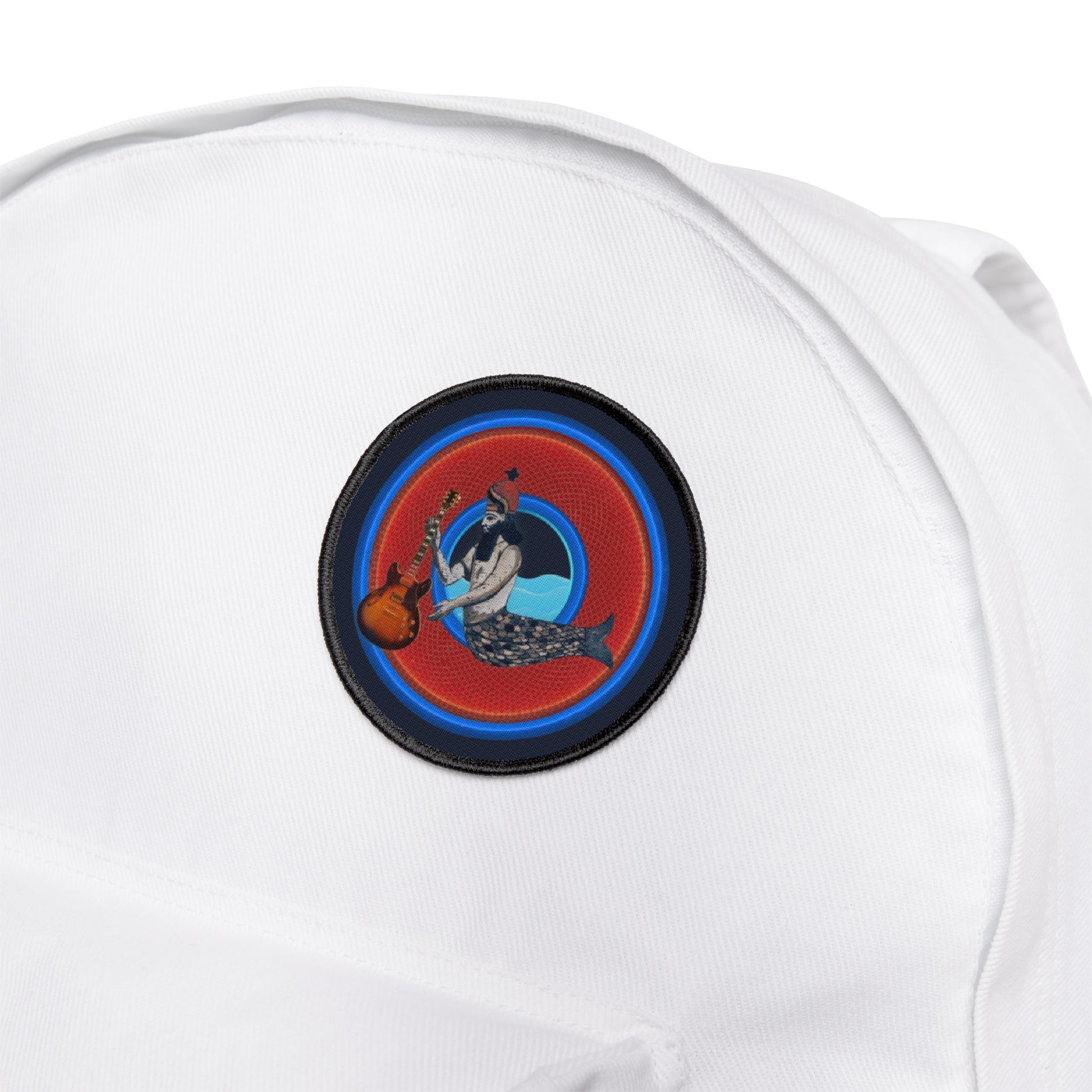 Iron-On Donut Patch - "Doggone Dagon Donut - The 1st Rockstar" - rustic red/blue donut - variant 2