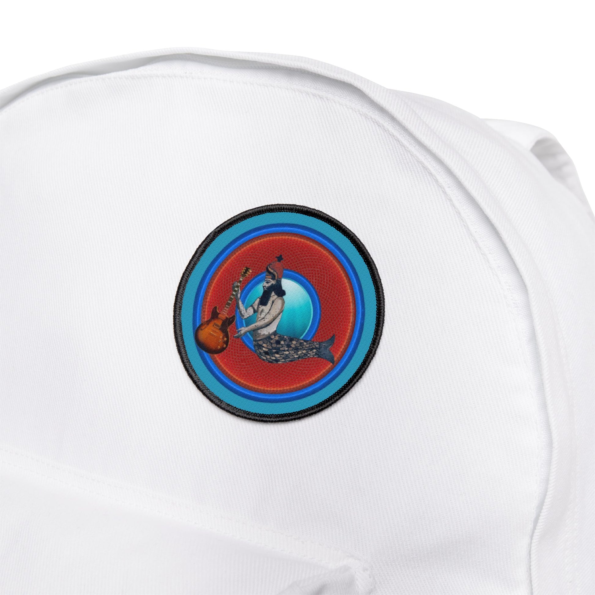 Iron-On Donut Patch - "Doggone Dagon Donut - The 1st Rockstar" - rustic red/blue donut - variant 3