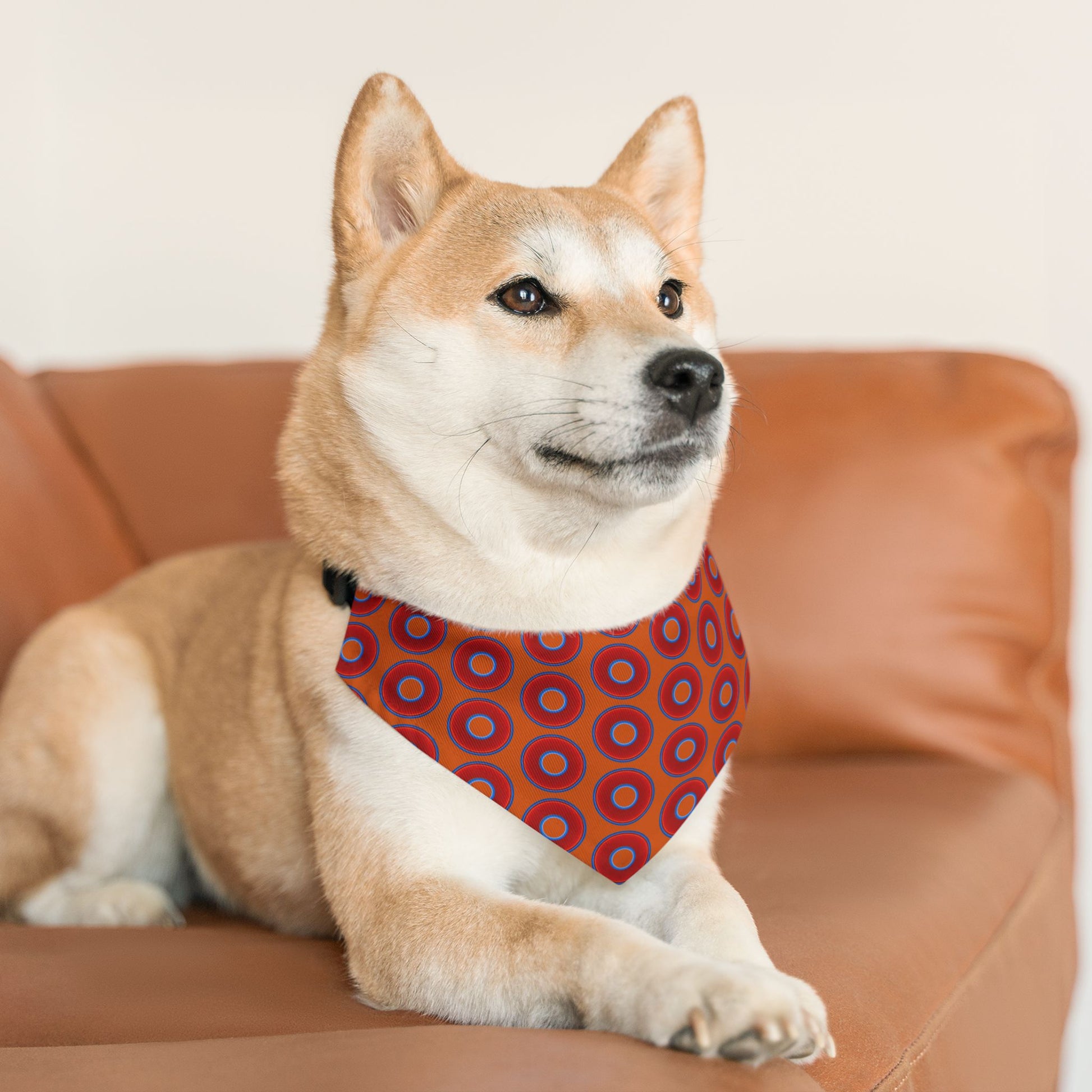 Jim's Lumpy Bandana Pet Collar - vivid red donuts w/dark orange backgound