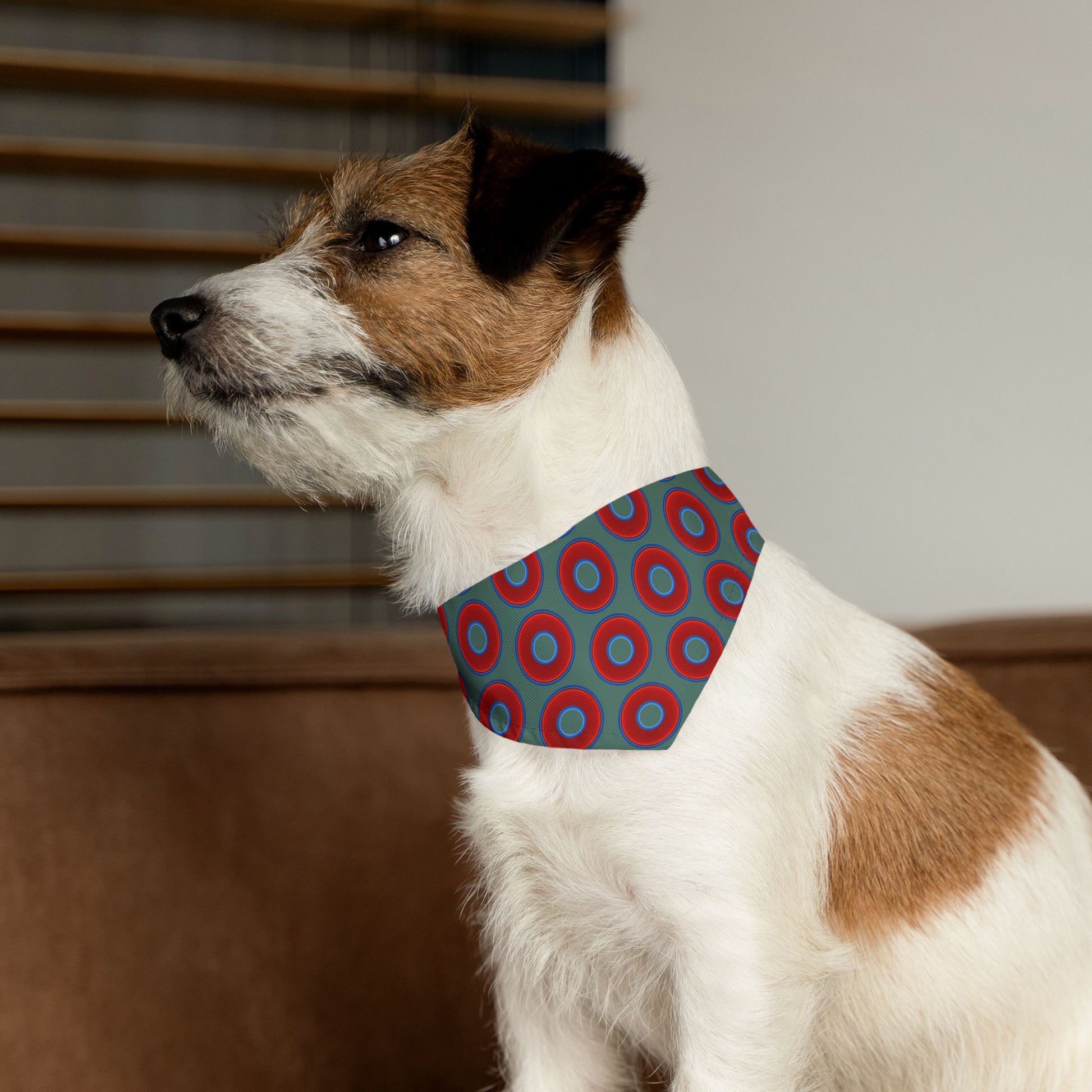 Jim's Lumpy Bandana Pet Collar - vivid red donuts w/Fenway green background