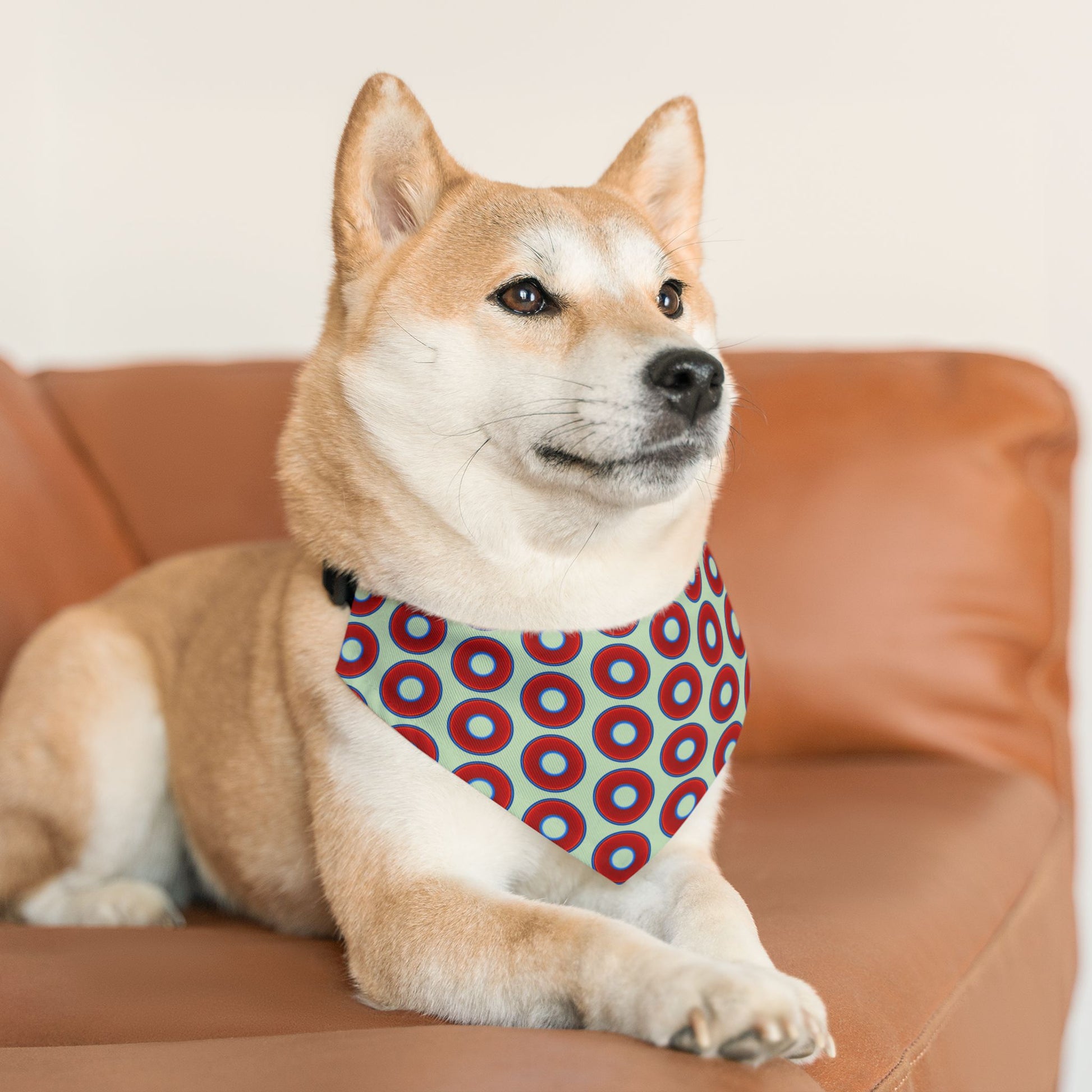 Jim's Lumpy Bandana Pet Collar - vivid red donuts w/seafoam background