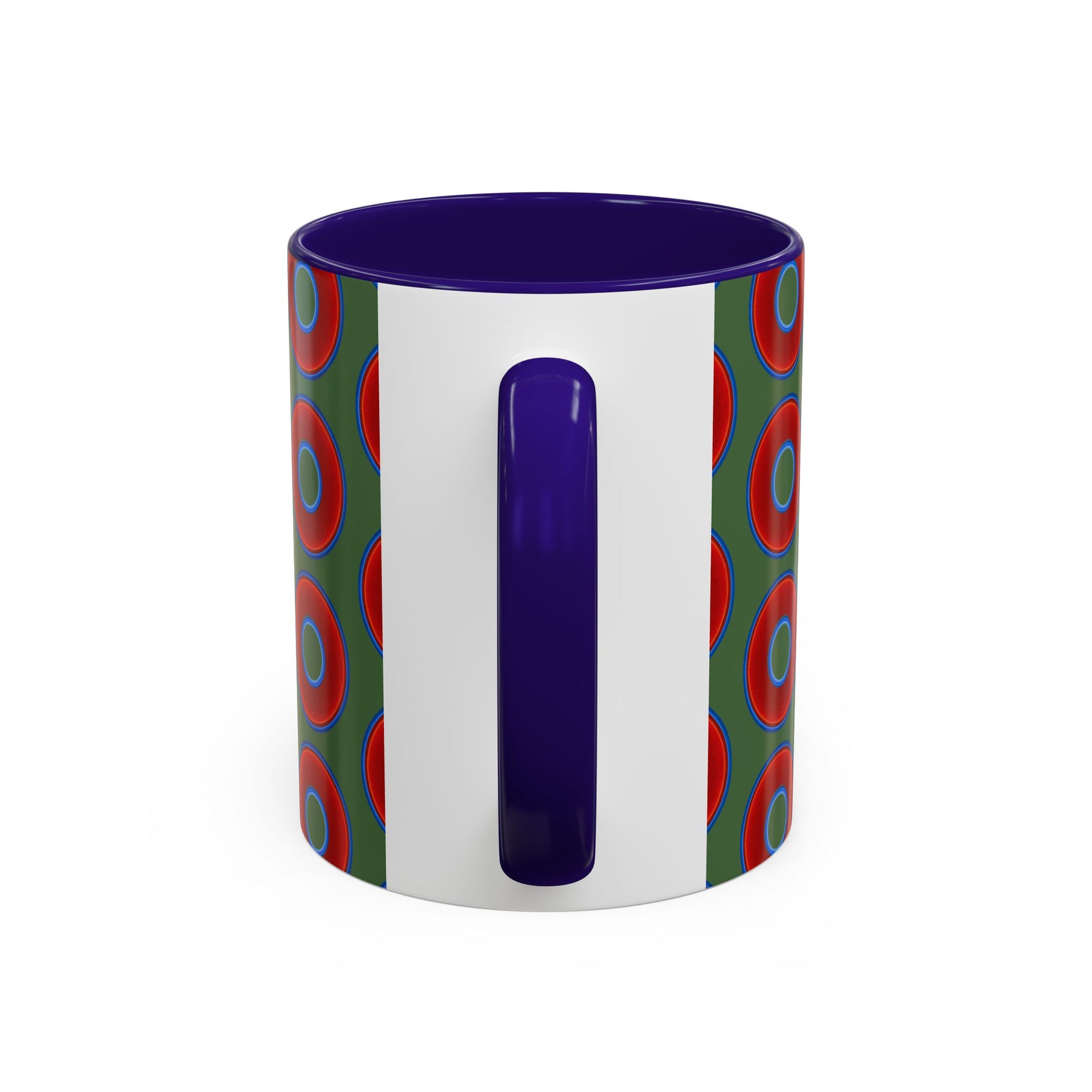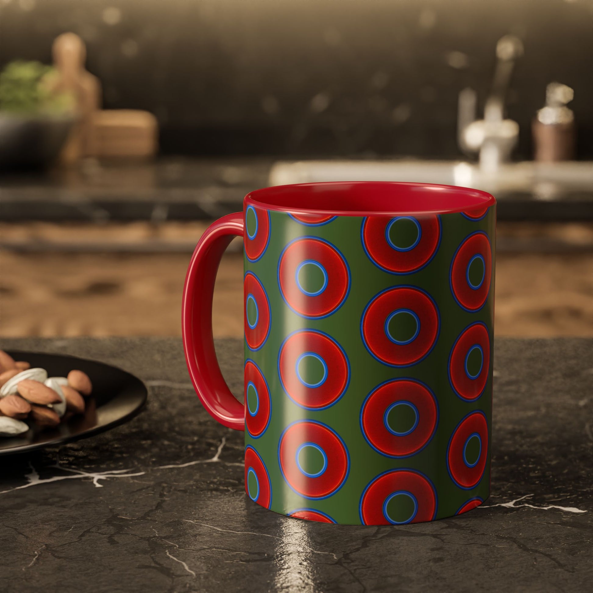 Lump's Grumpy Coffee Mug - vivid red donuts w/dark green background