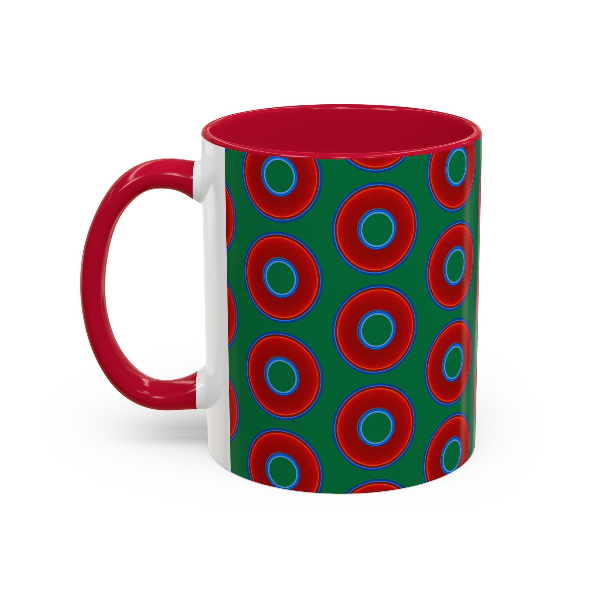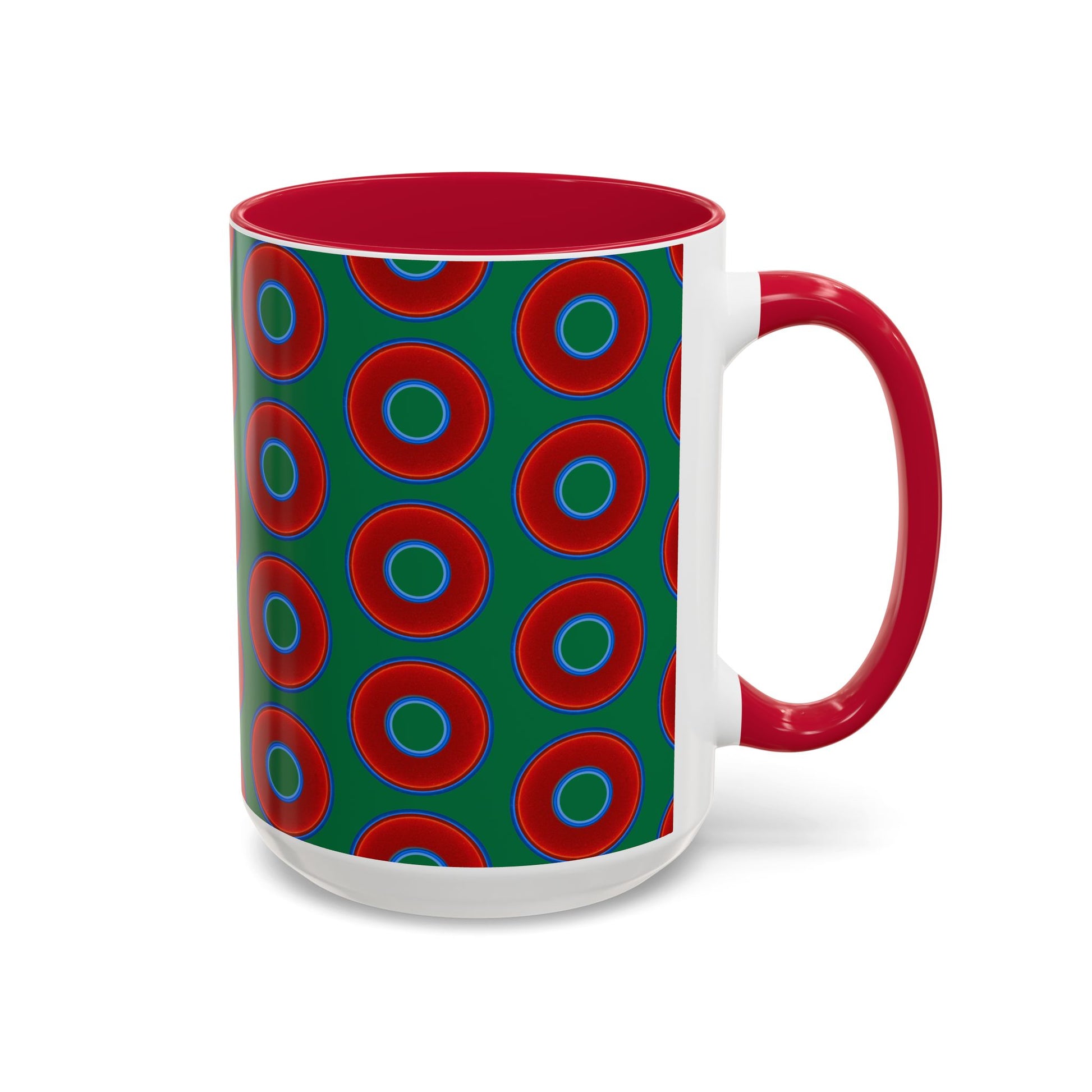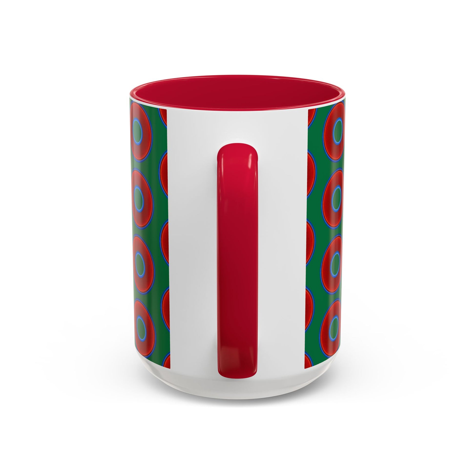 Lump's Grumpy Coffee Mug - vivid red donuts w/green background