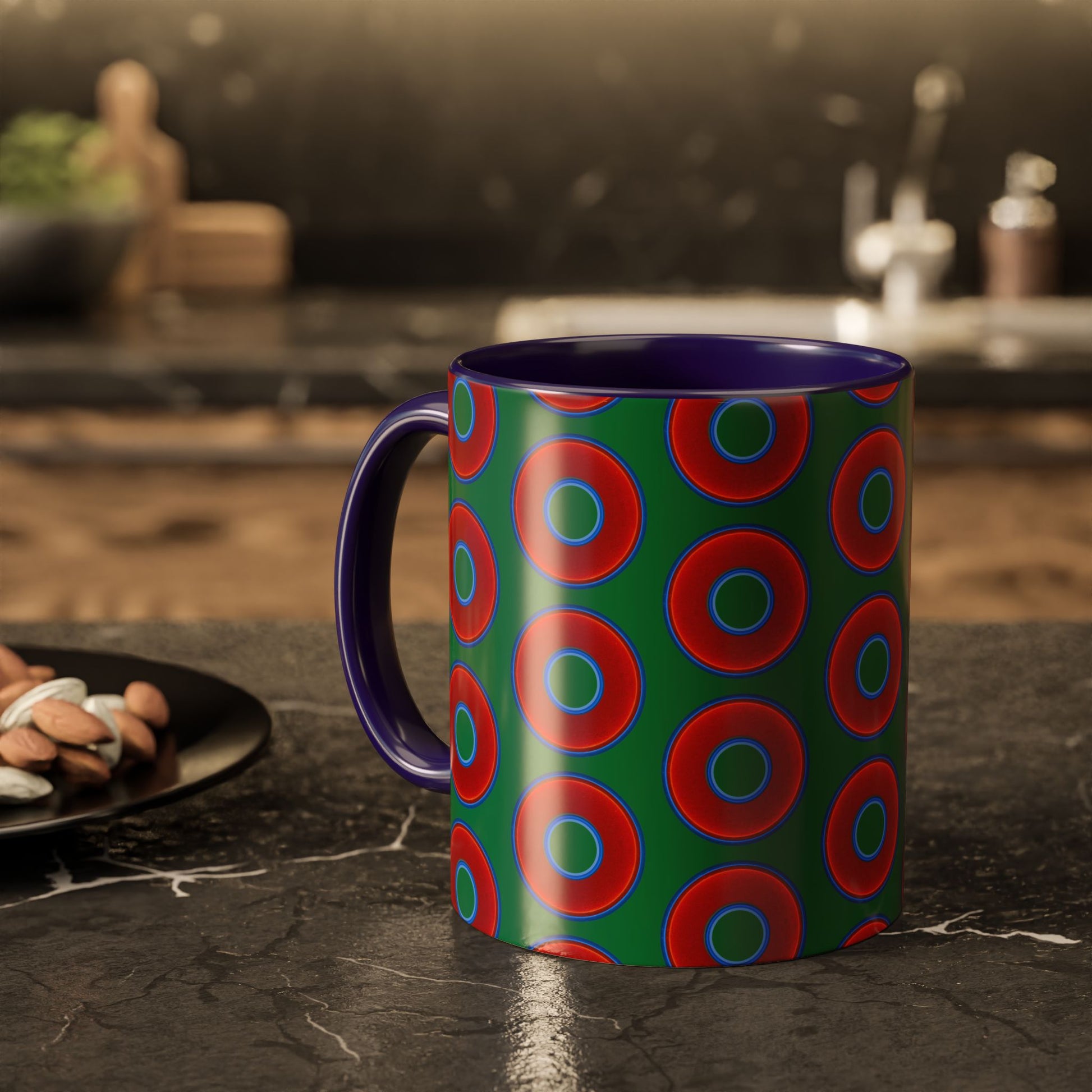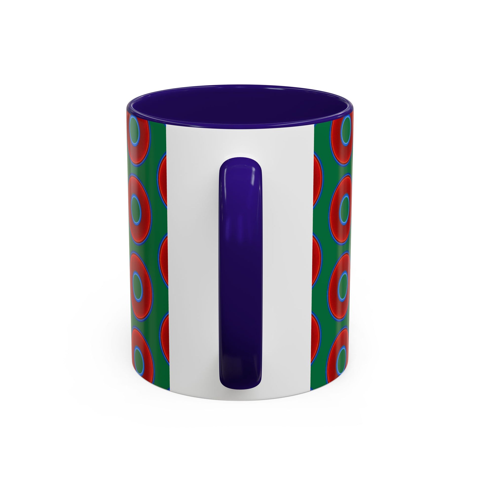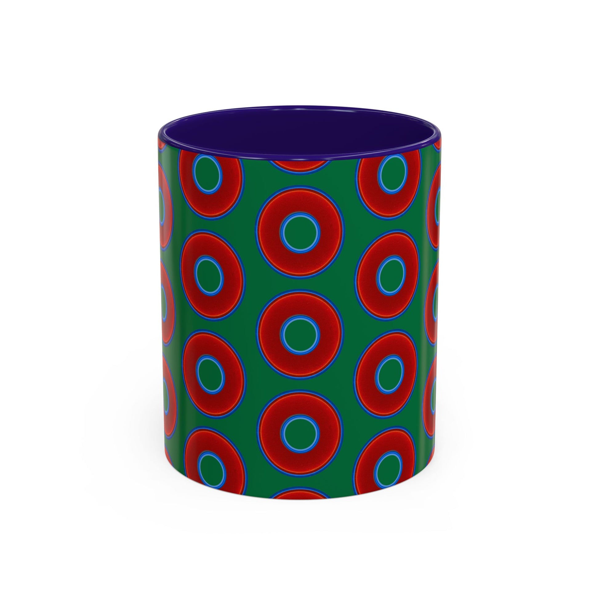 Lump's Grumpy Coffee Mug - vivid red donuts w/green background