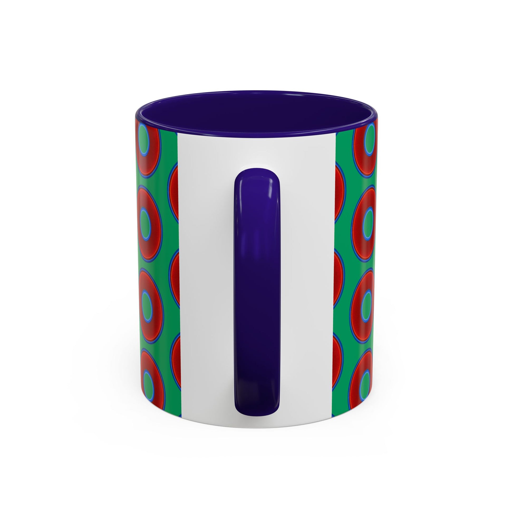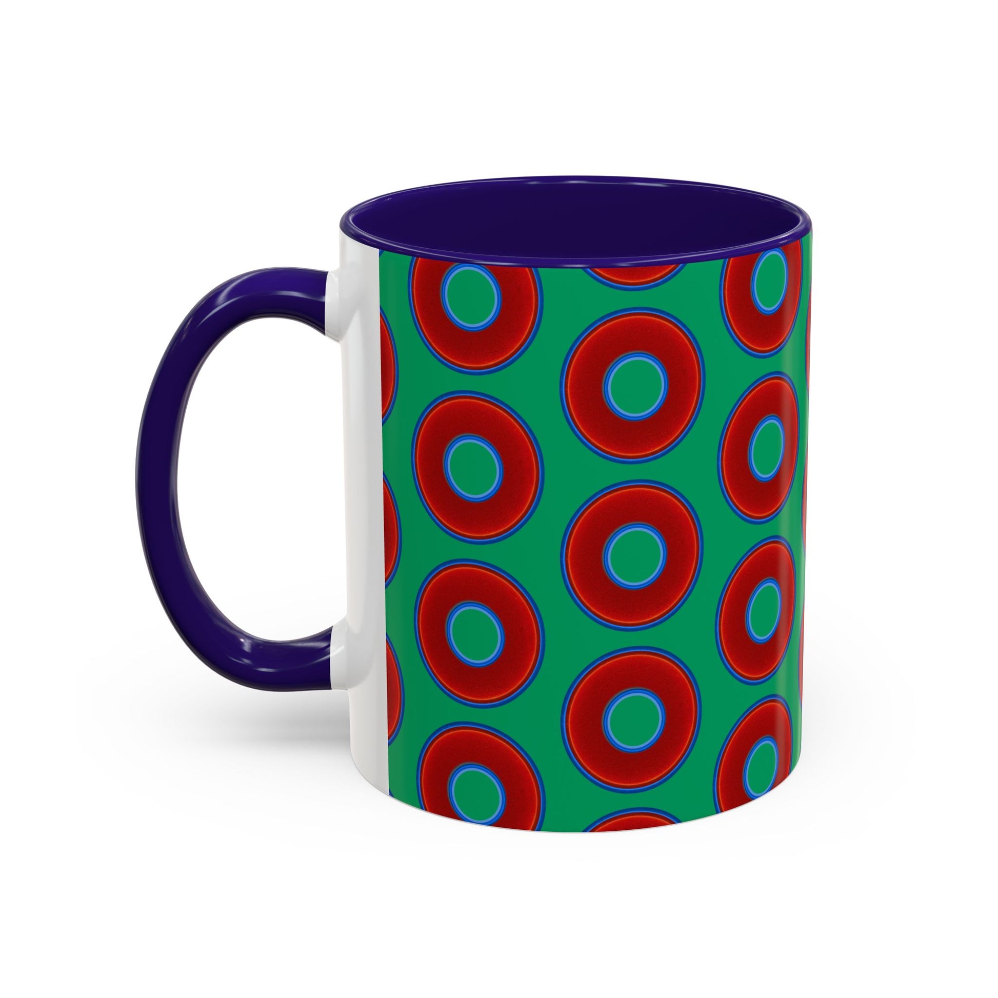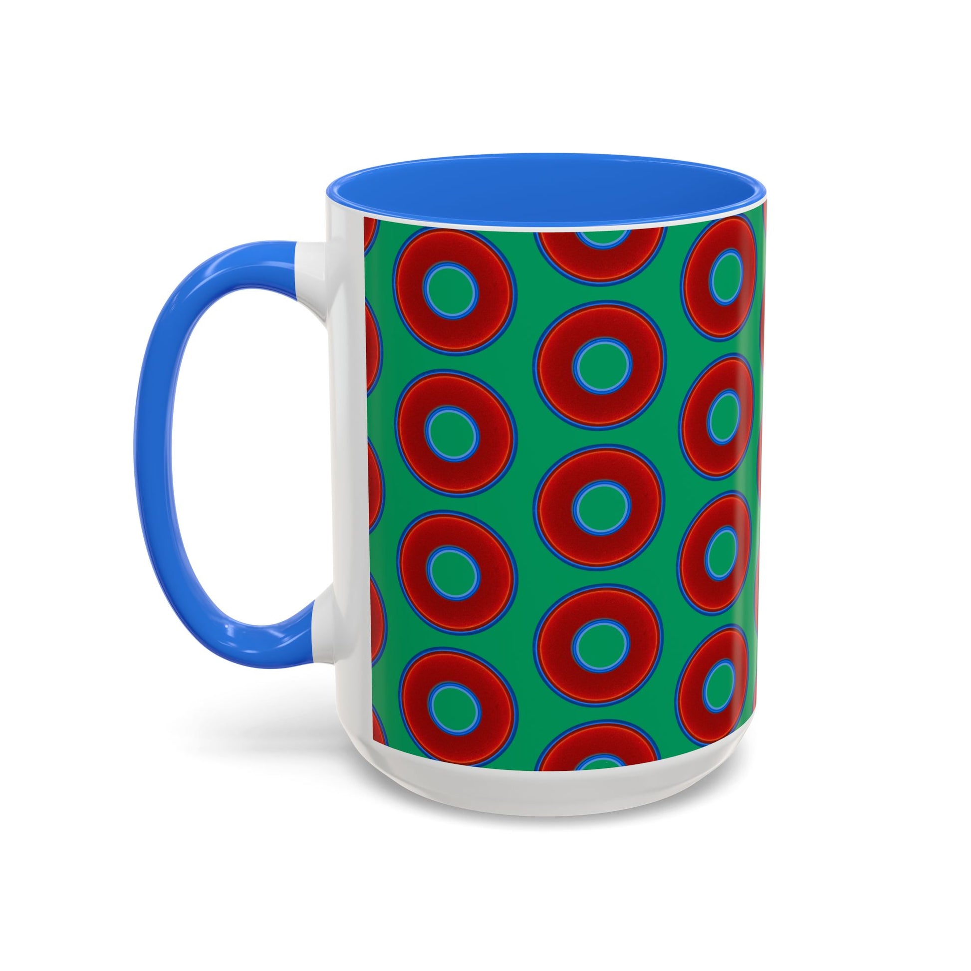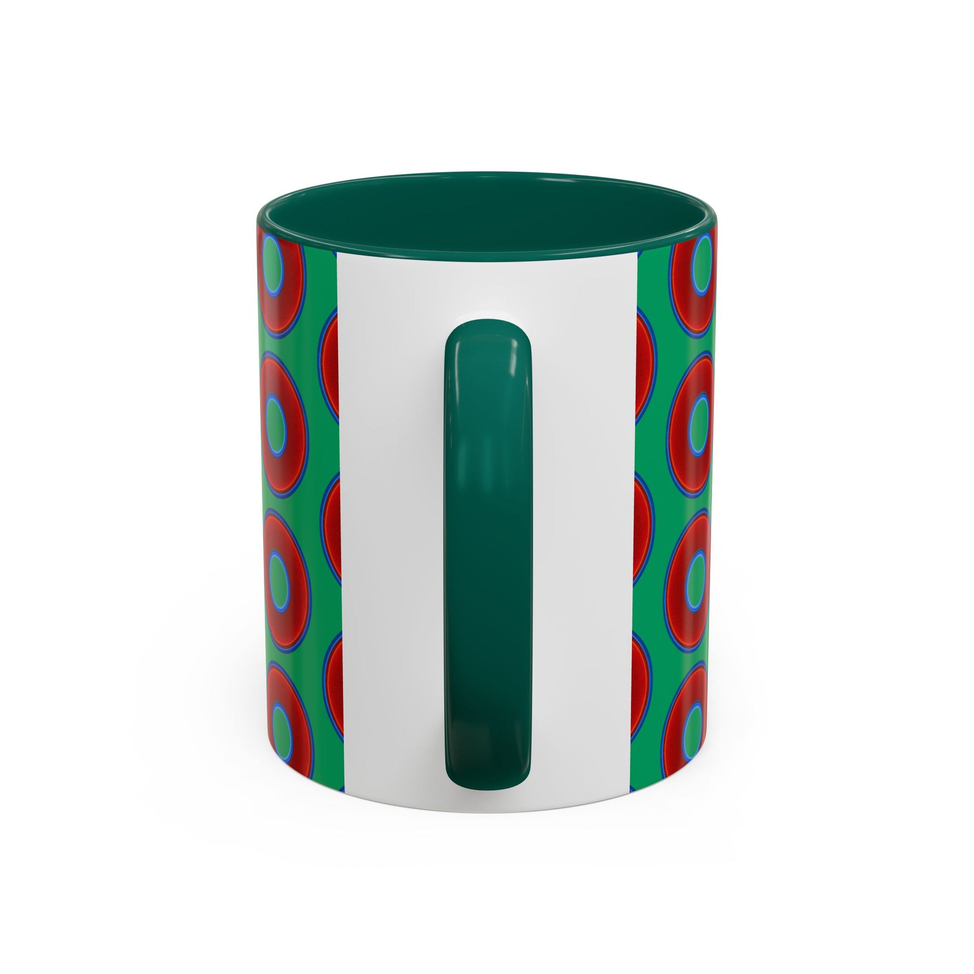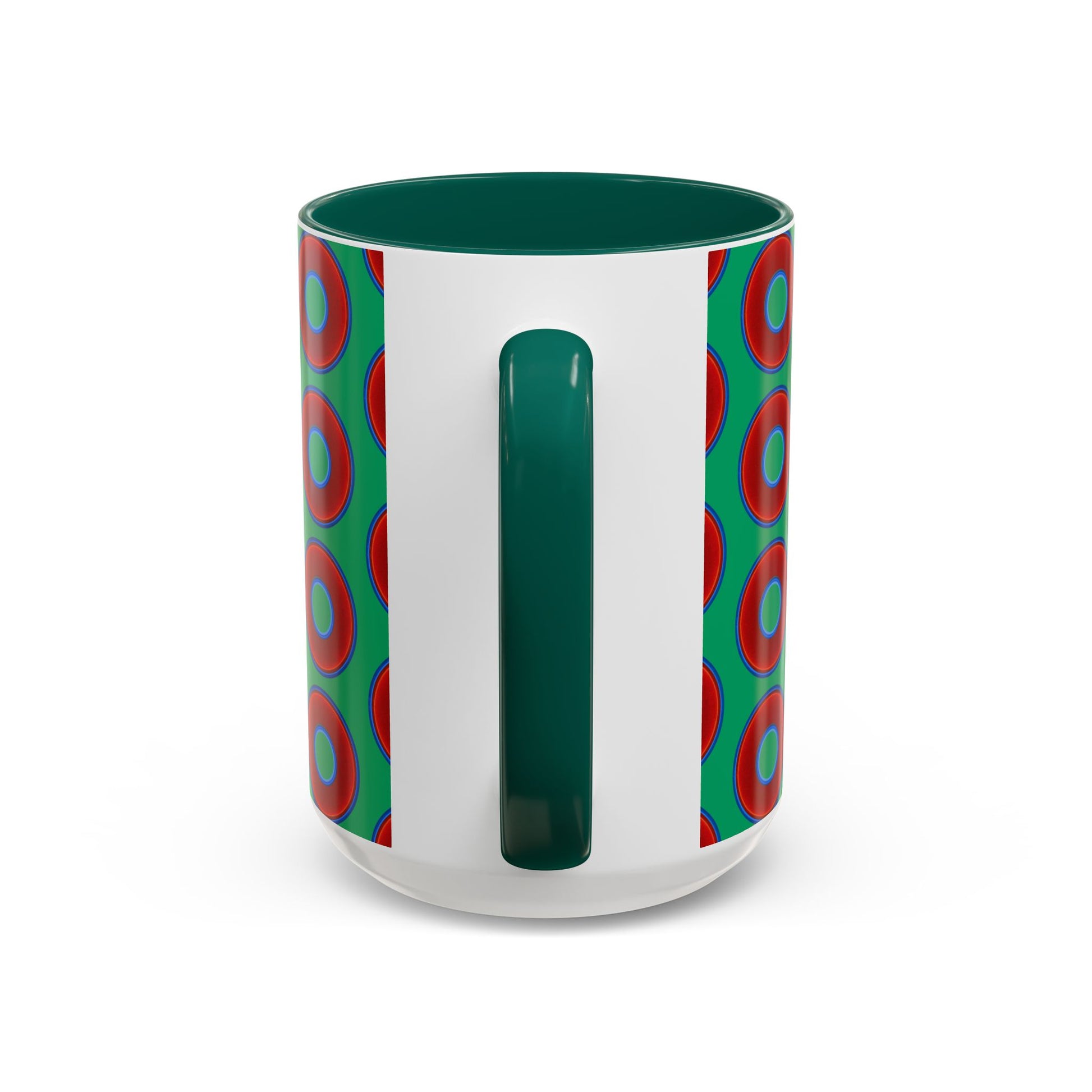 Lump's Grumpy Coffee Mug - vivid red donuts w/jade green background