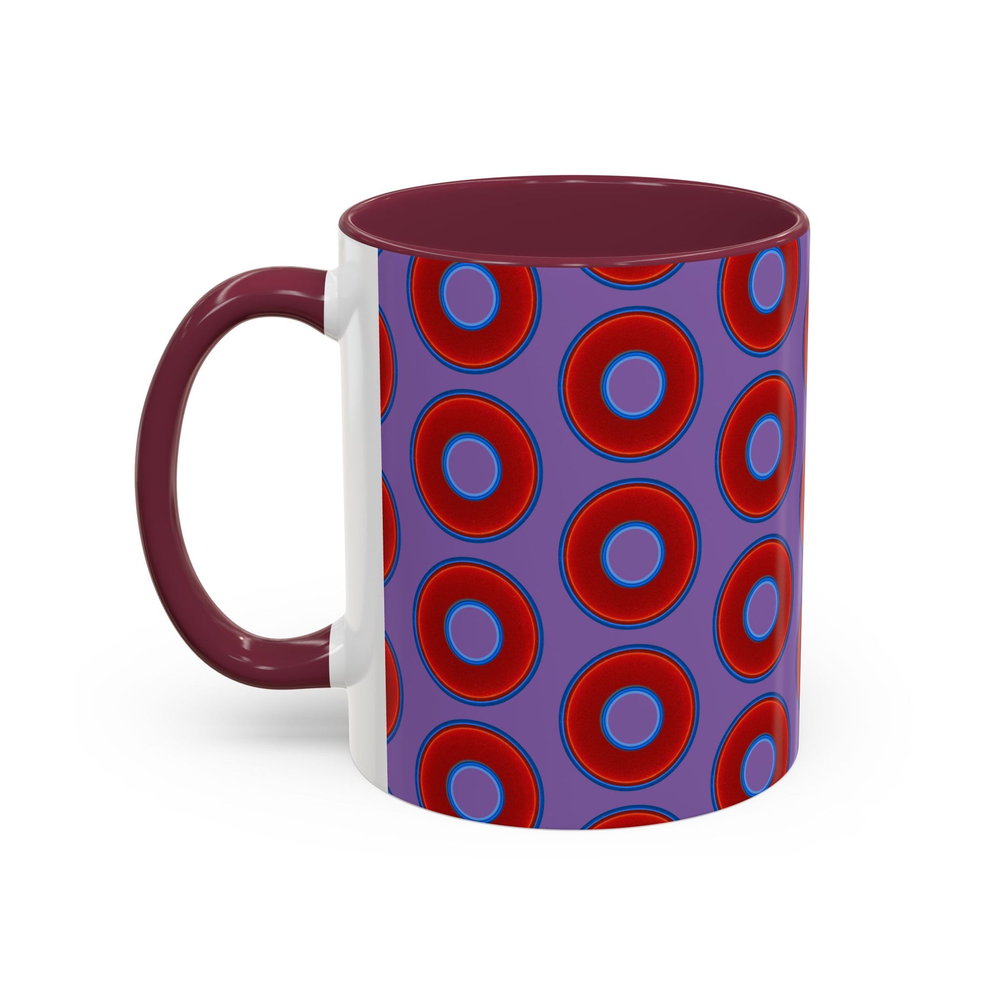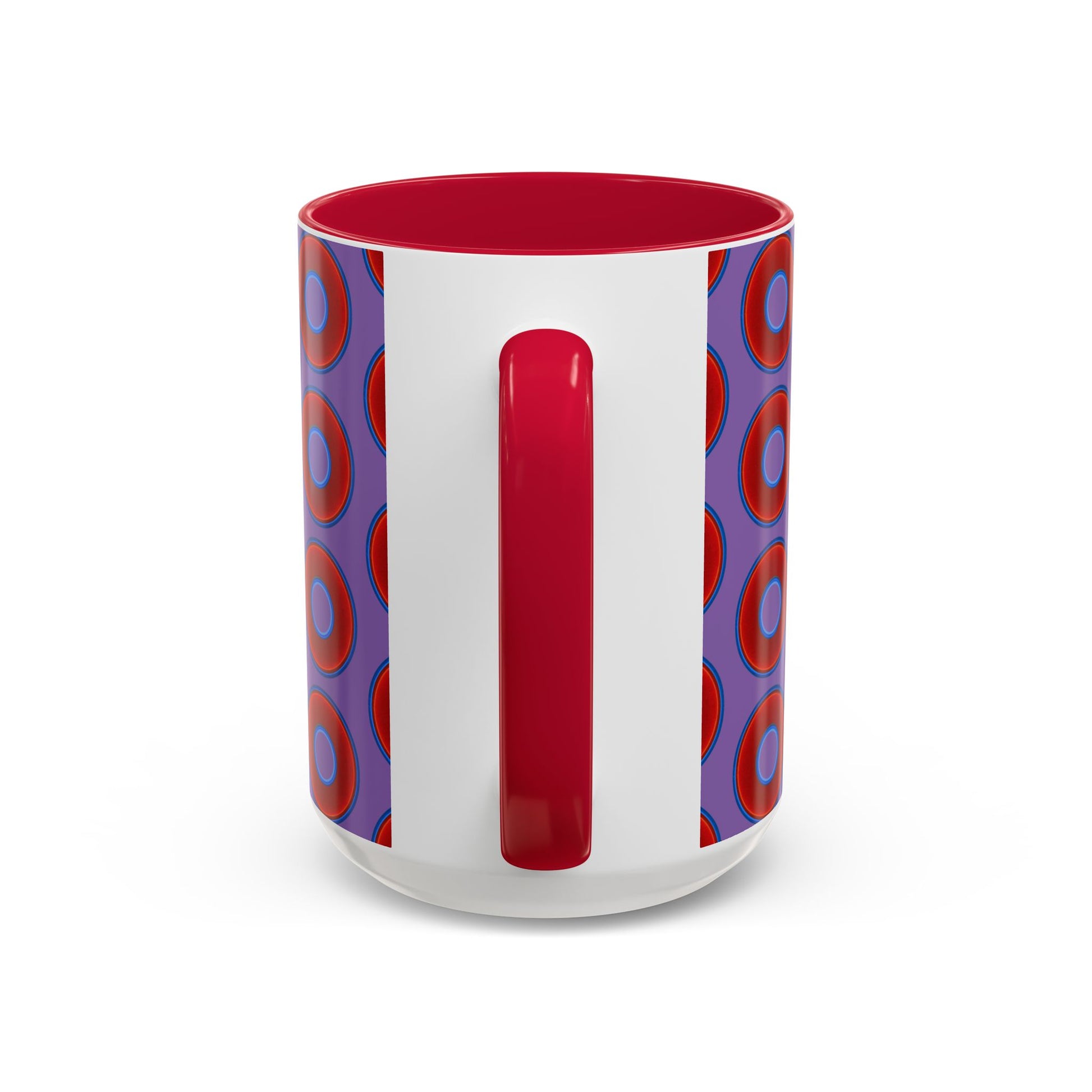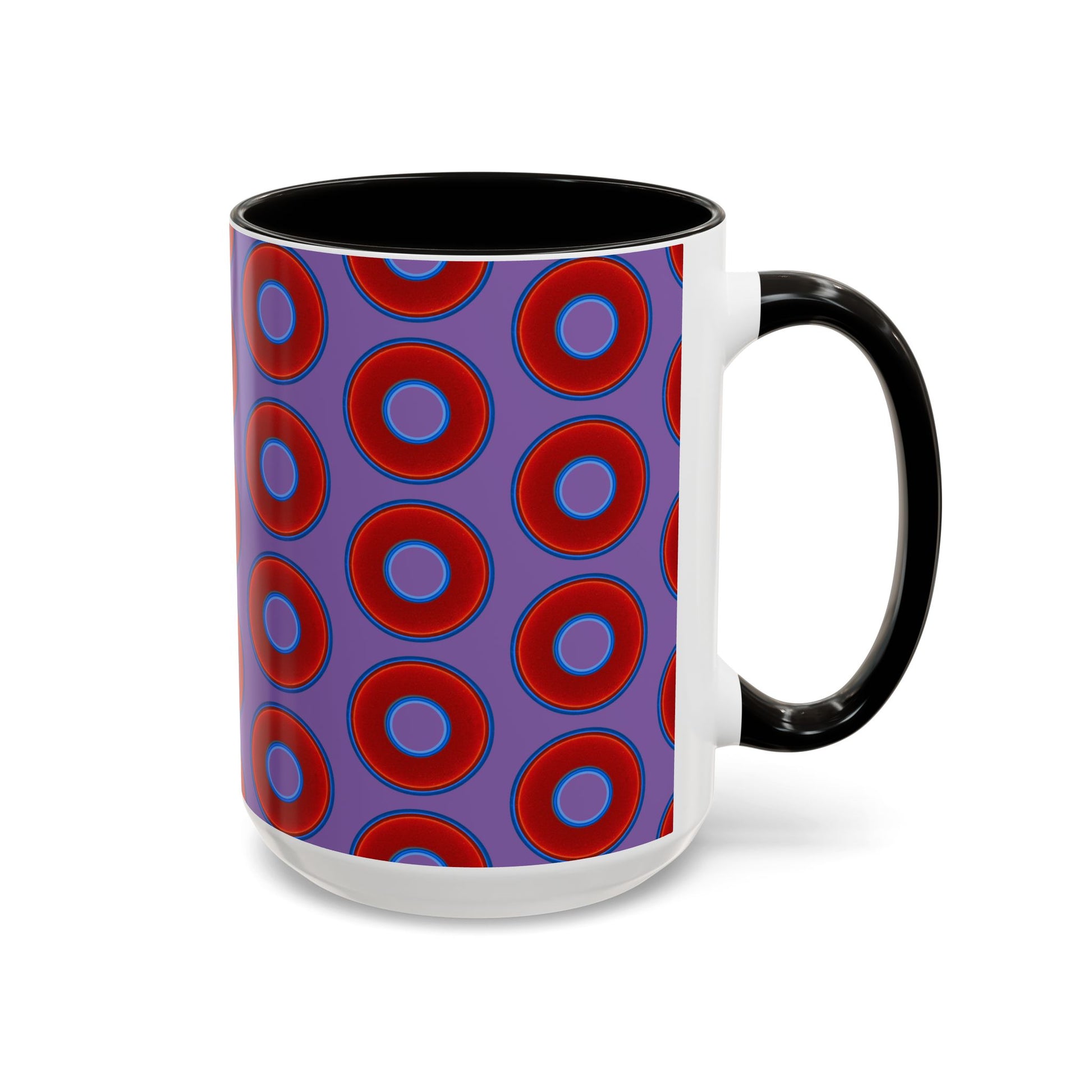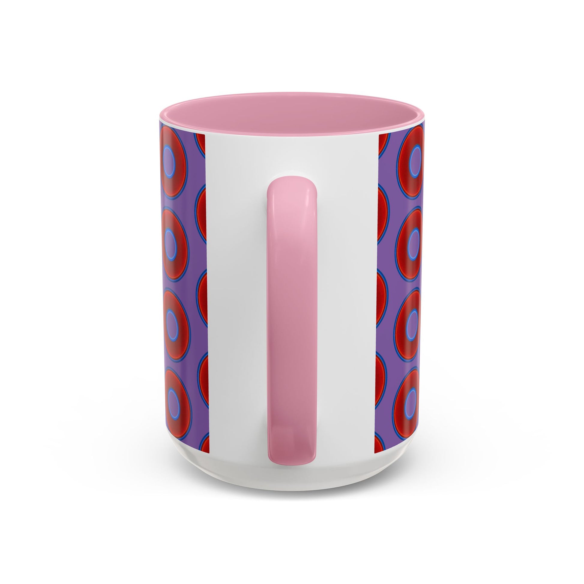 Lump's Grumpy Coffee Mug - vivid red donuts w/light purple background