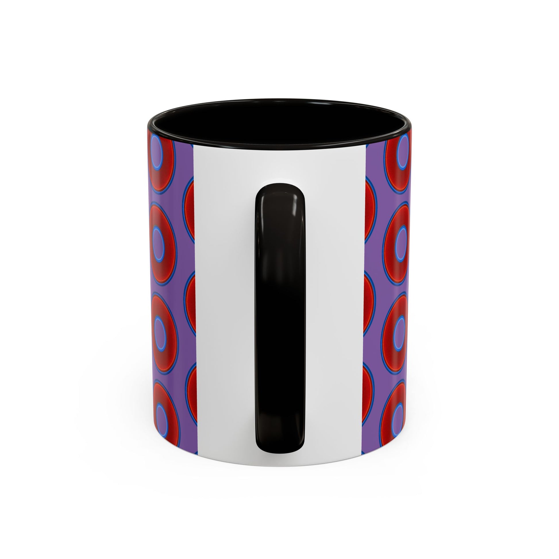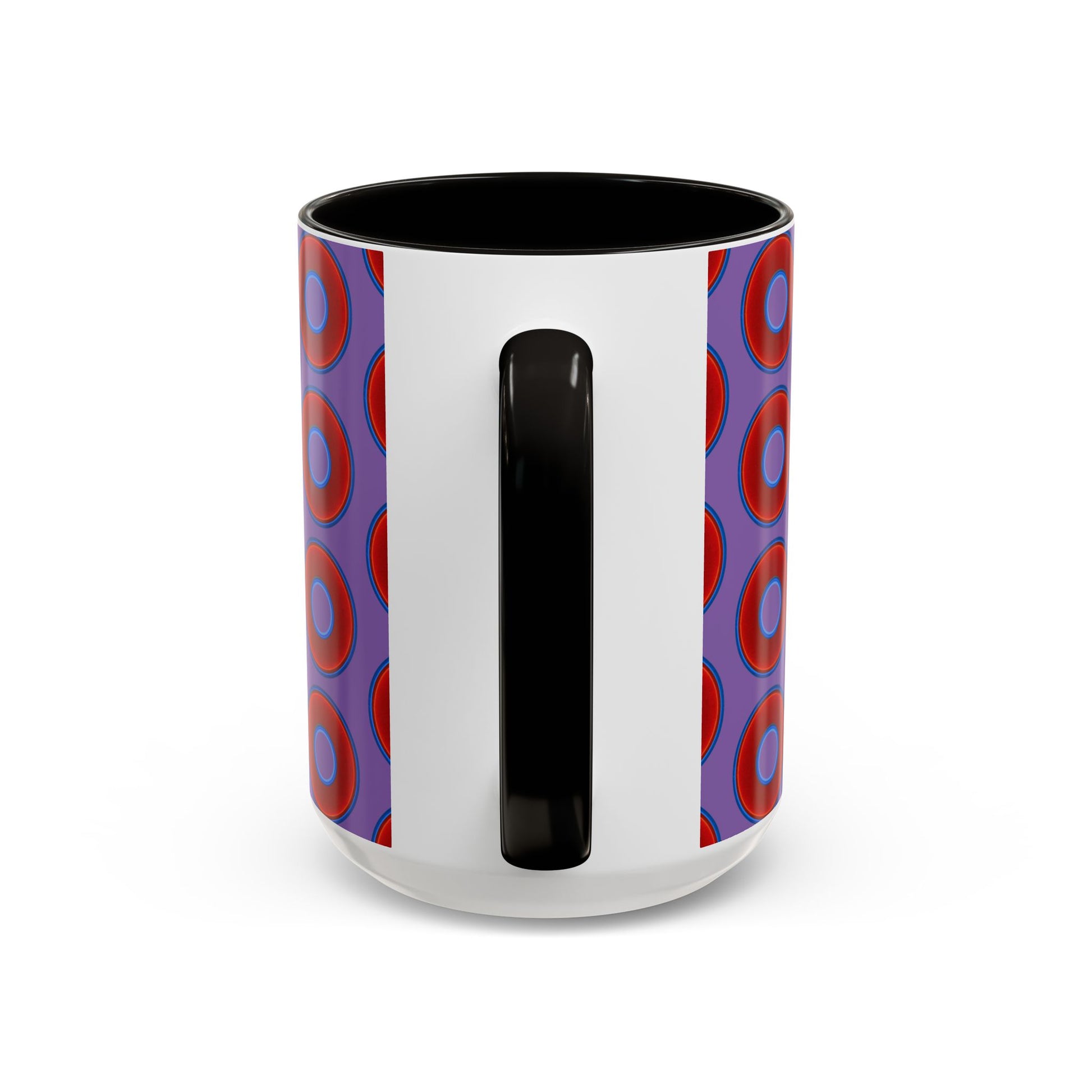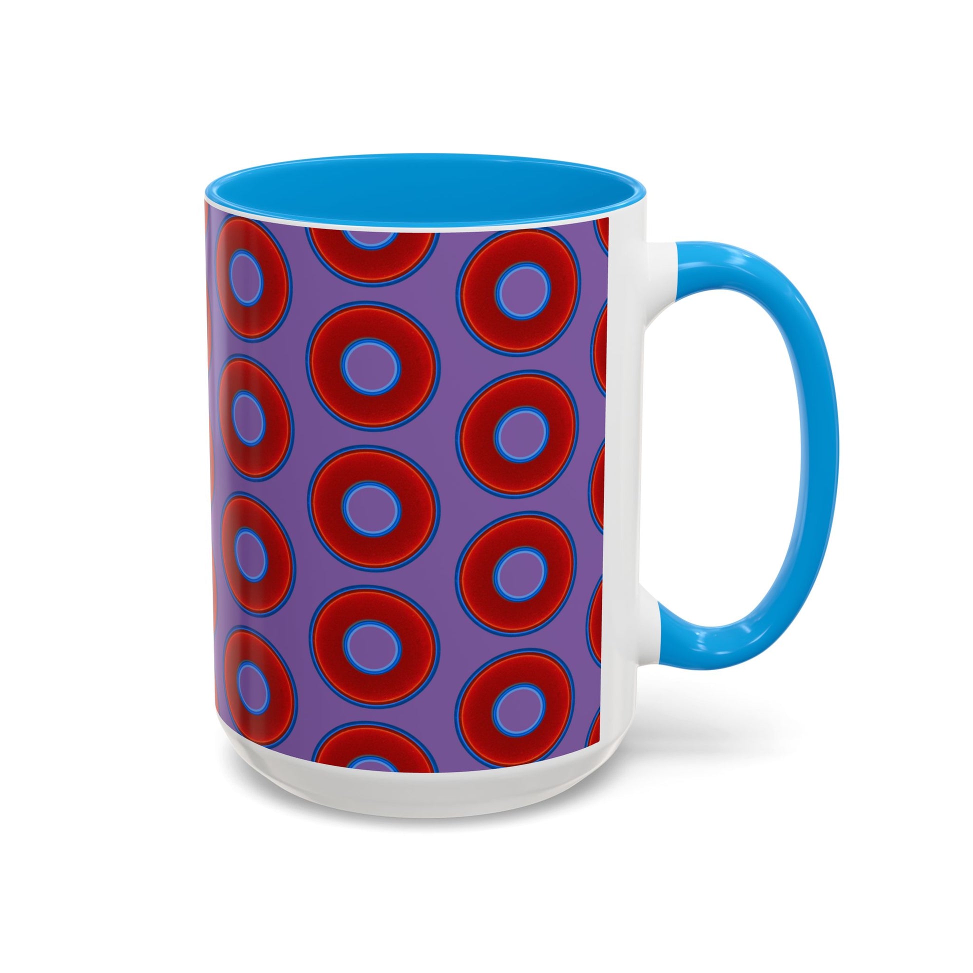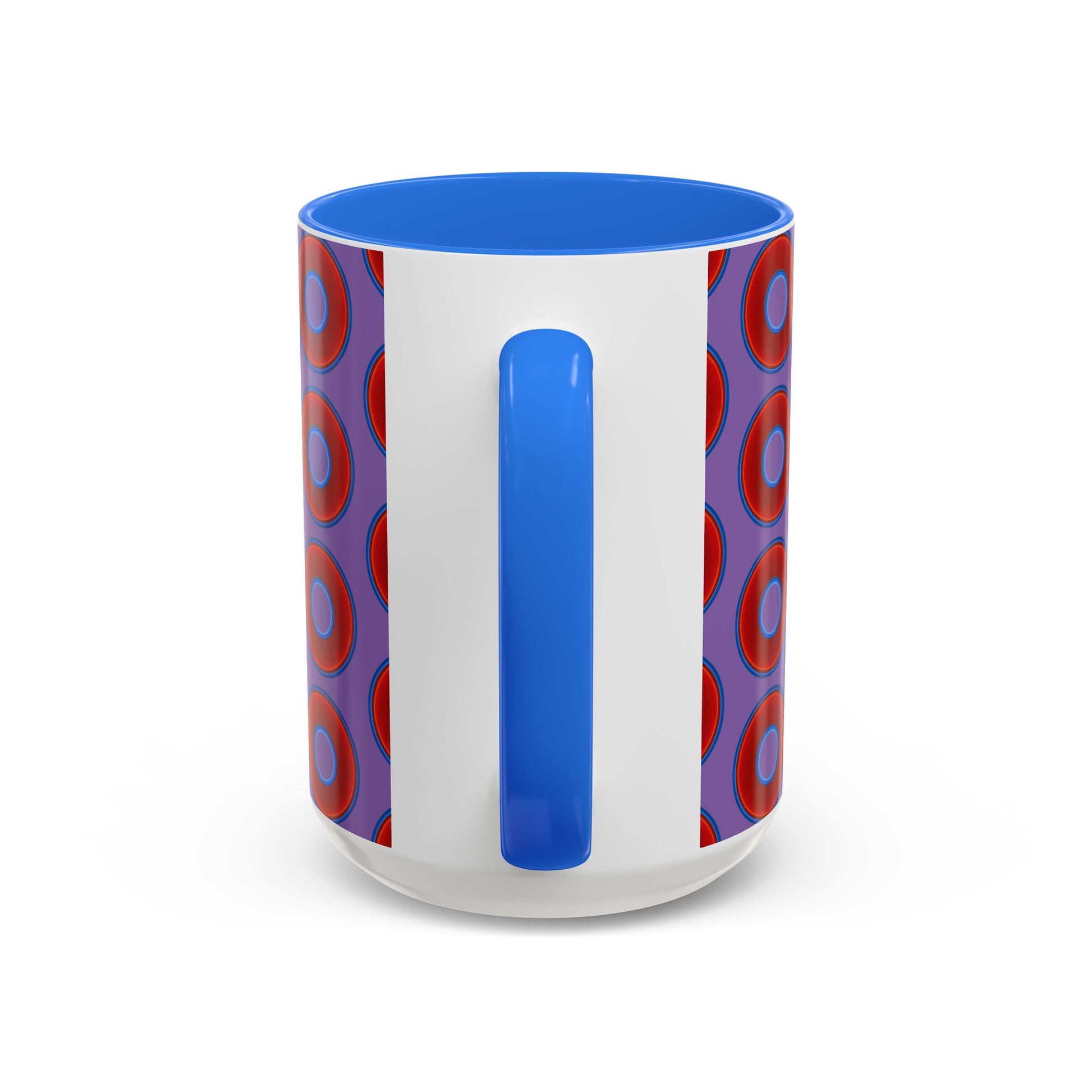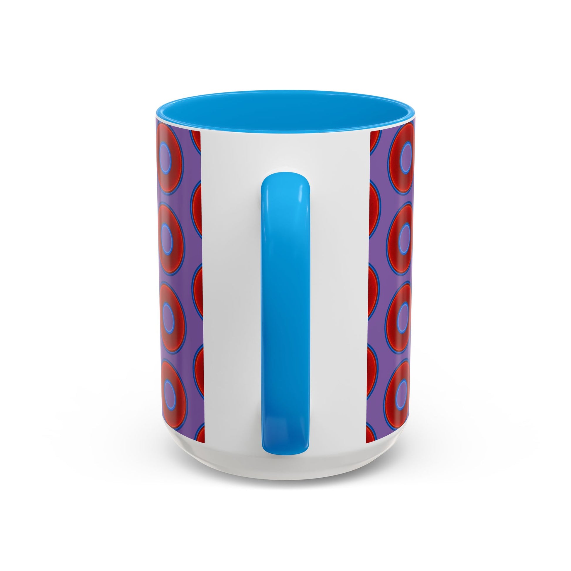 Lump's Grumpy Coffee Mug - vivid red donuts w/light purple background