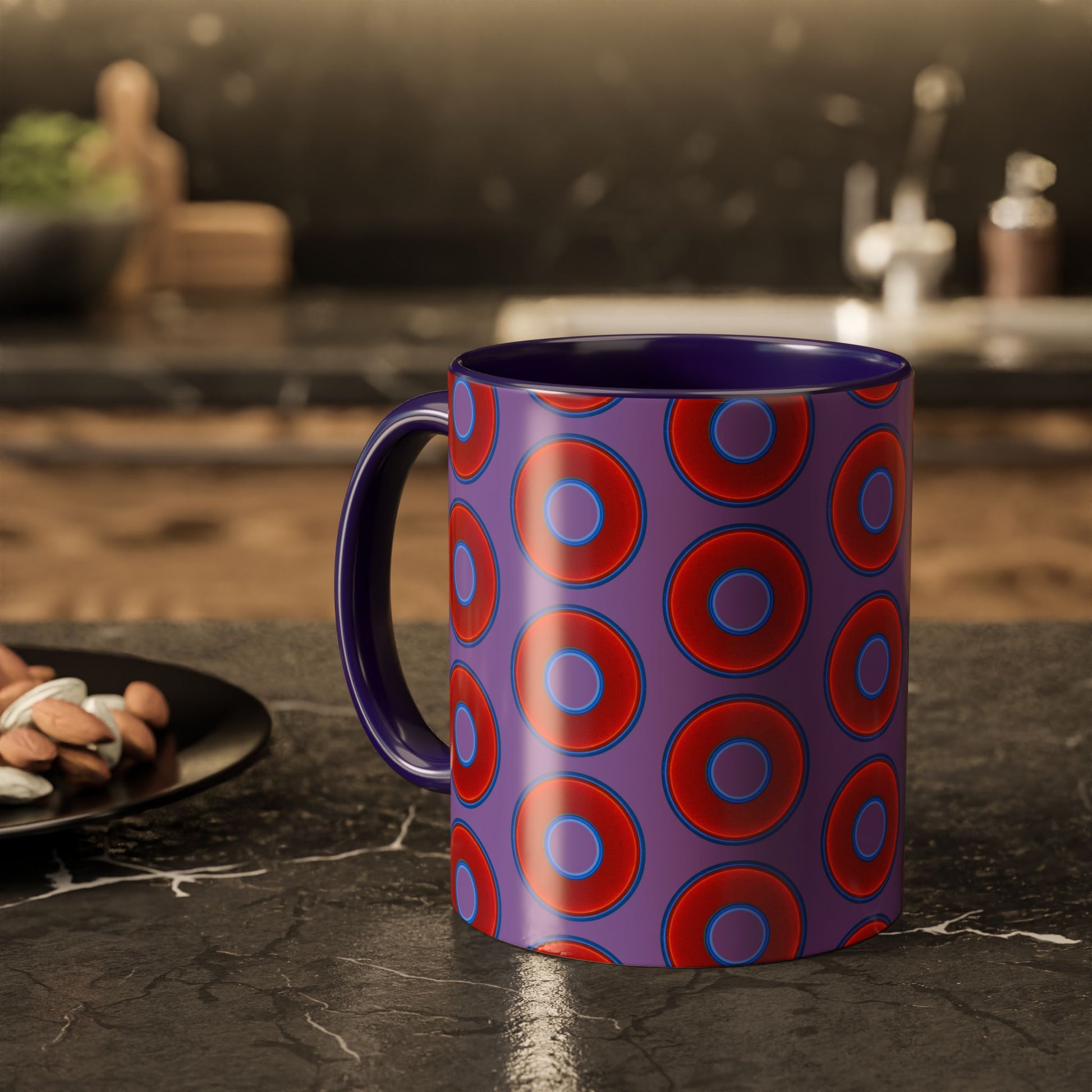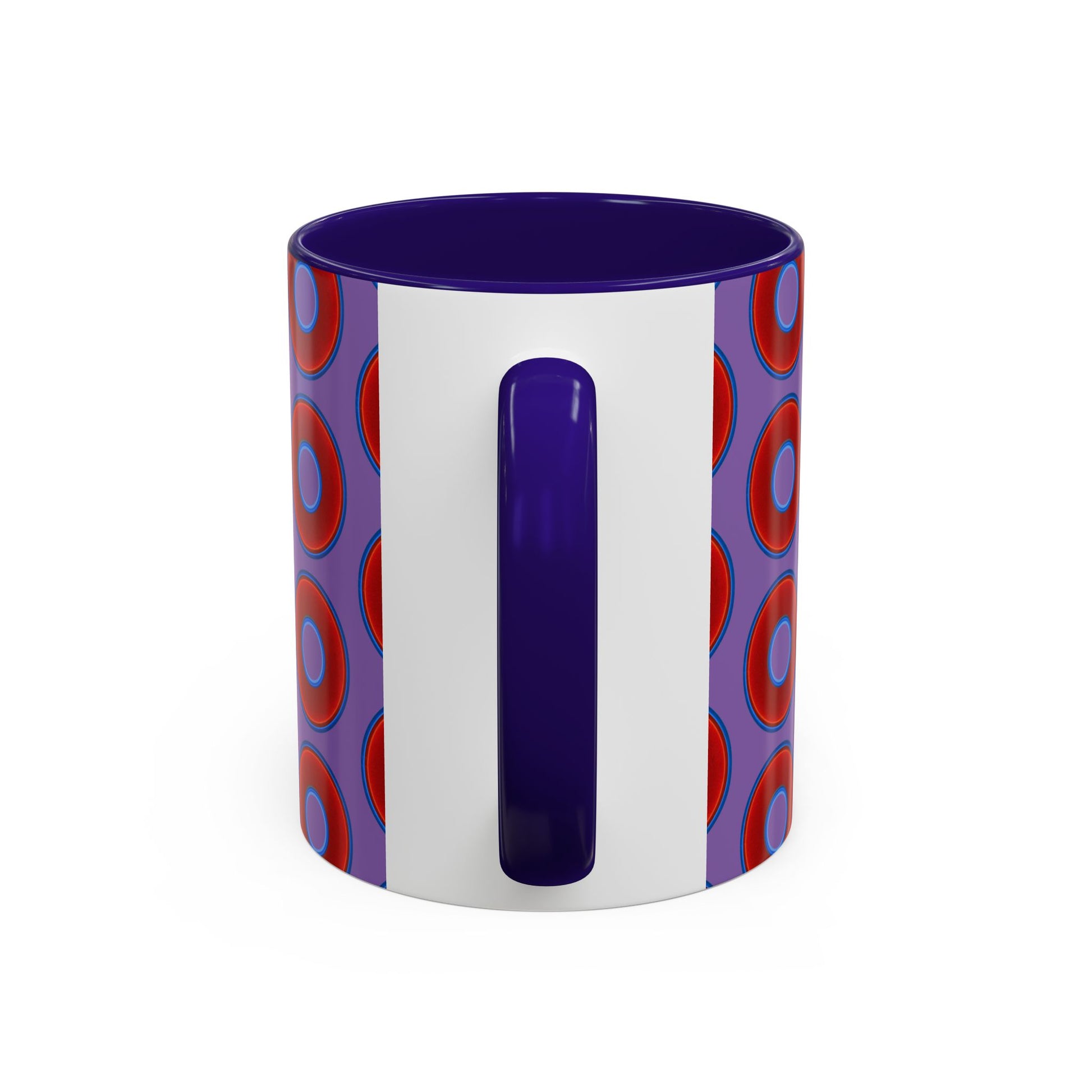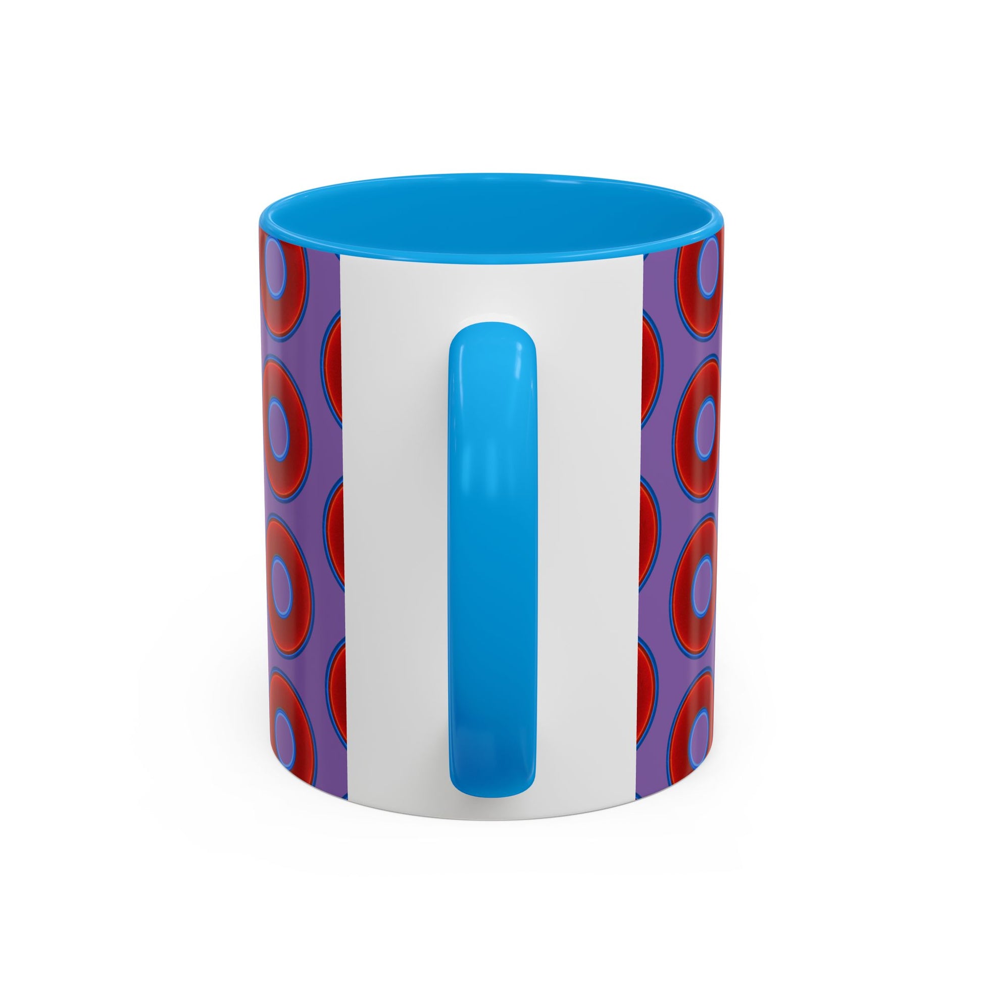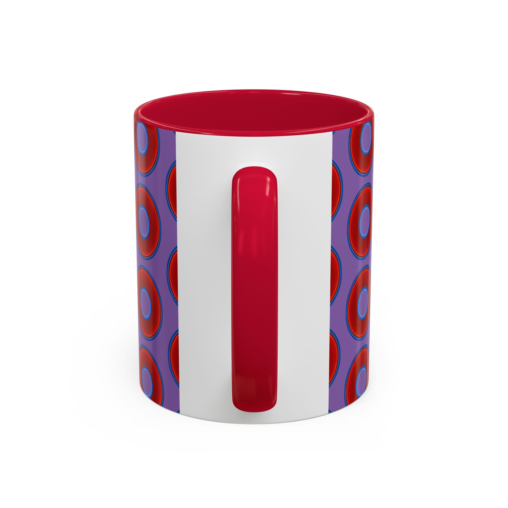 Lump's Grumpy Coffee Mug - vivid red donuts w/light purple background