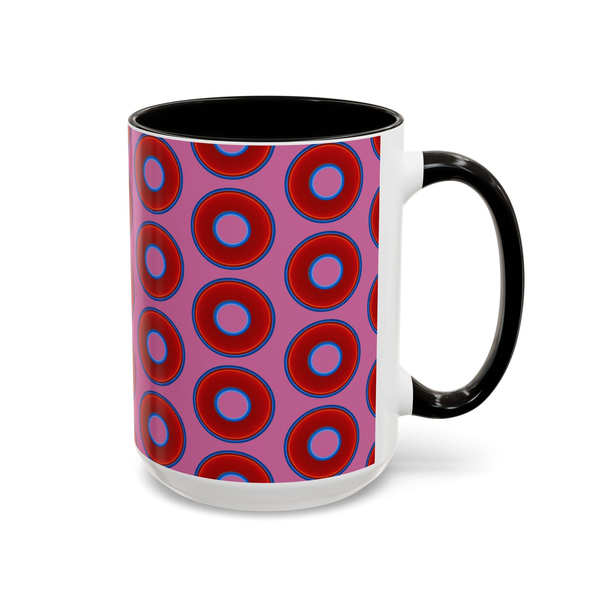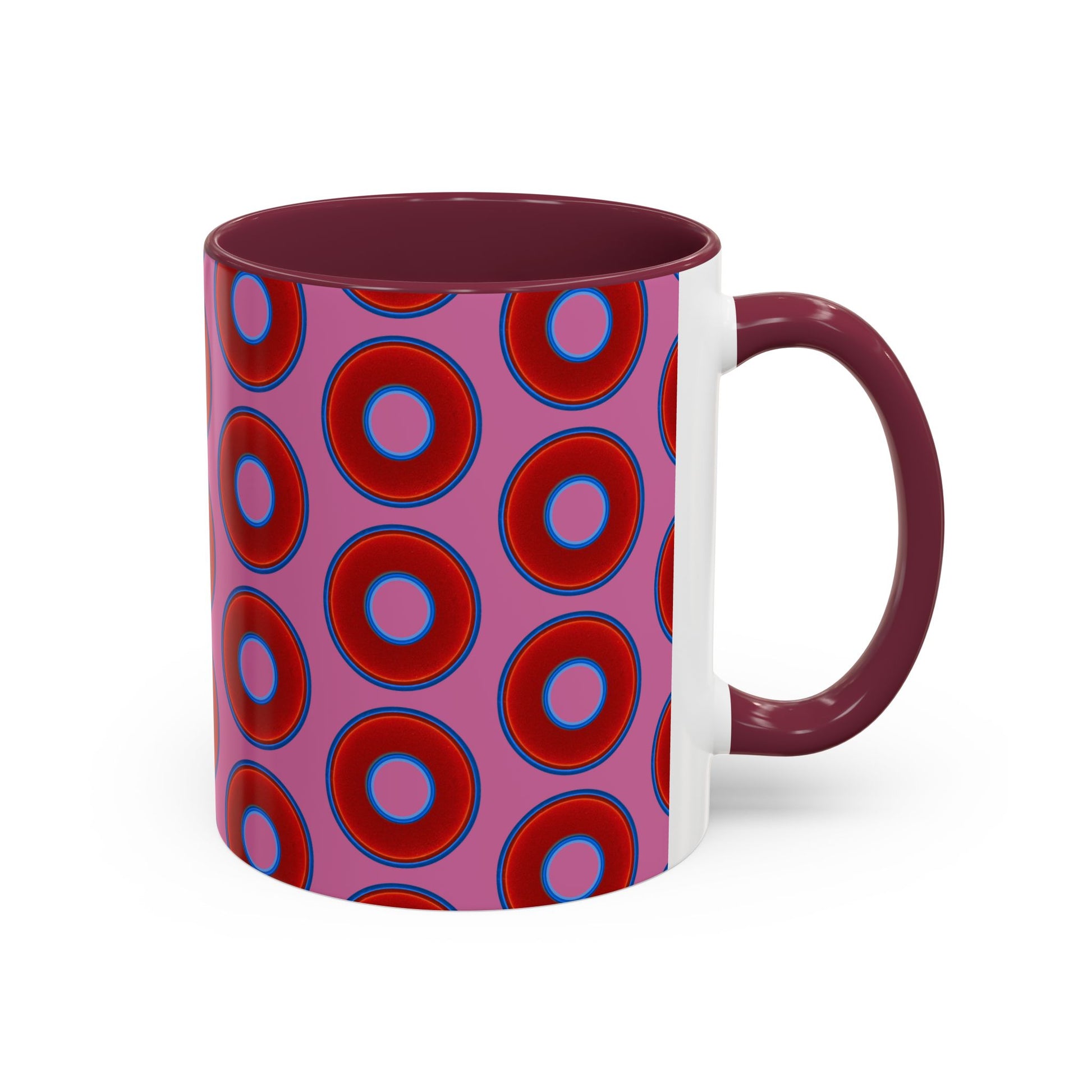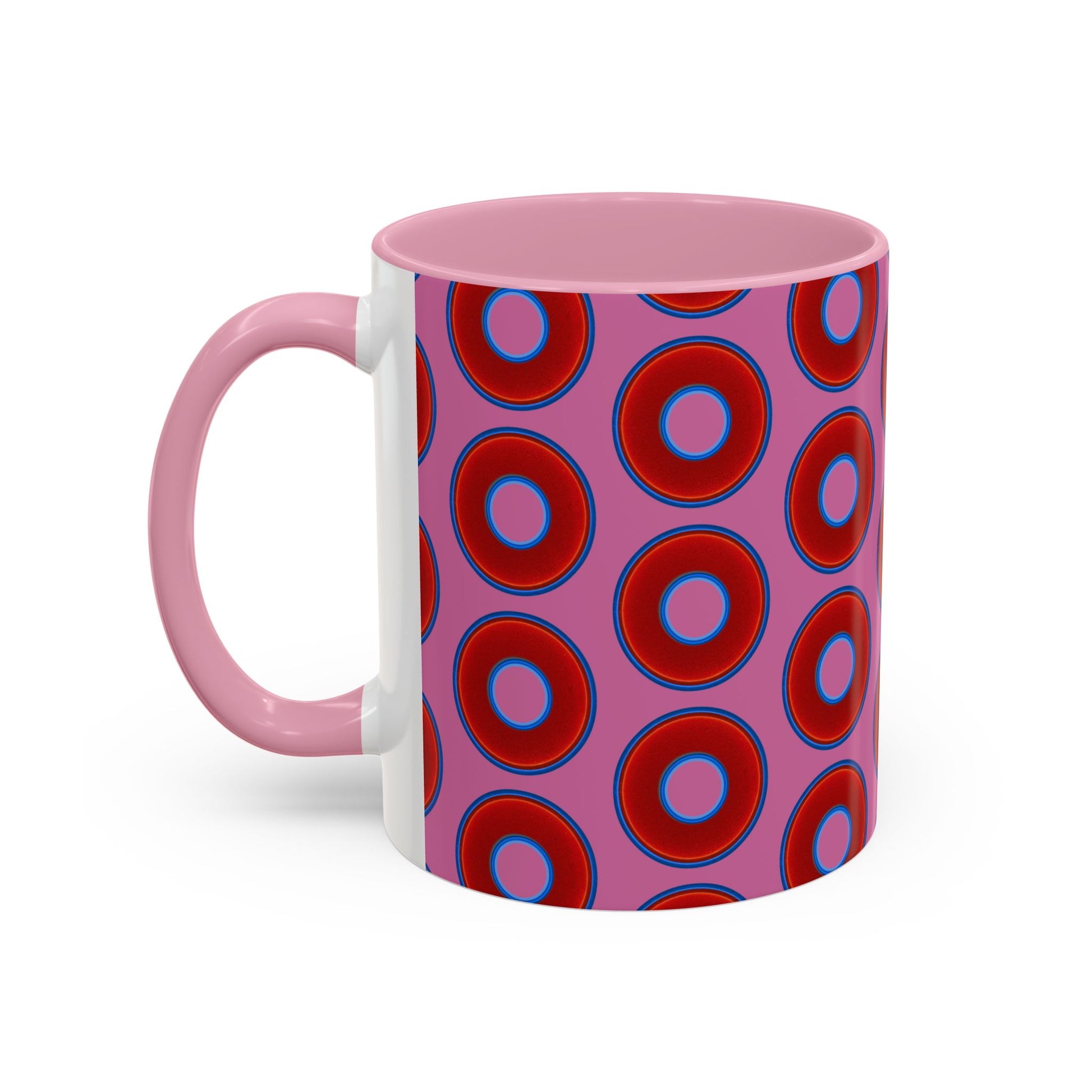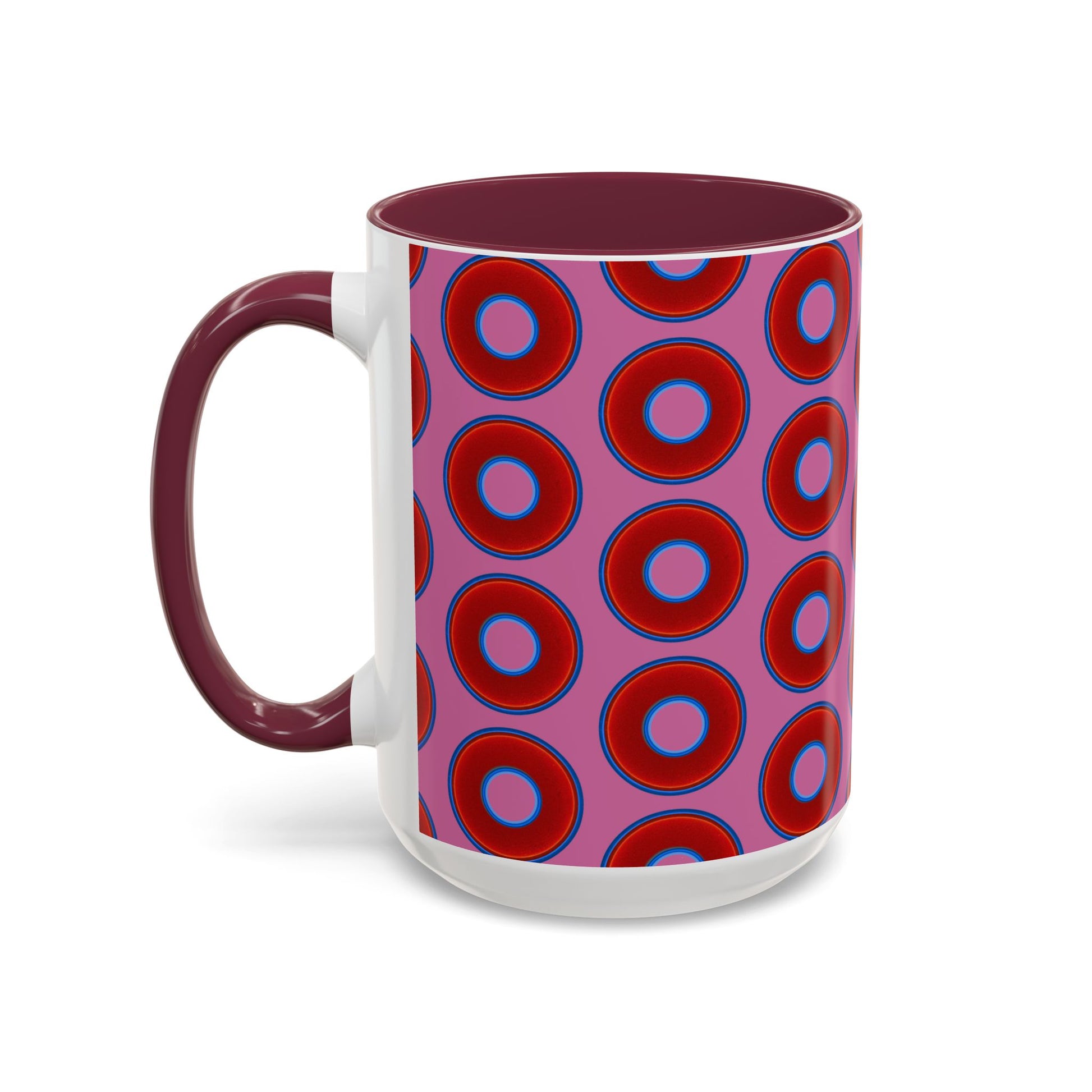 Lump's Grumpy Coffee Mug - vivid red donuts w/pink background