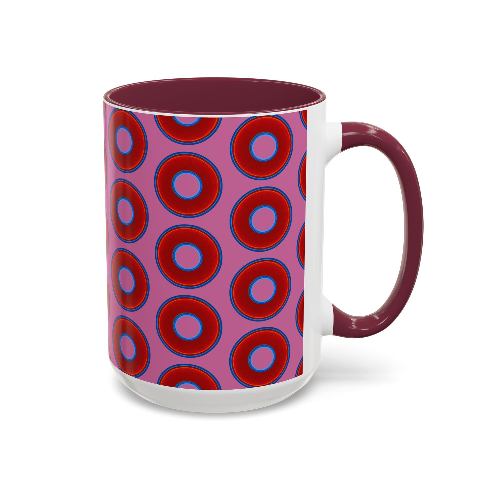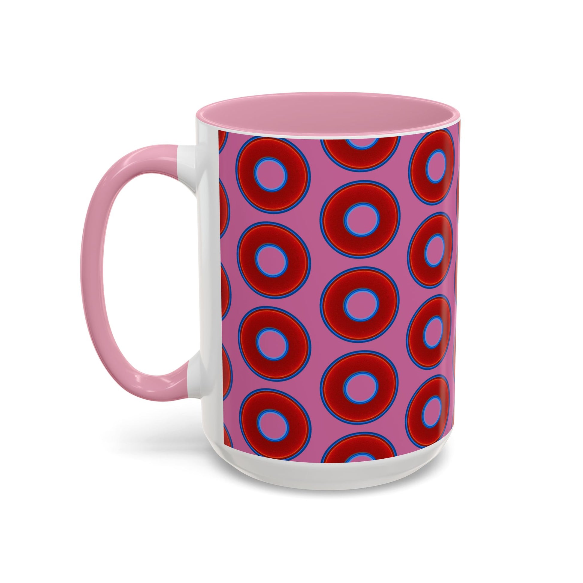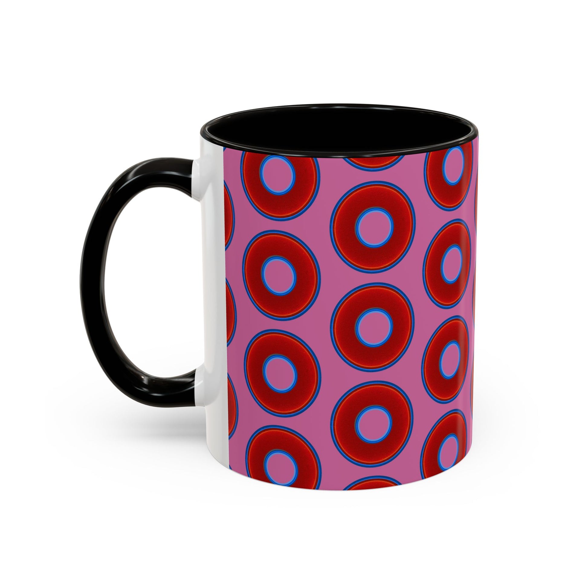 Lump's Grumpy Coffee Mug - vivid red donuts w/pink background