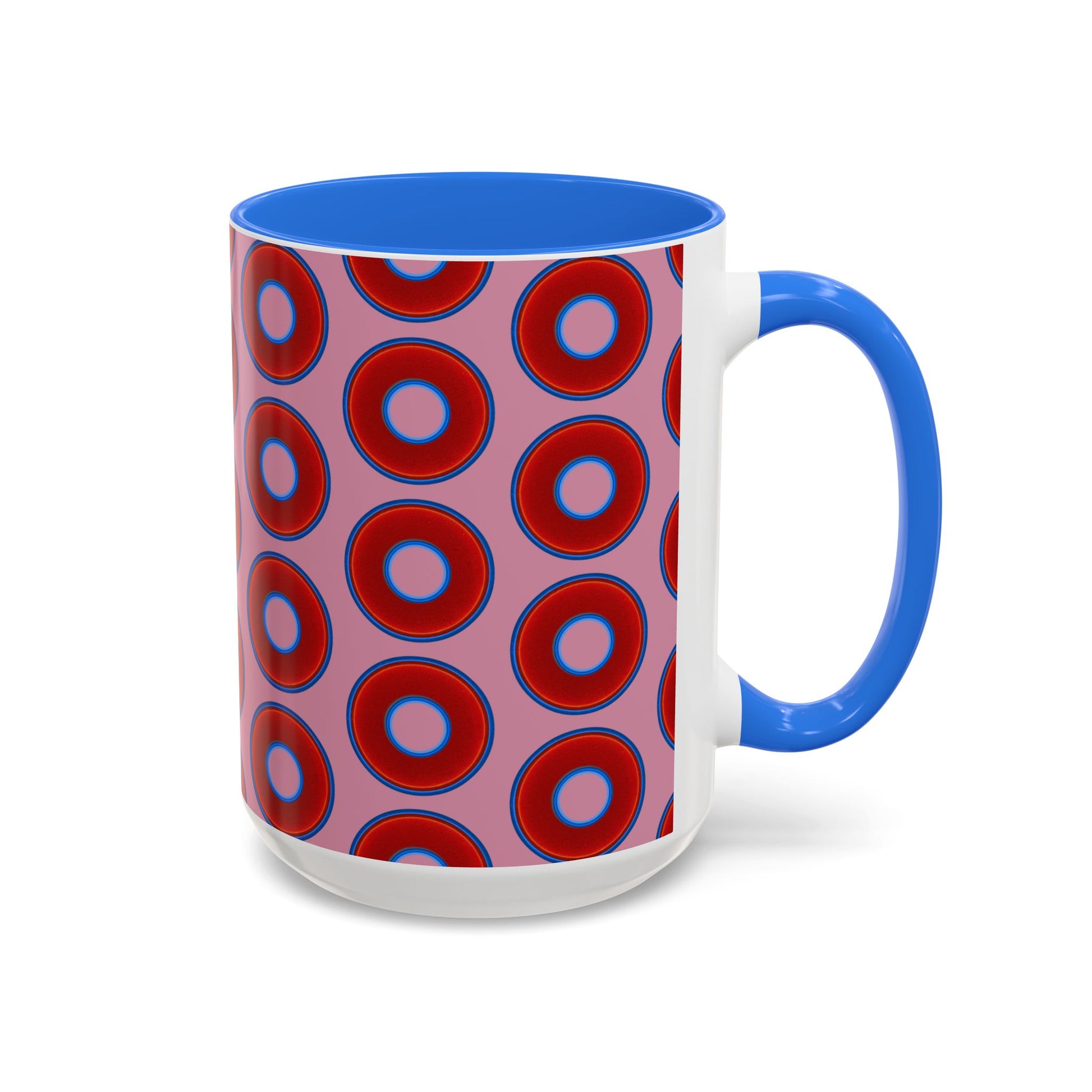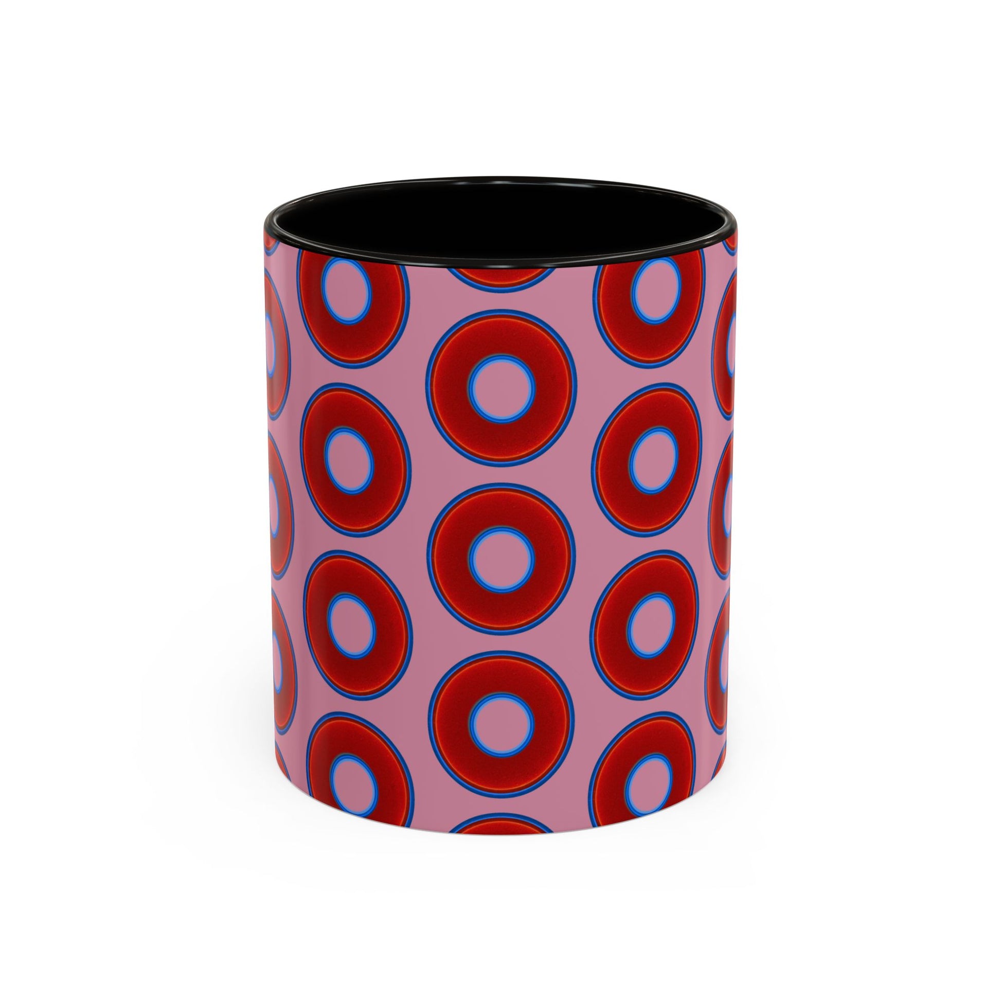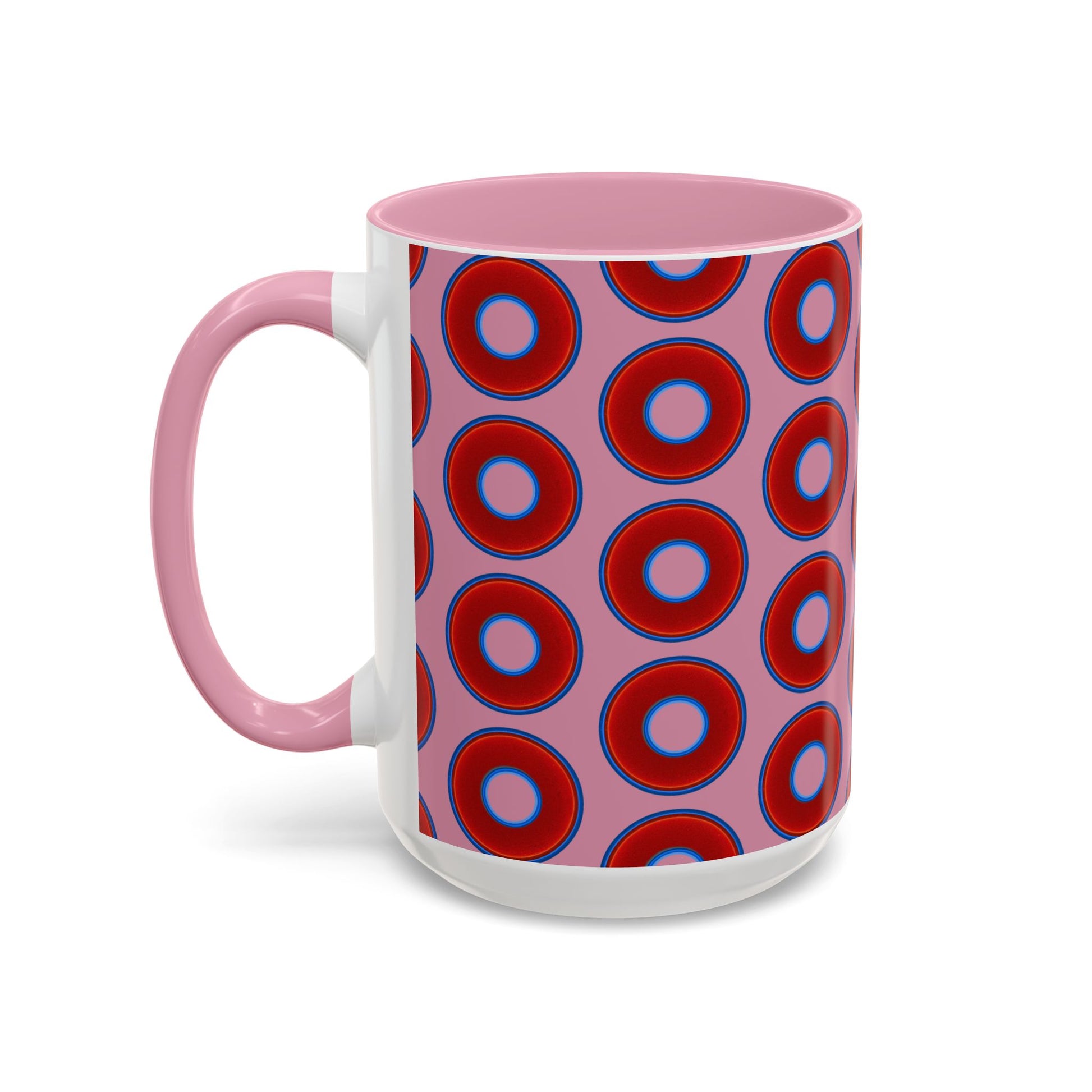 Lump's Grumpy Coffee Mug - vivid red donuts w/pink background