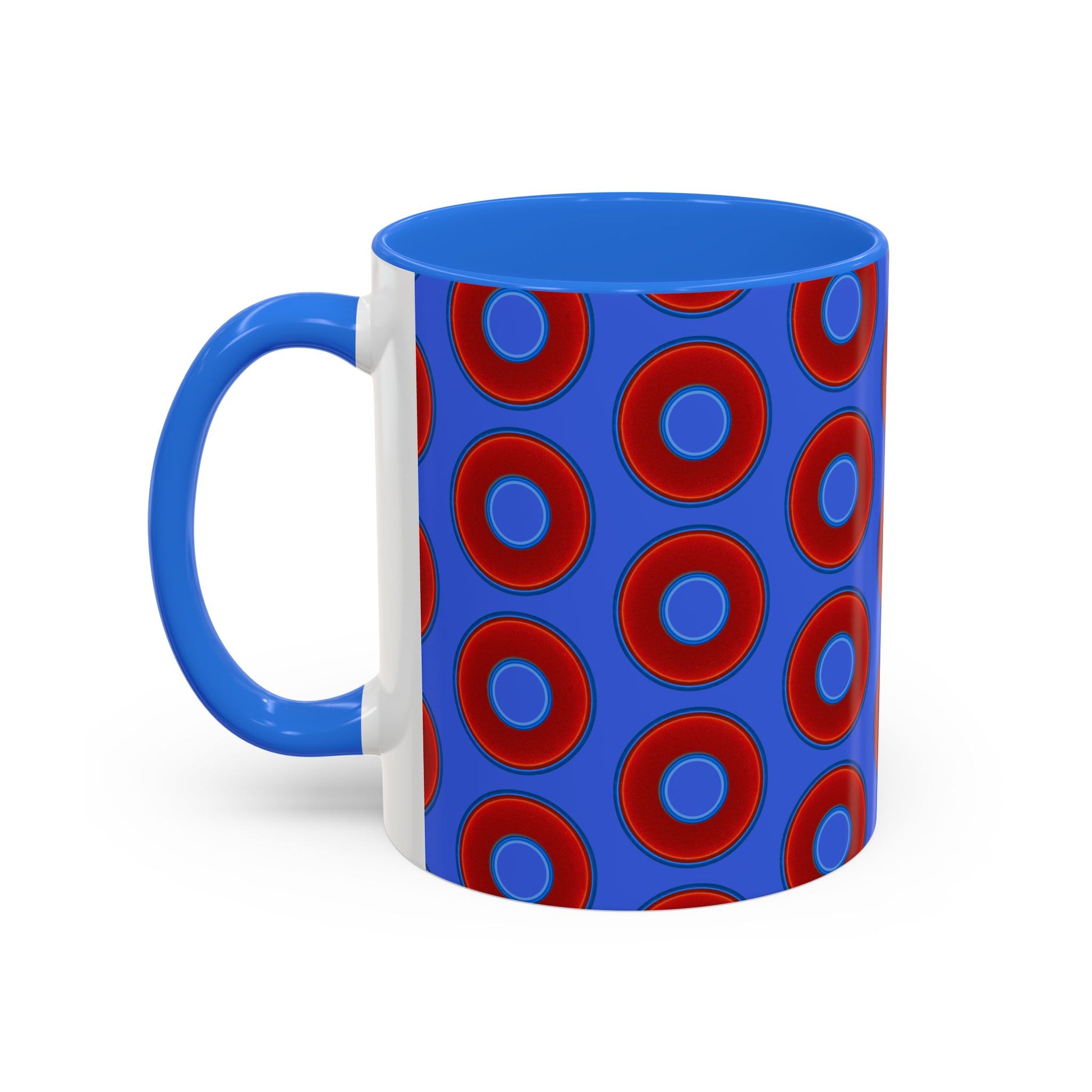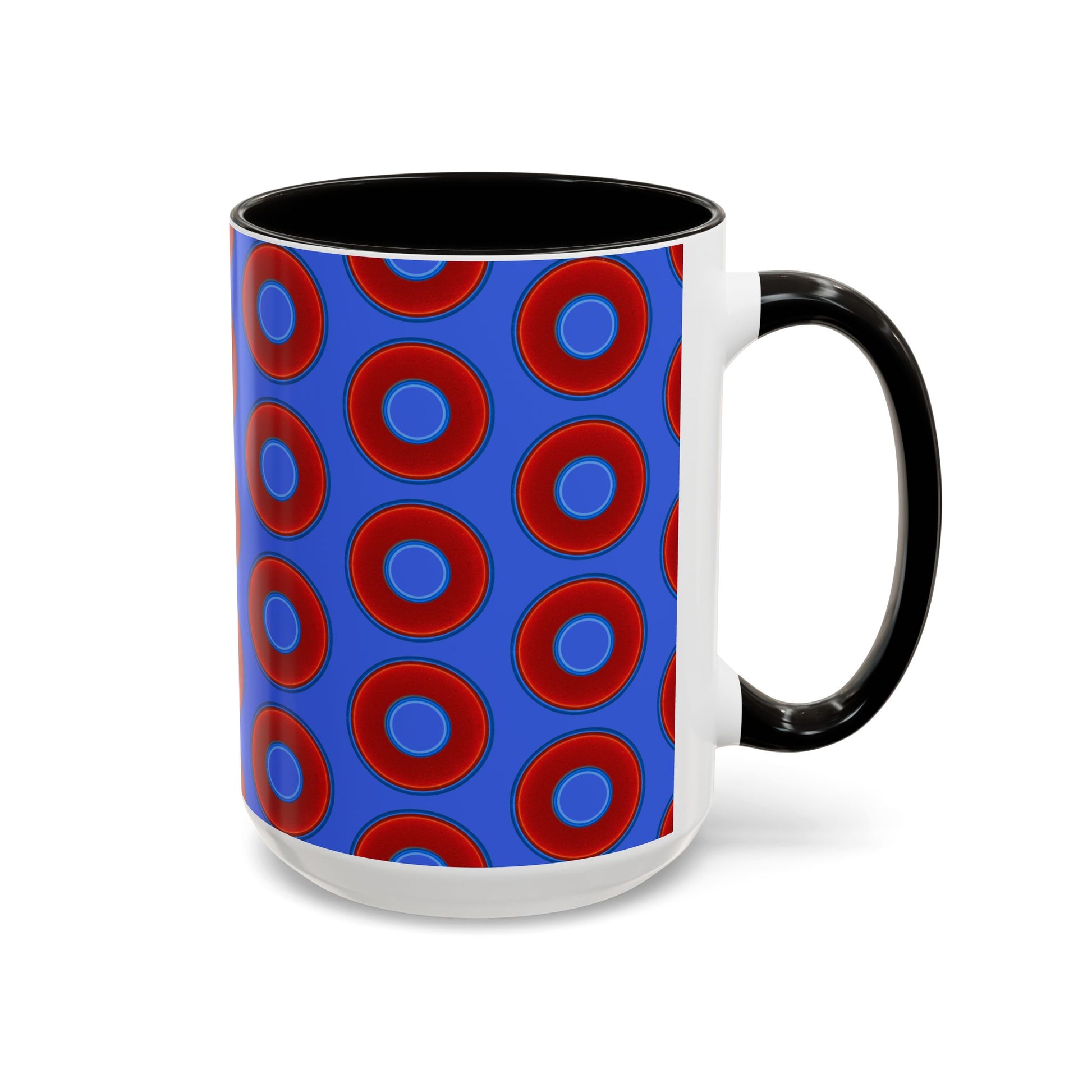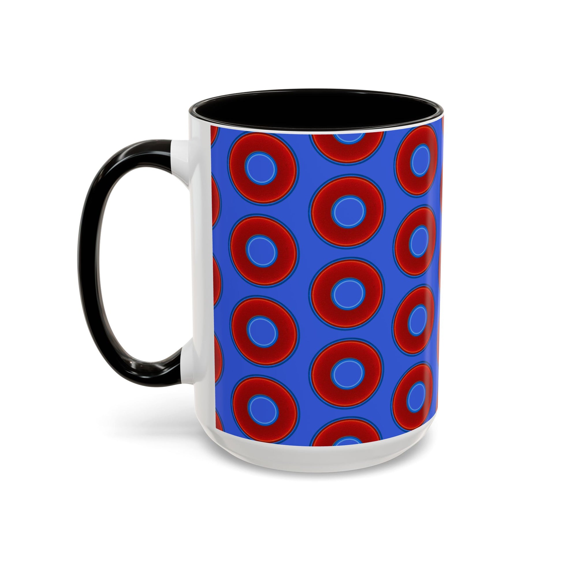 Lump's Grumpy Coffee Mug - vivid red donuts w/royal blue background