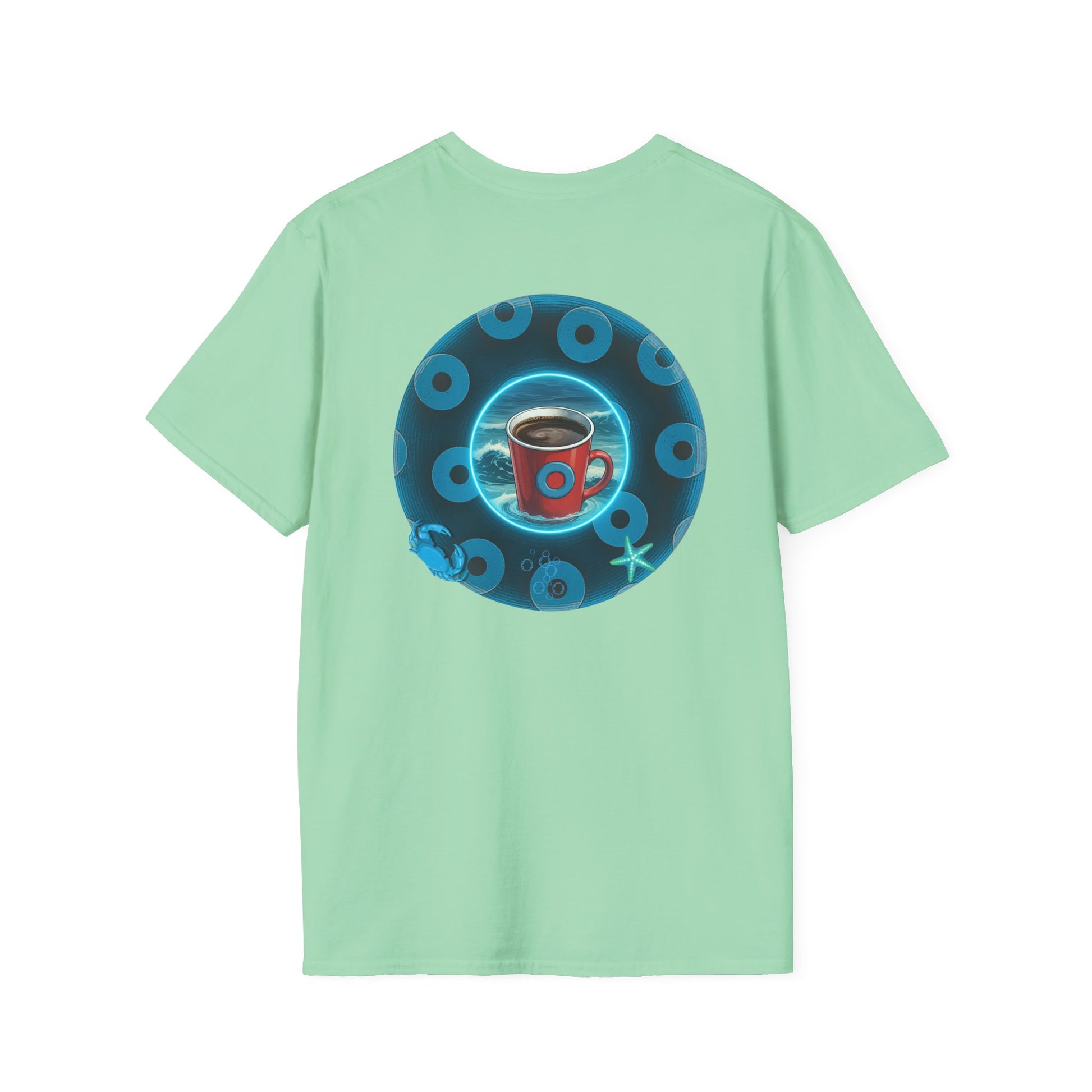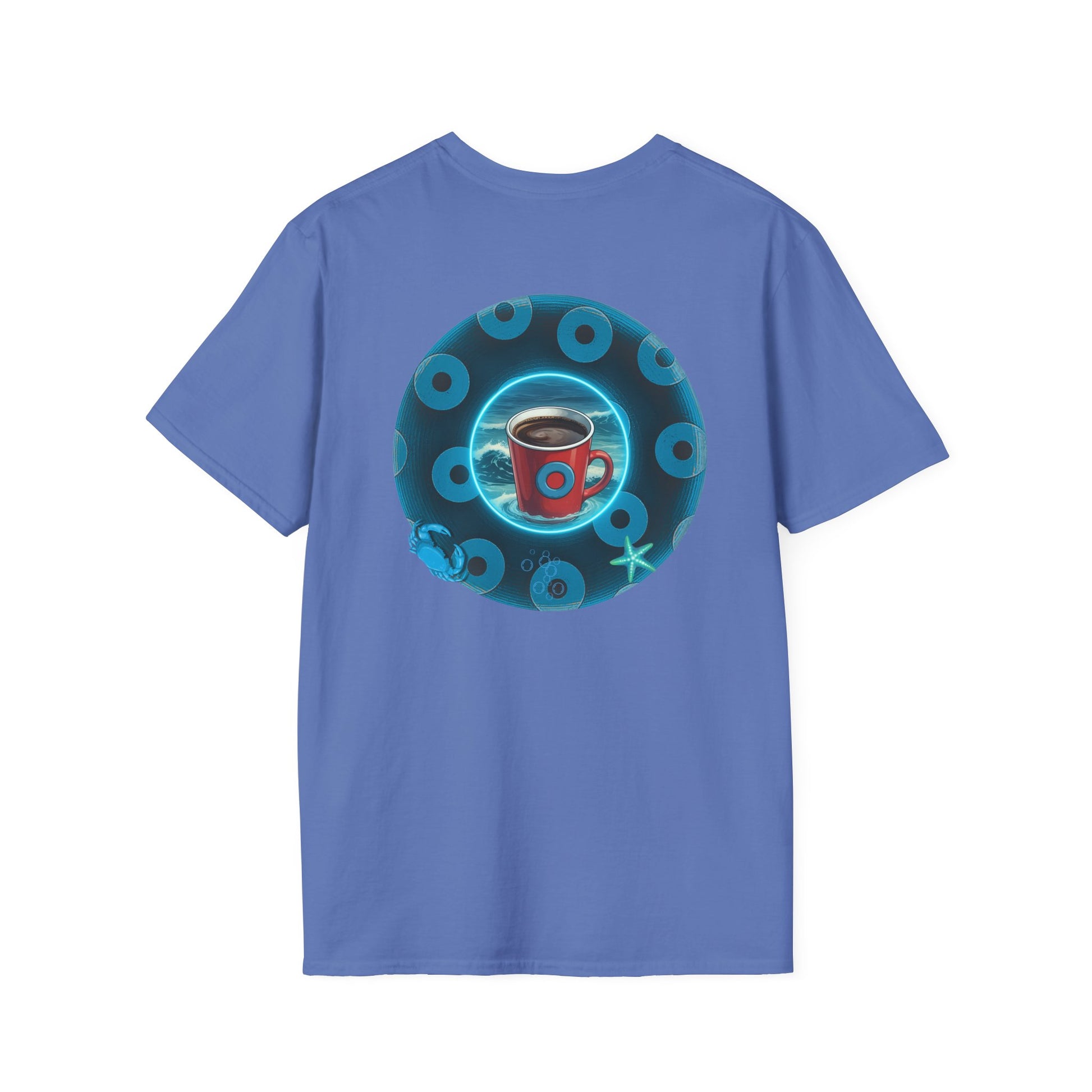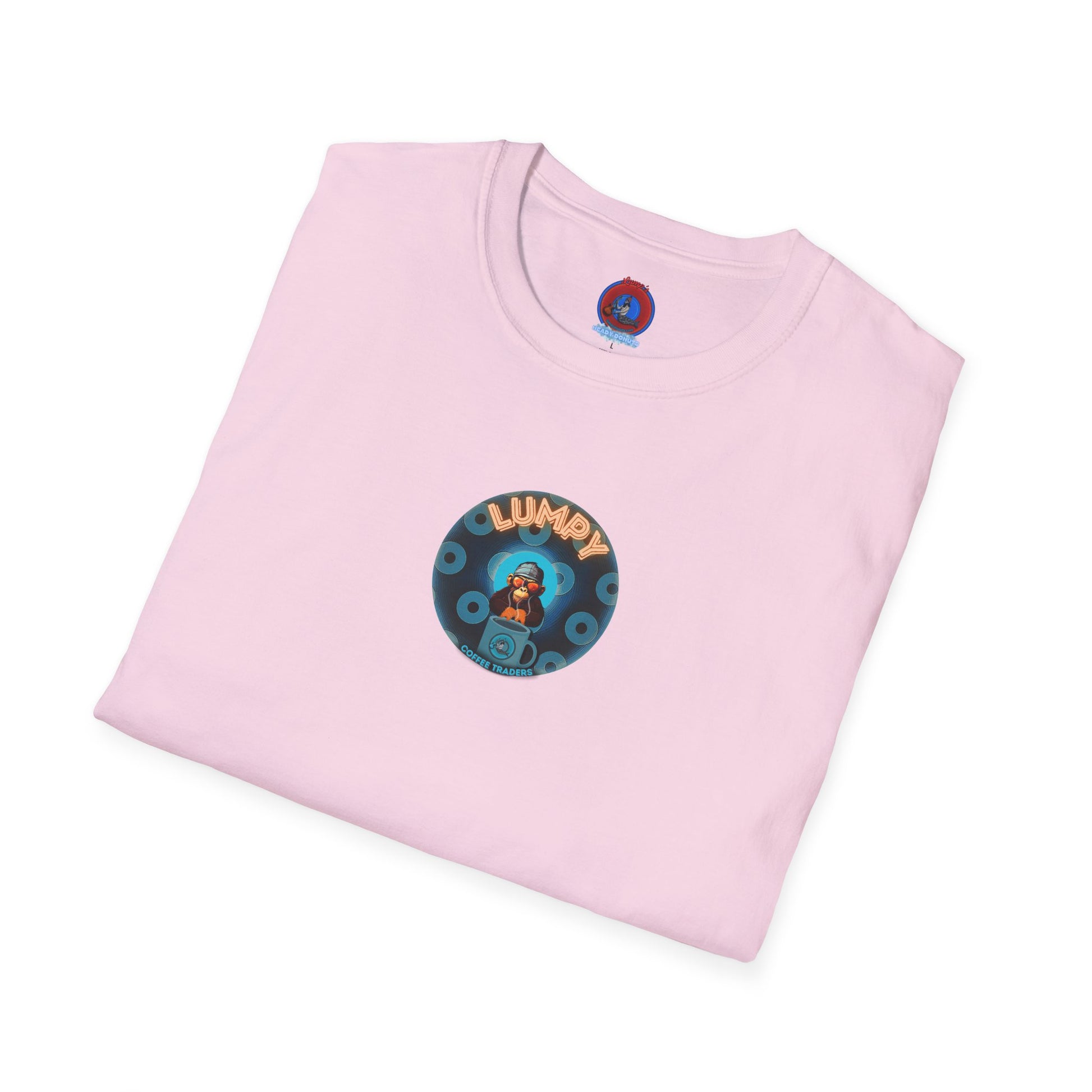 Lumpy Coffee Traders Tee - Unisex Soft-Style - "Good to Last Leaky Drop" - paradoxical ocean donut - variant 1 - logo front/coffee back