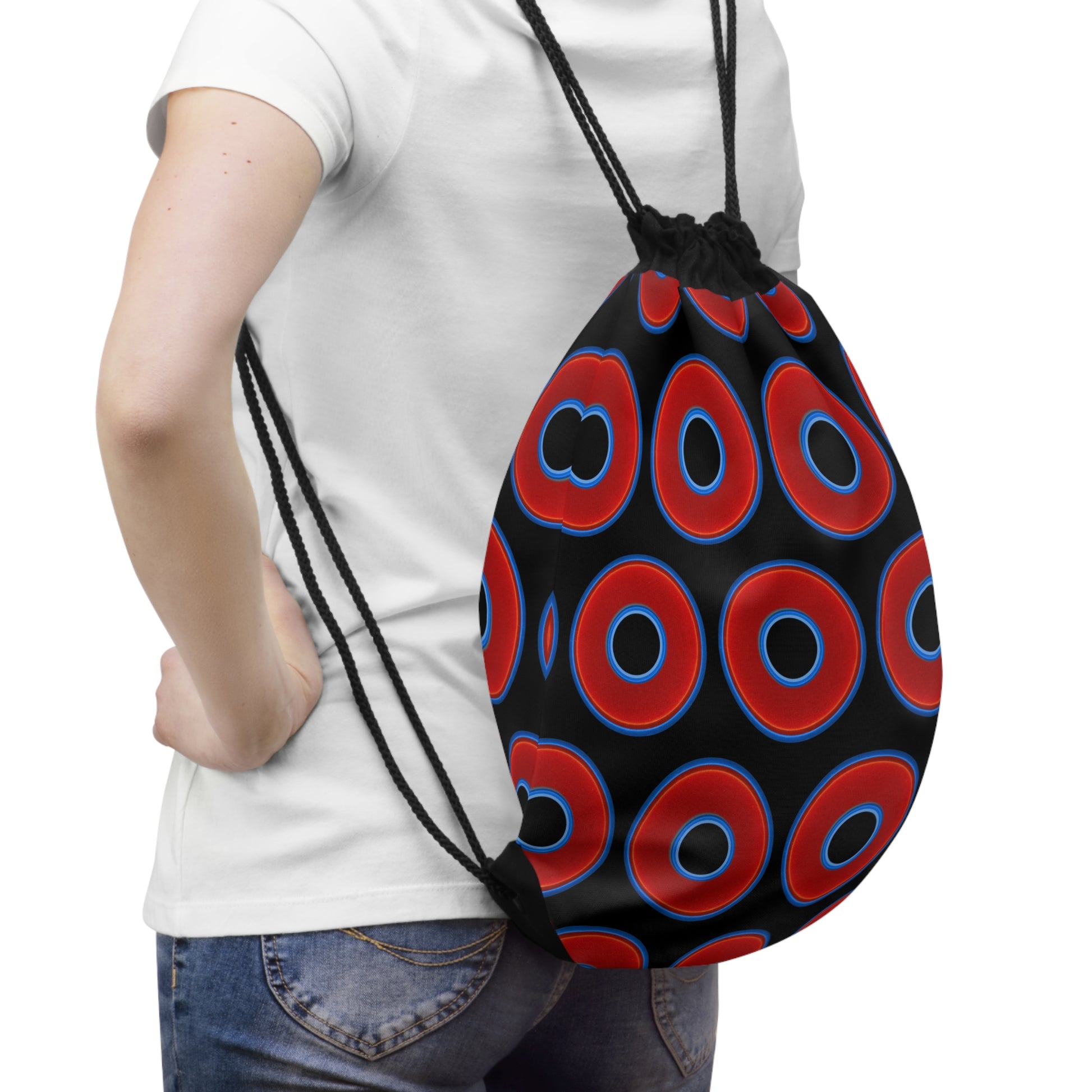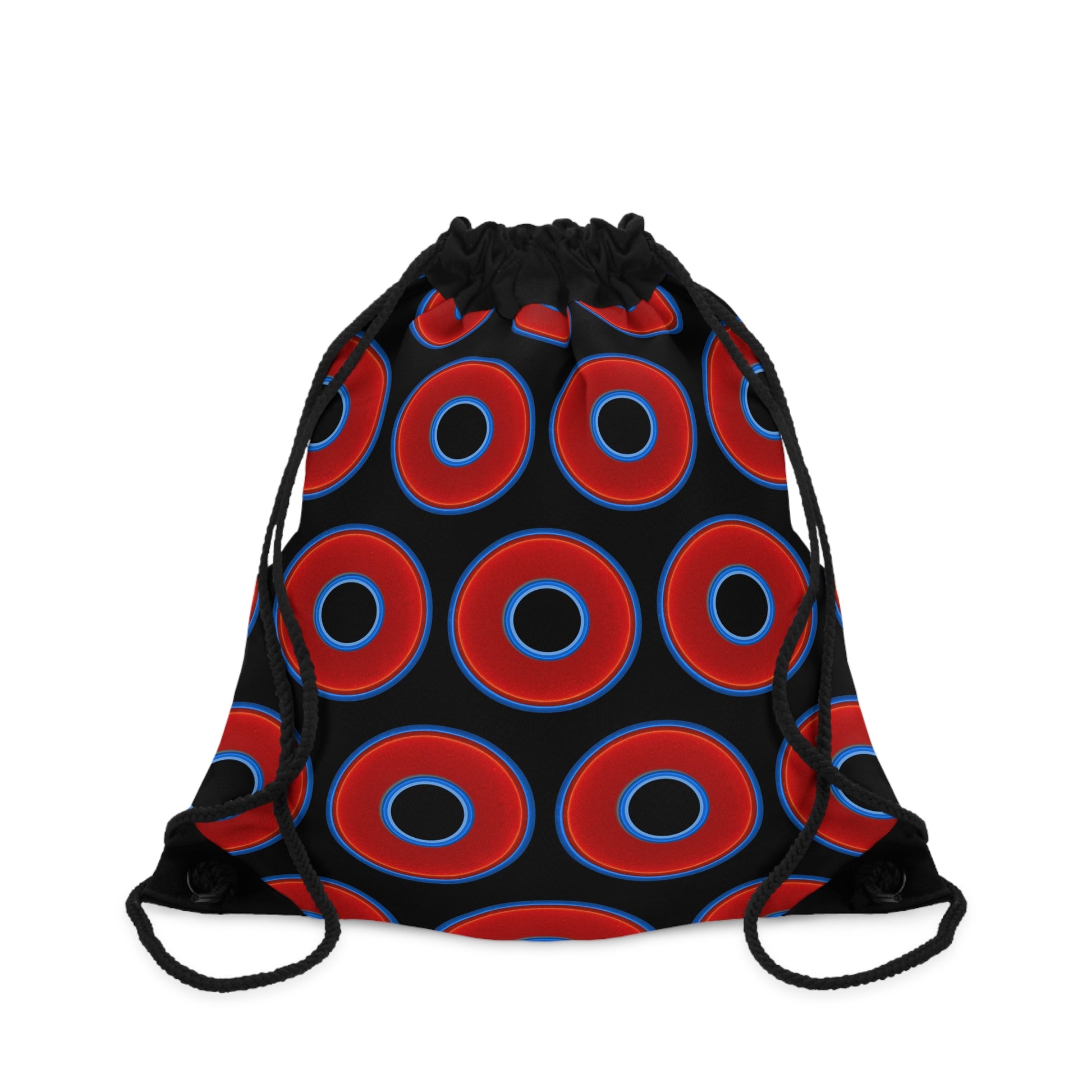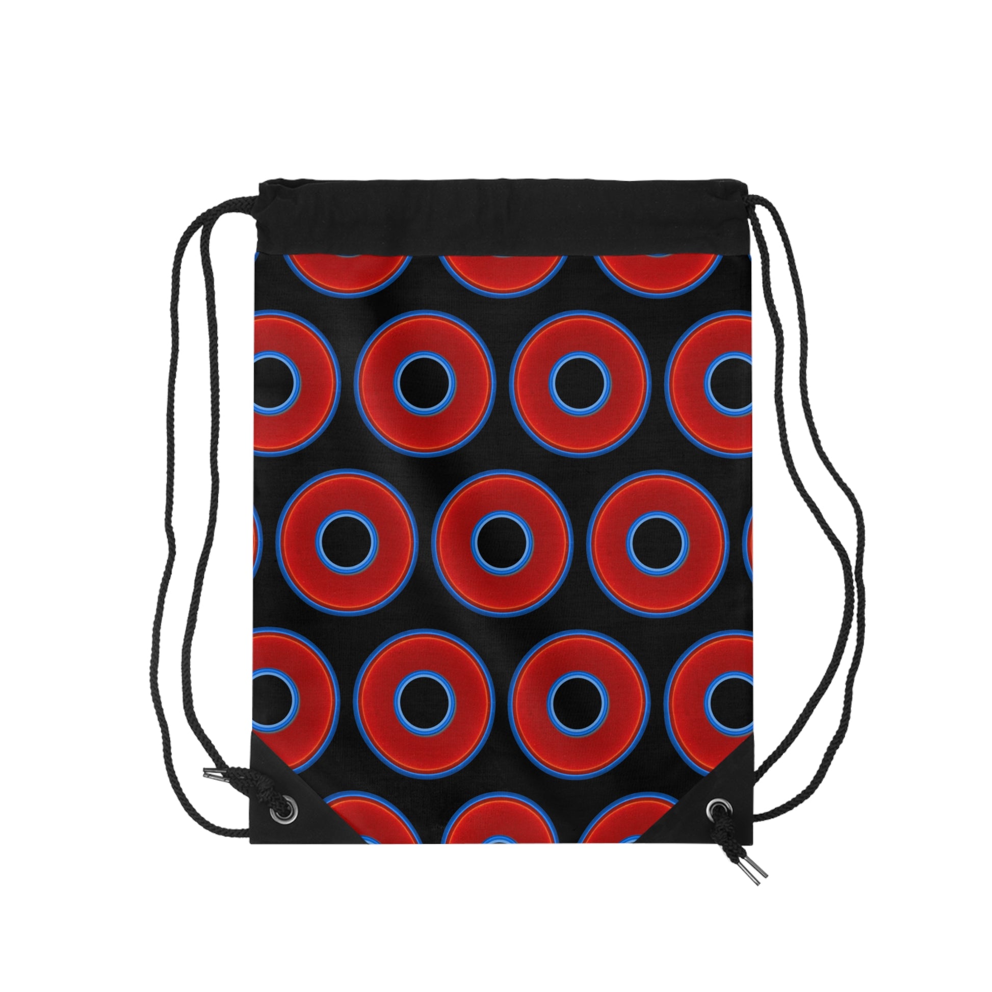 Lumpy Donut Drawstring Bag - red vivid donuts print w/black background