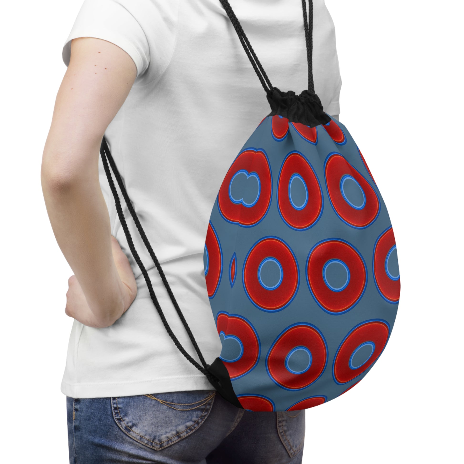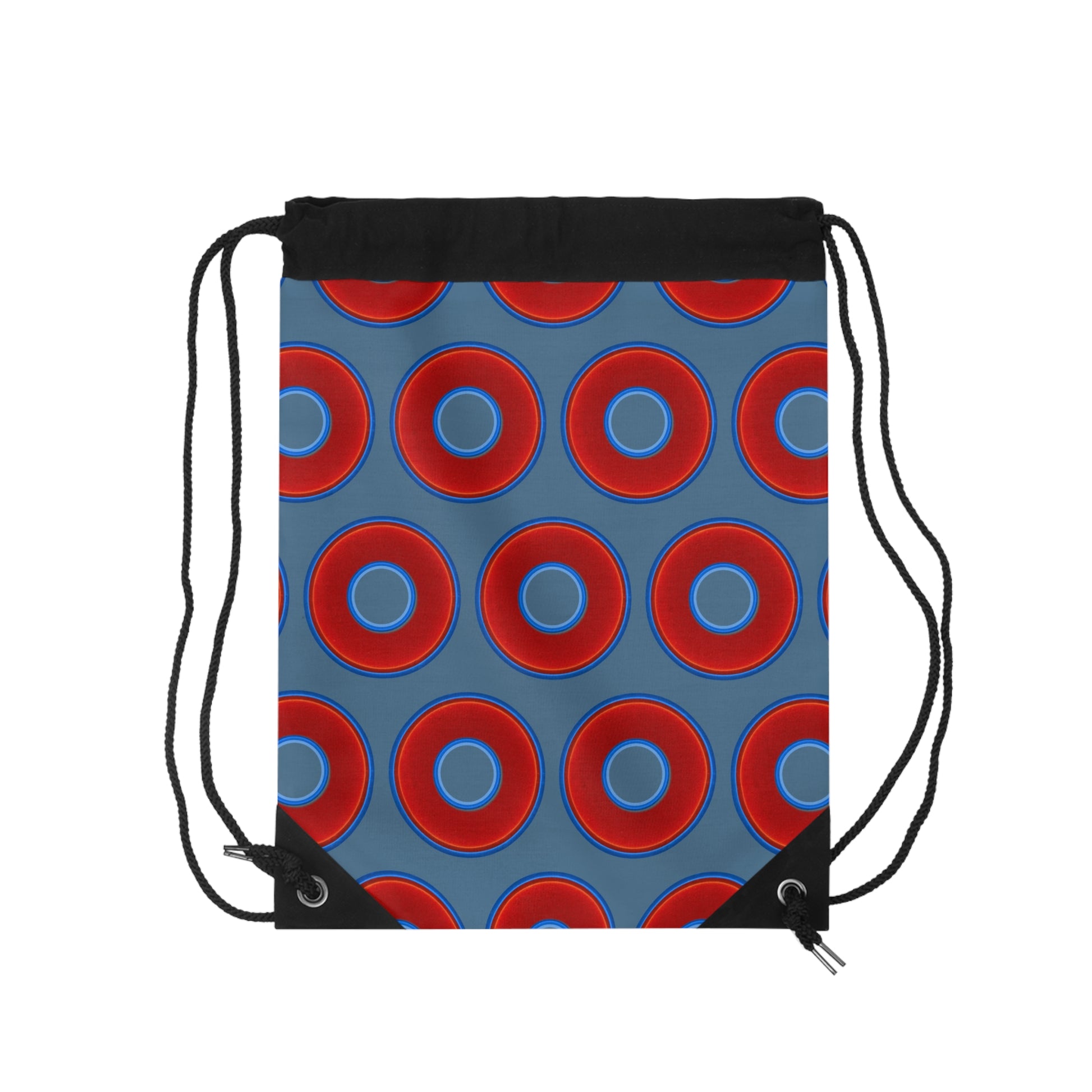 Lumpy Donut Drawstring Bag - red vivid donuts print w/steel blue background