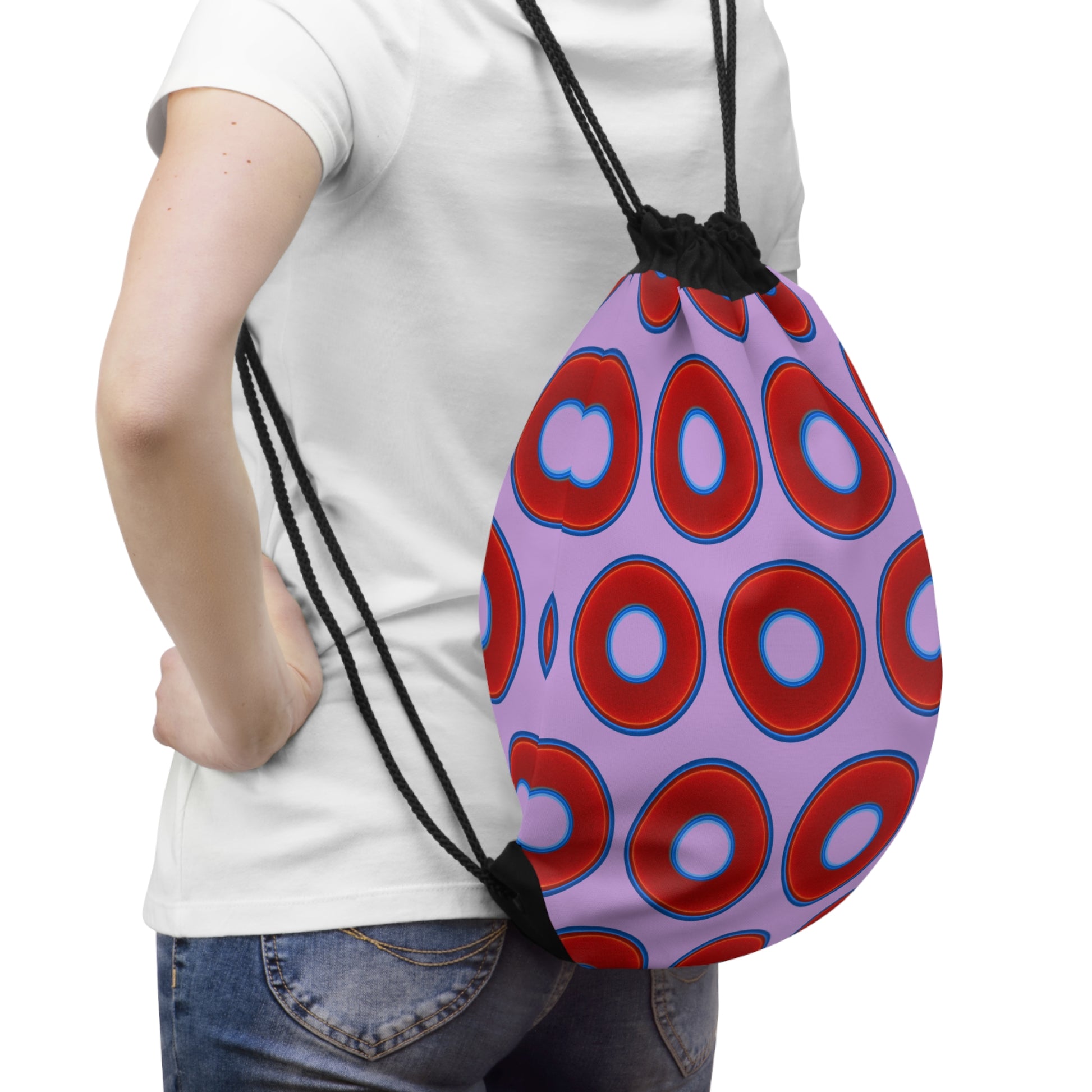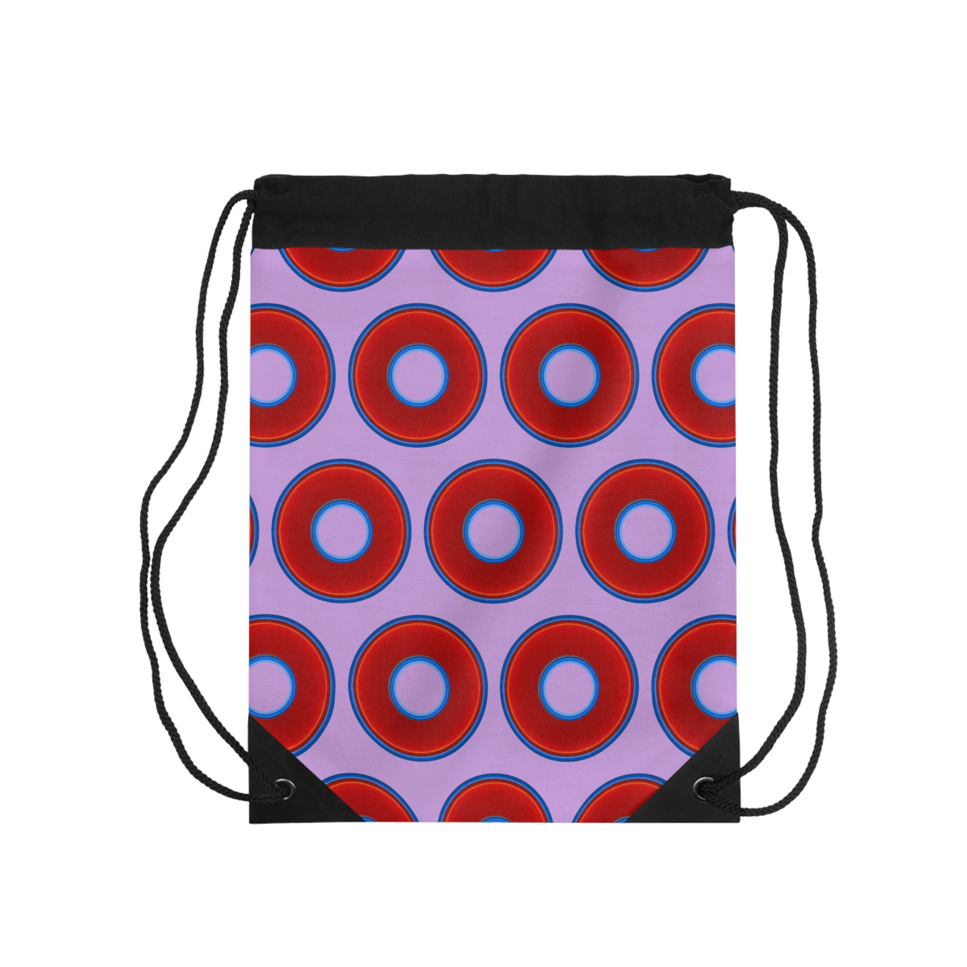 Lumpy Donut Drawstring Bag - red vivid donuts print w/wisteria purple background