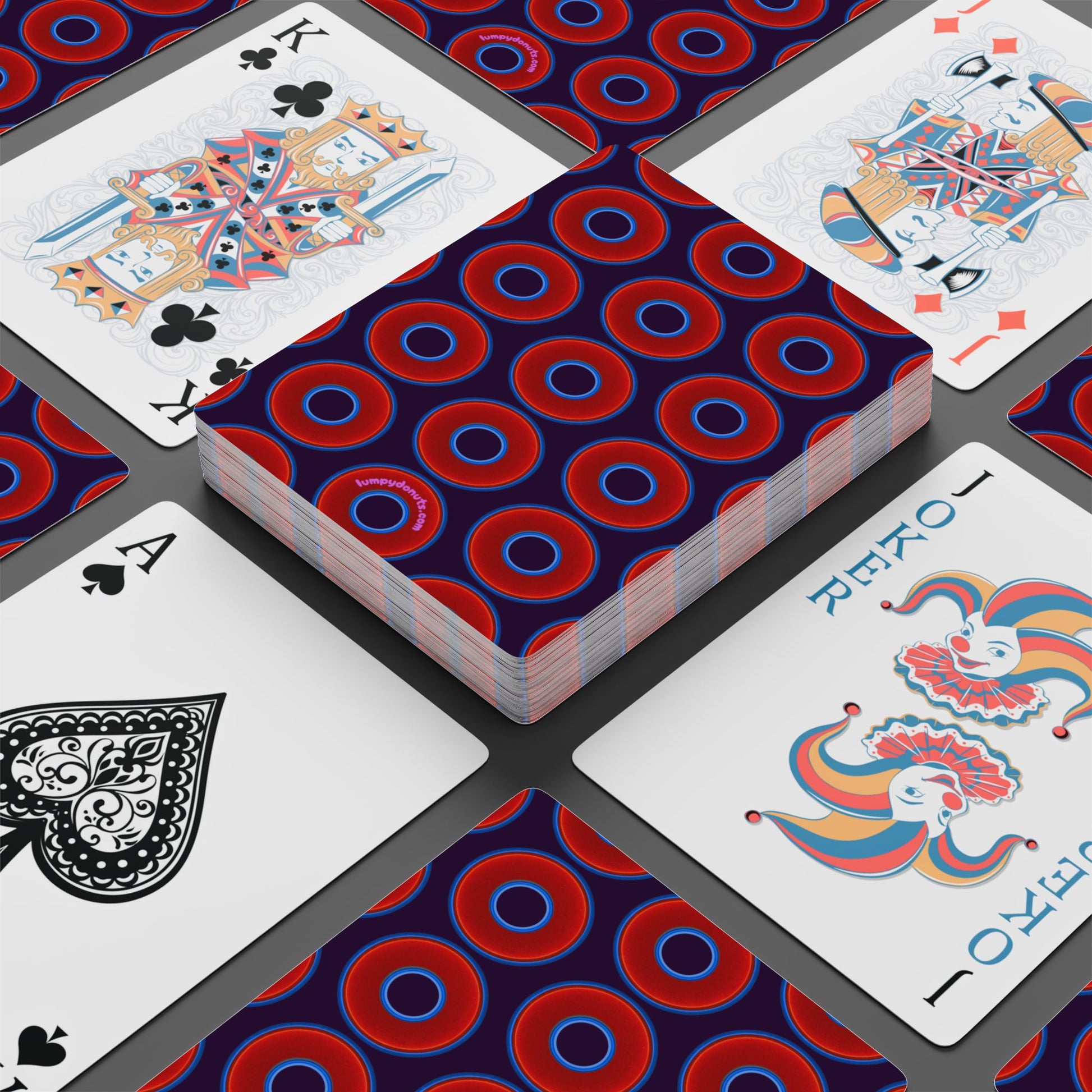 Lumpy Donut Playing Decks - 52-cards - red vivid donuts w/midnight purple background