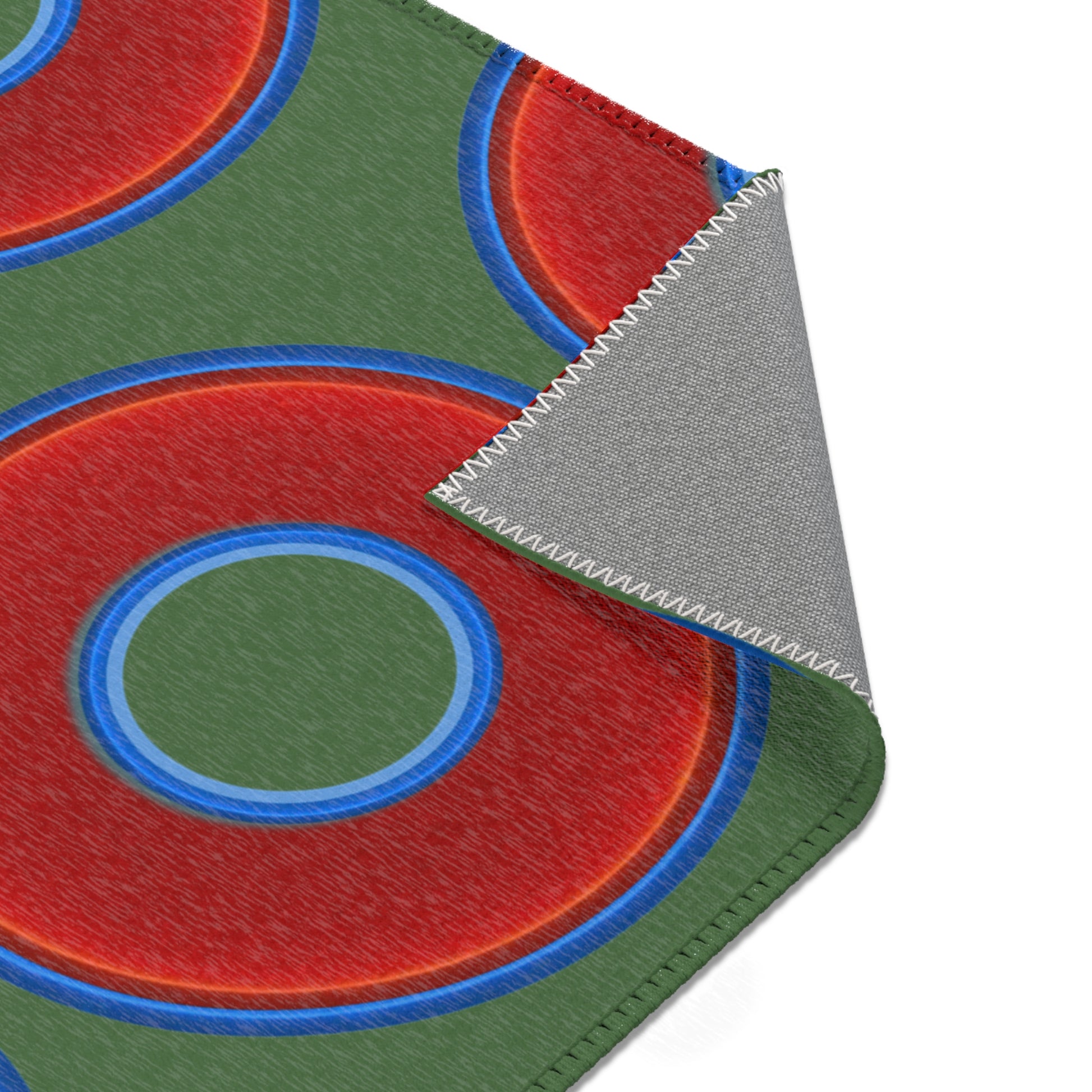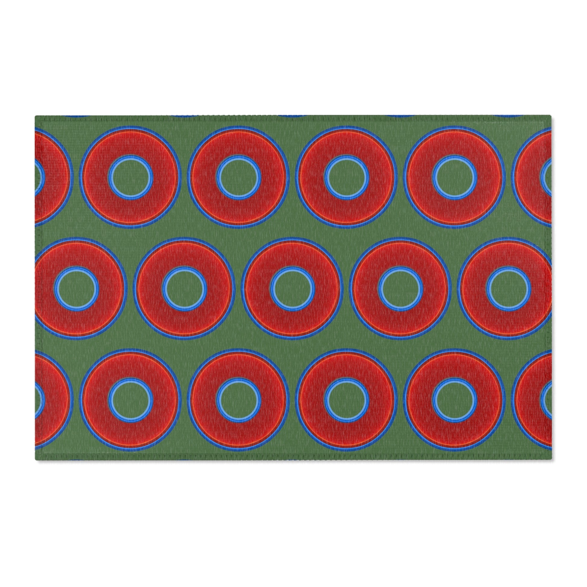 Lumpy Donut Print Rug - choice of 3 sizes - vivid red donut print w/dark green background