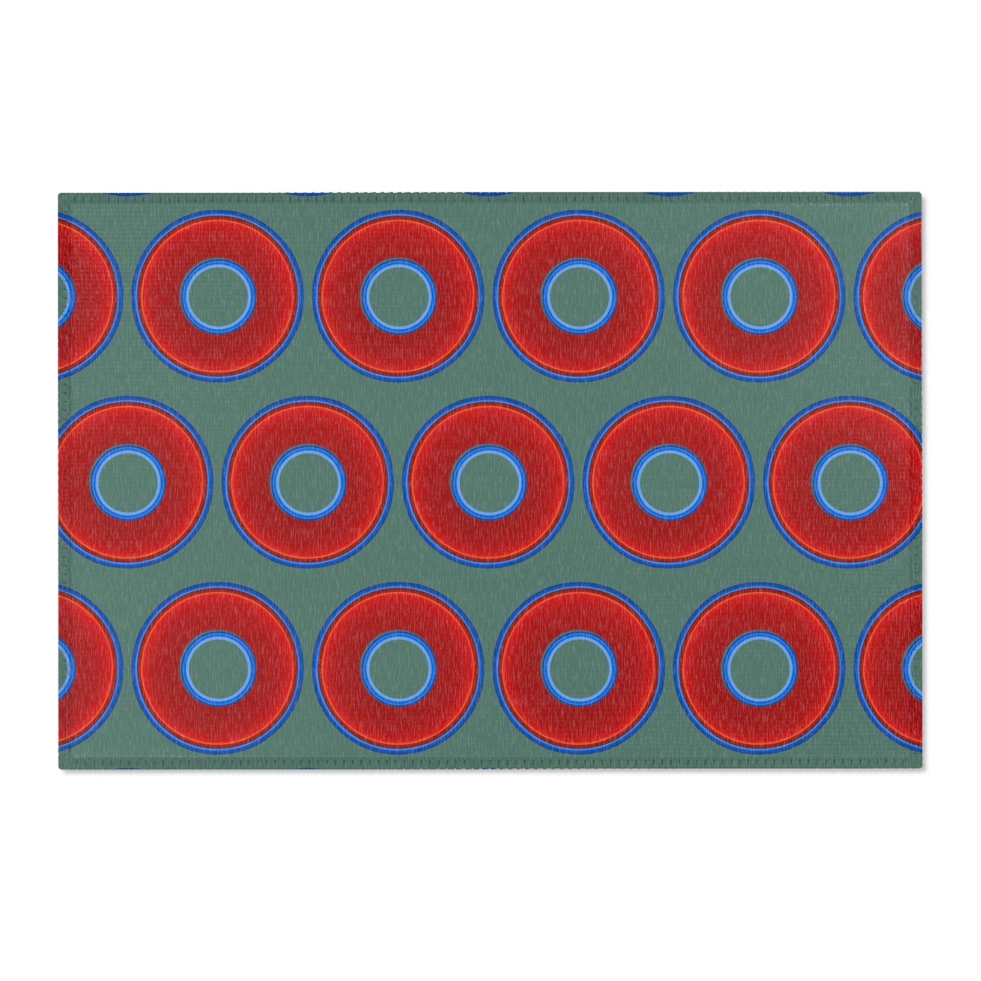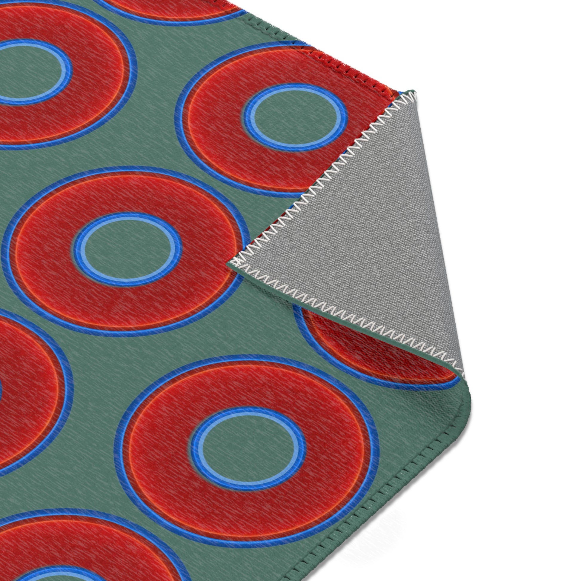 Lumpy Donut Print Rug - choice of 3 sizes - vivid red donut print w/Fenway green background