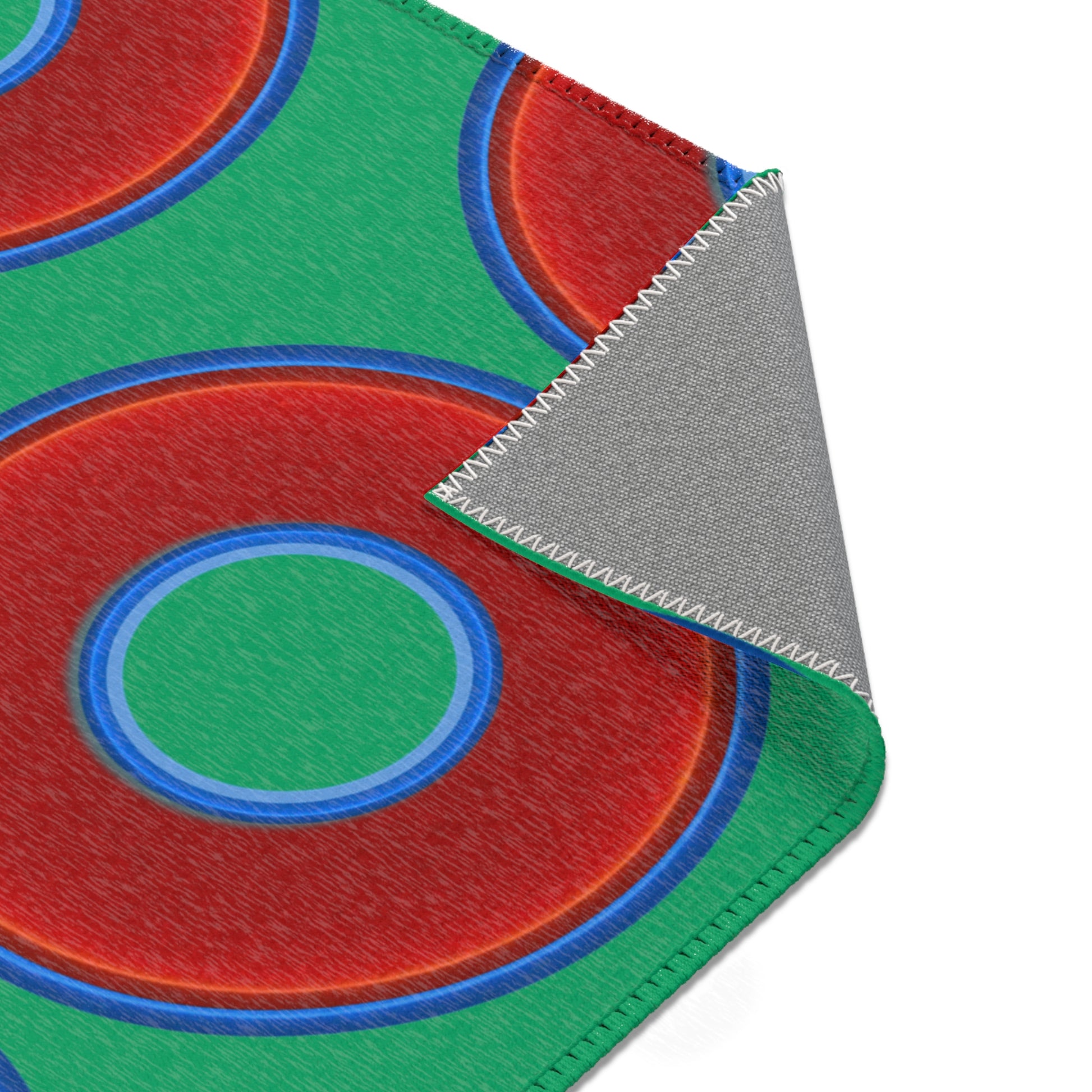 Lumpy Donut Print Rug - choice of 3 sizes - vivid red donut print w/jade green background