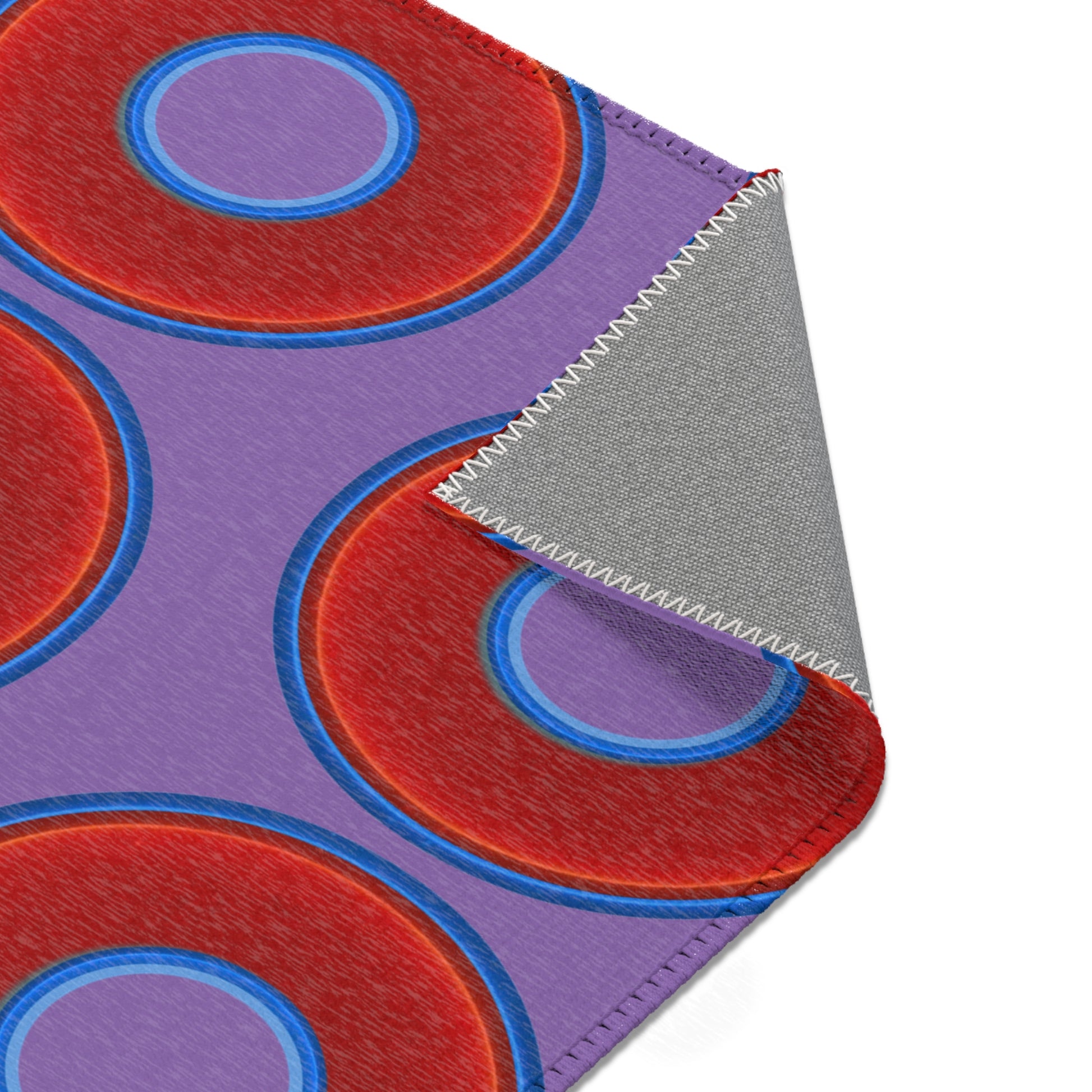 Lumpy Donut Print Rug - choice of 3 sizes - vivid red donut print w/light purple background