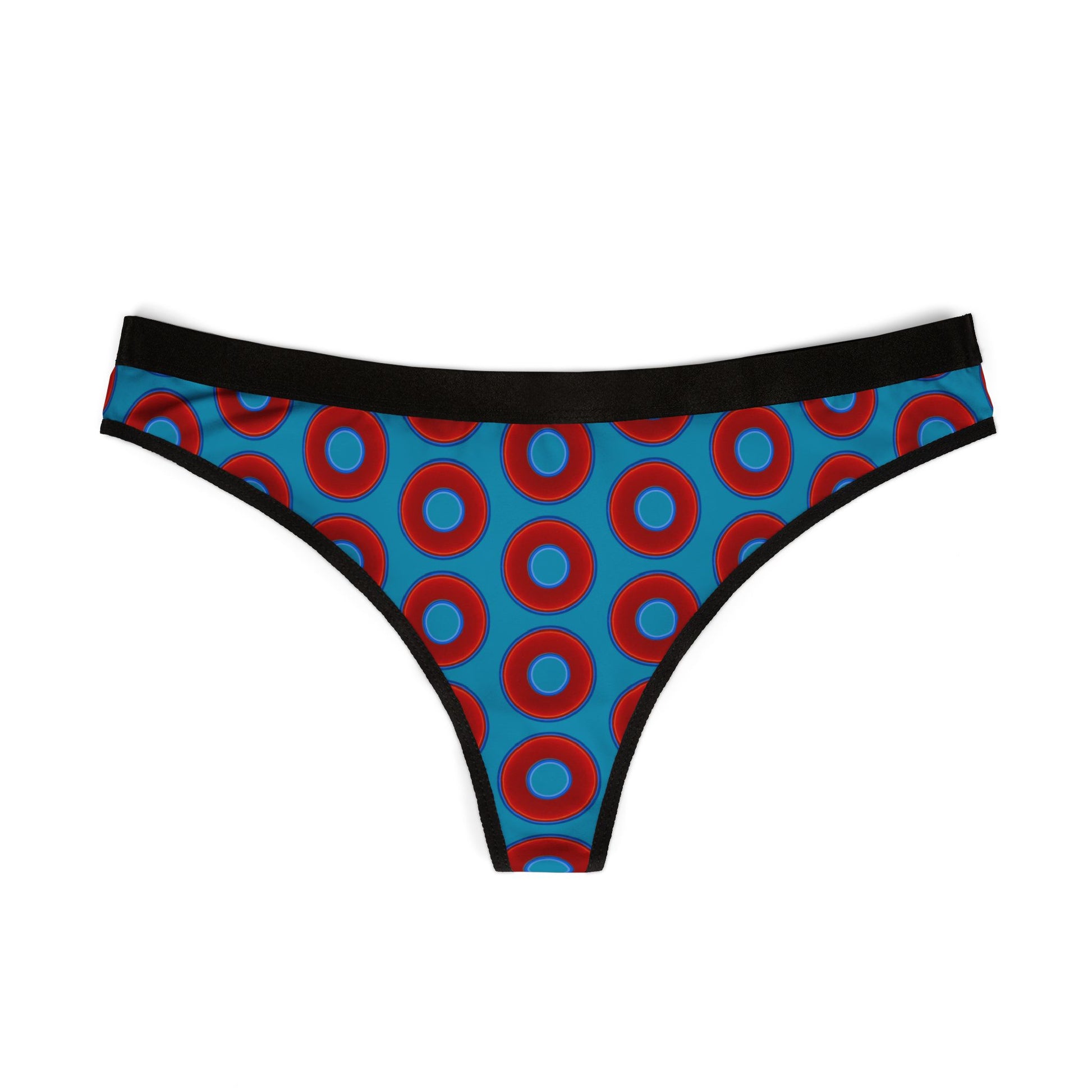 Lumpy Donut Thongs - red vivid donut print w/aquamarine blue background