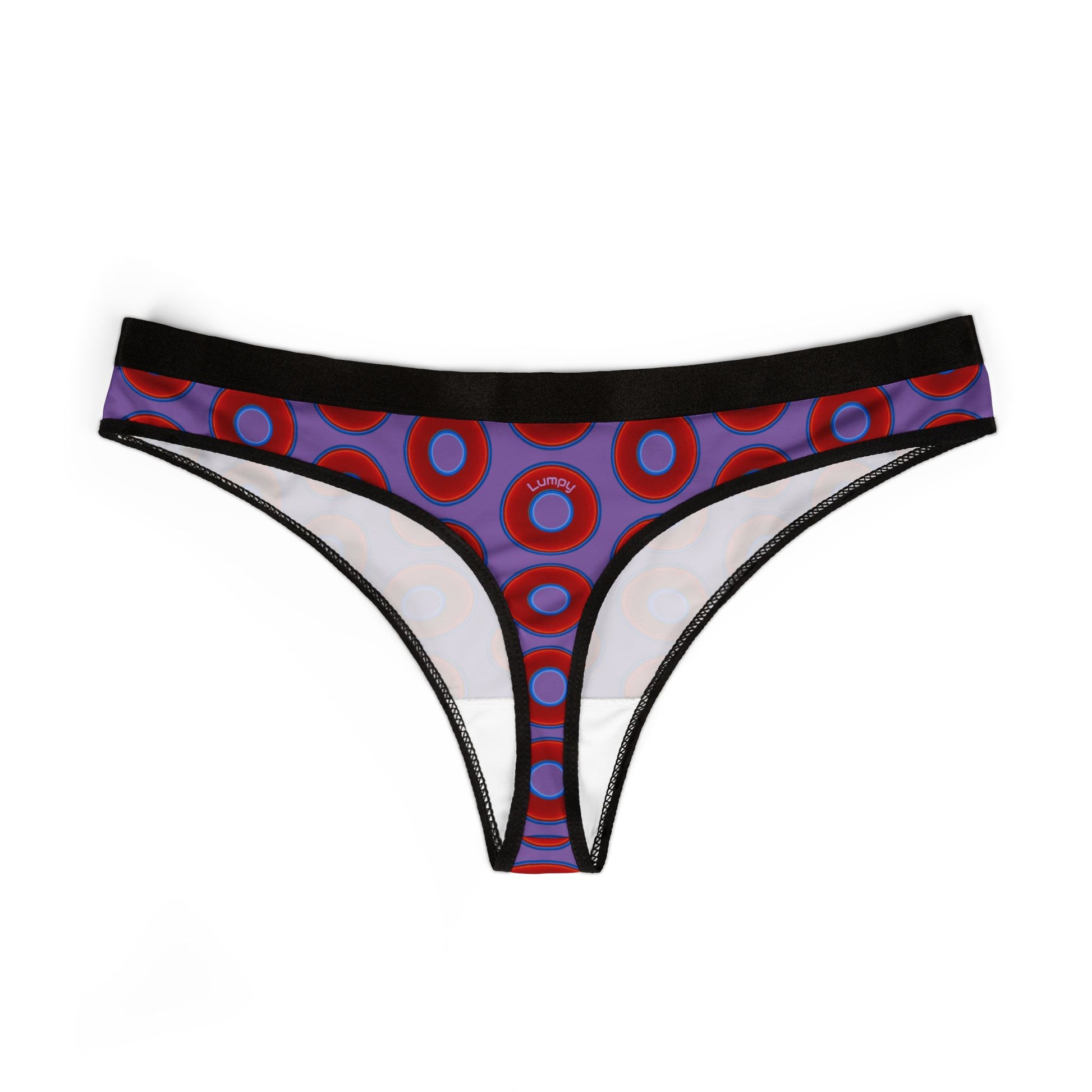 Lumpy Donut Thongs - red vivid donut print w/light purple background