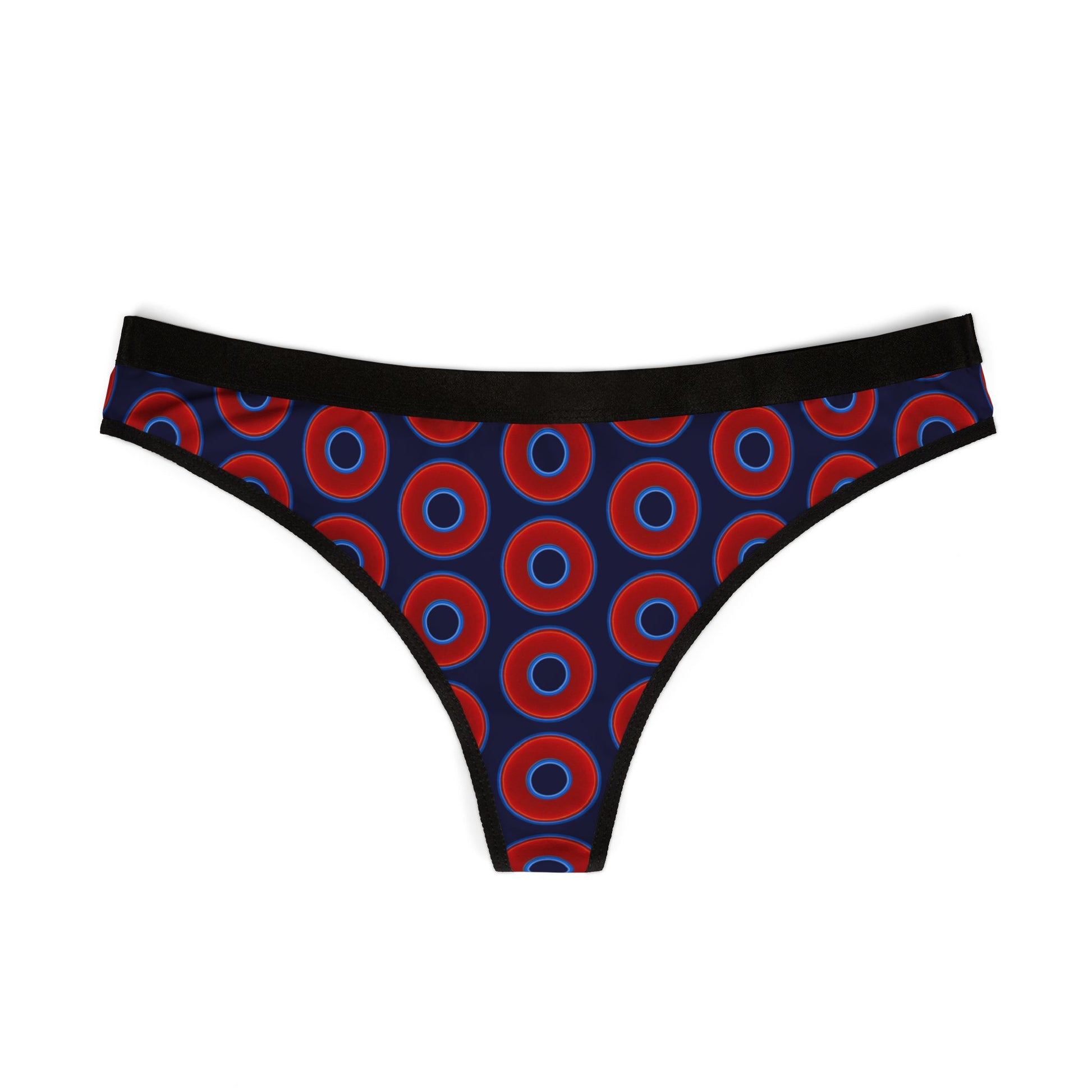 Lumpy Donut Thongs - red vivid donut print w/midnight blue background
