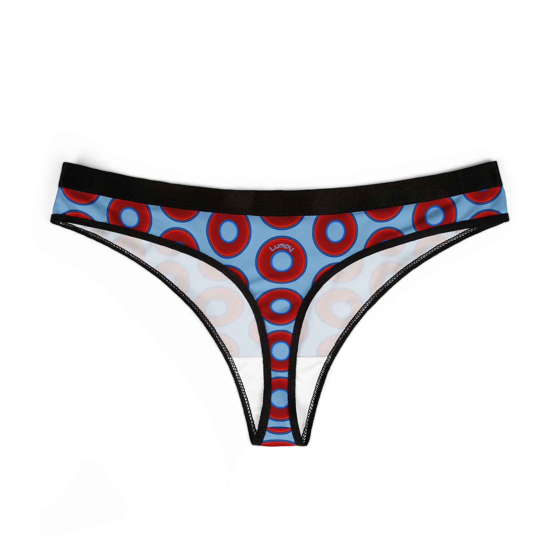 Lumpy Donut Thongs - red vivid donut print w/sky blue background