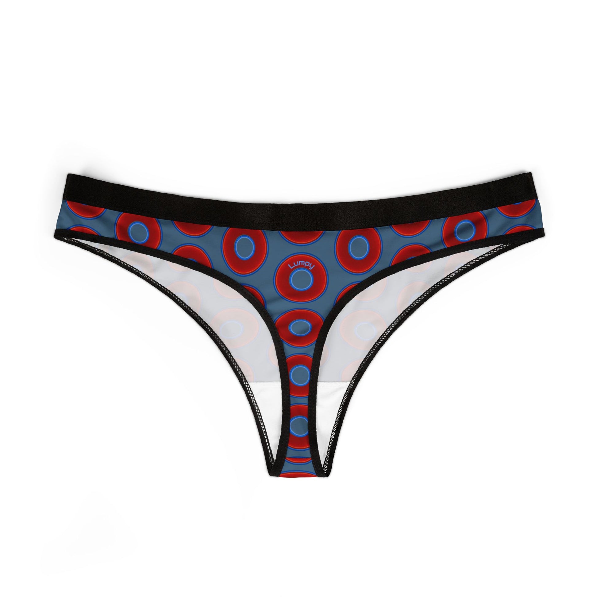 Lumpy Donut Thongs - red vivid donut print w/steel blue background