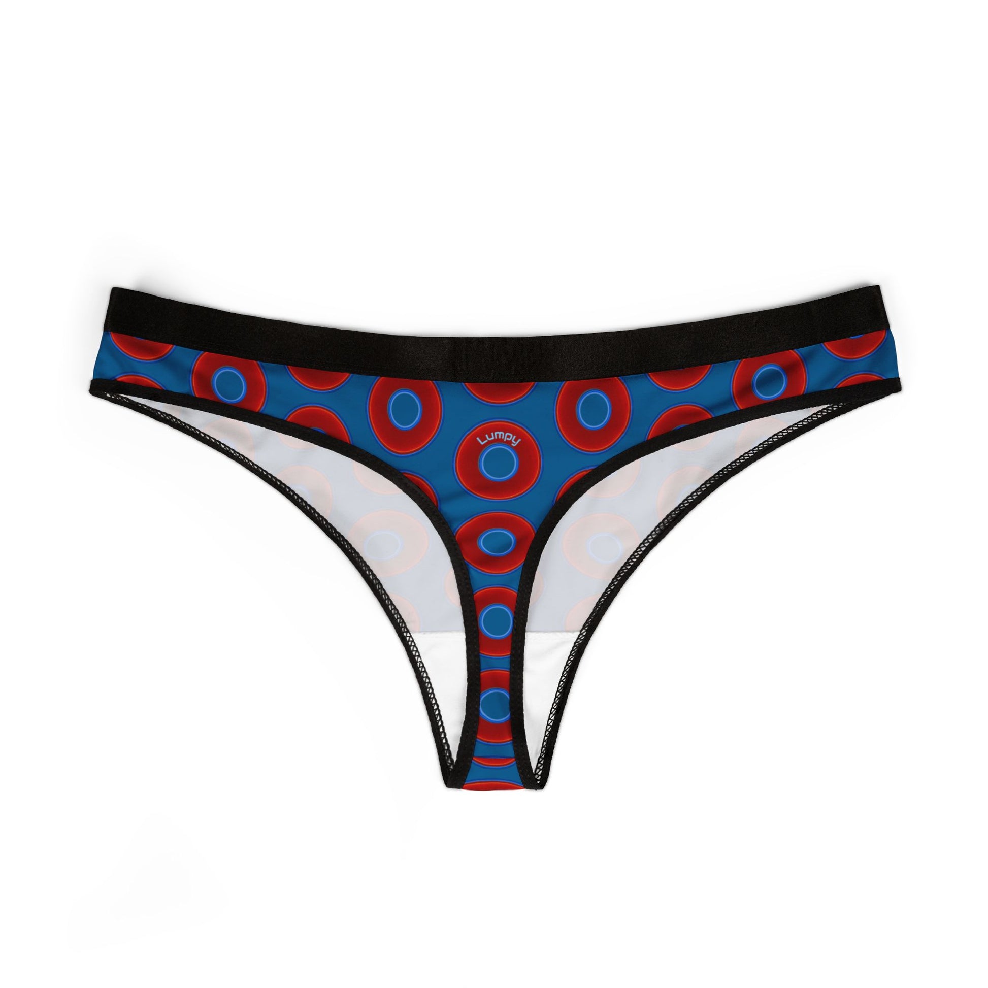 Lumpy Donut Thongs - red vivid donut print w/wavy navy blue background