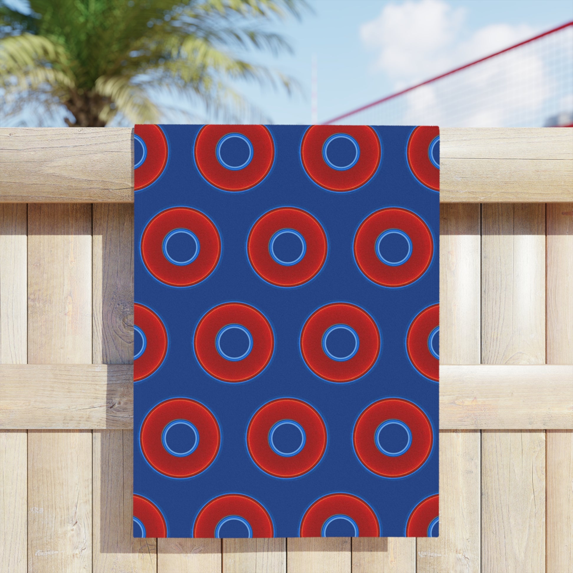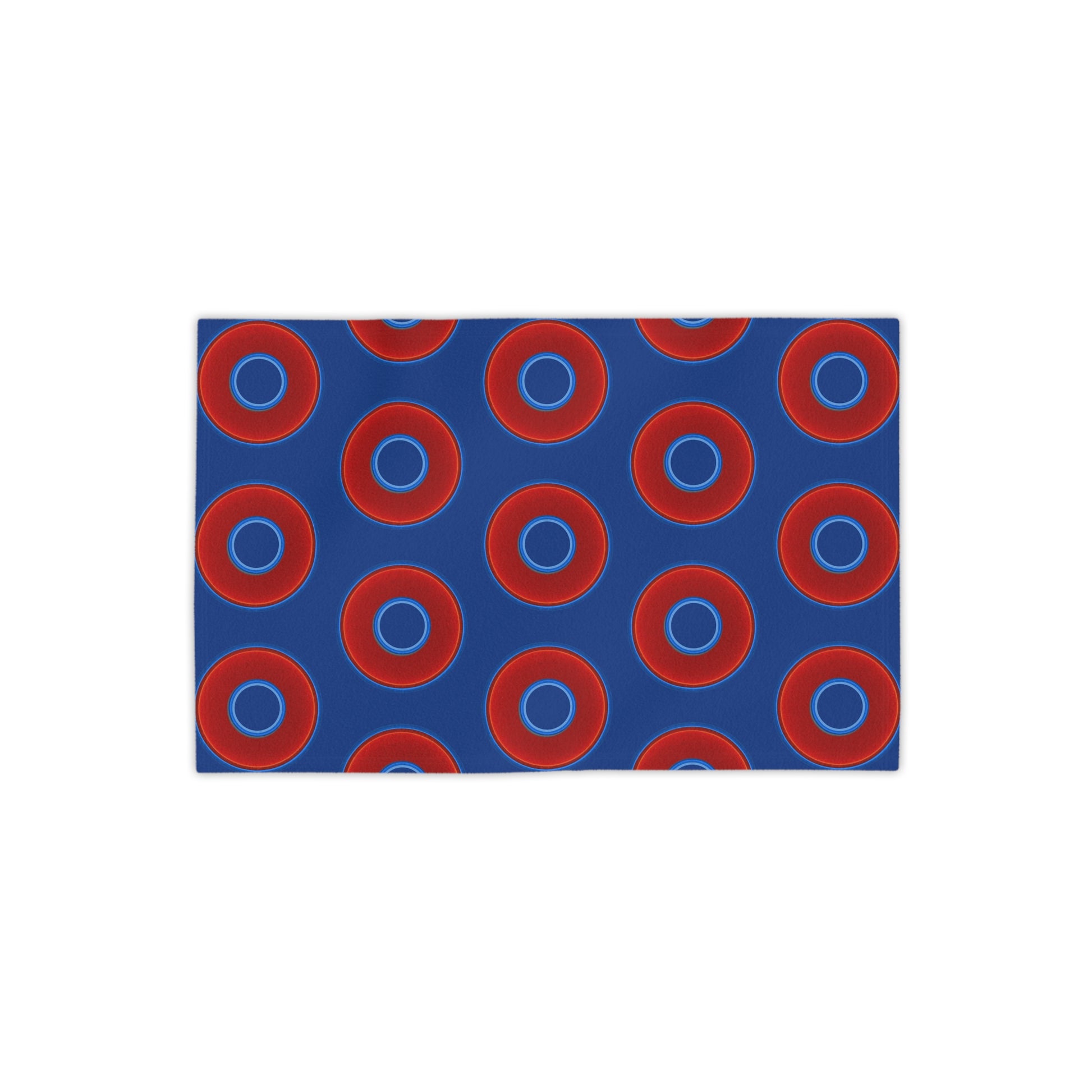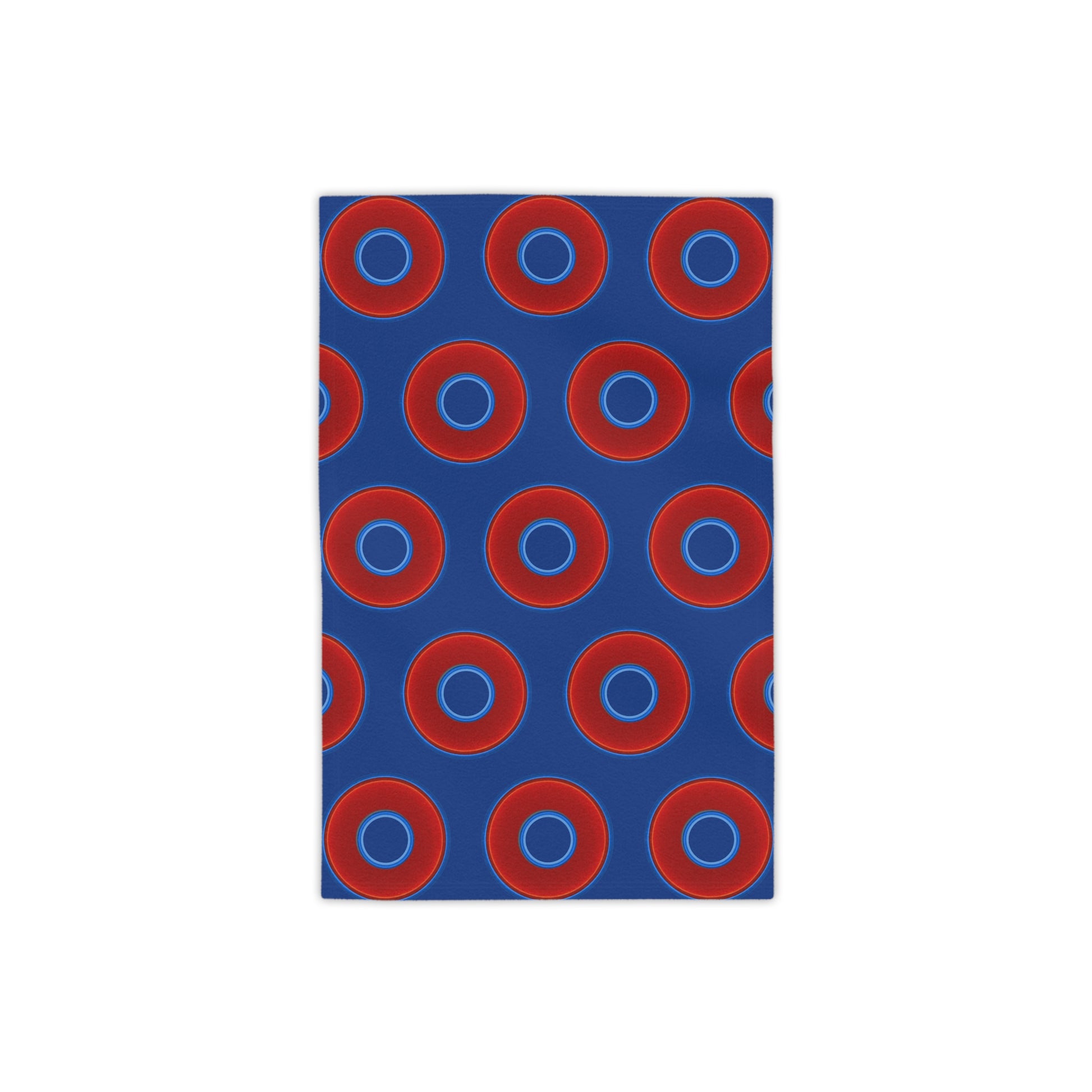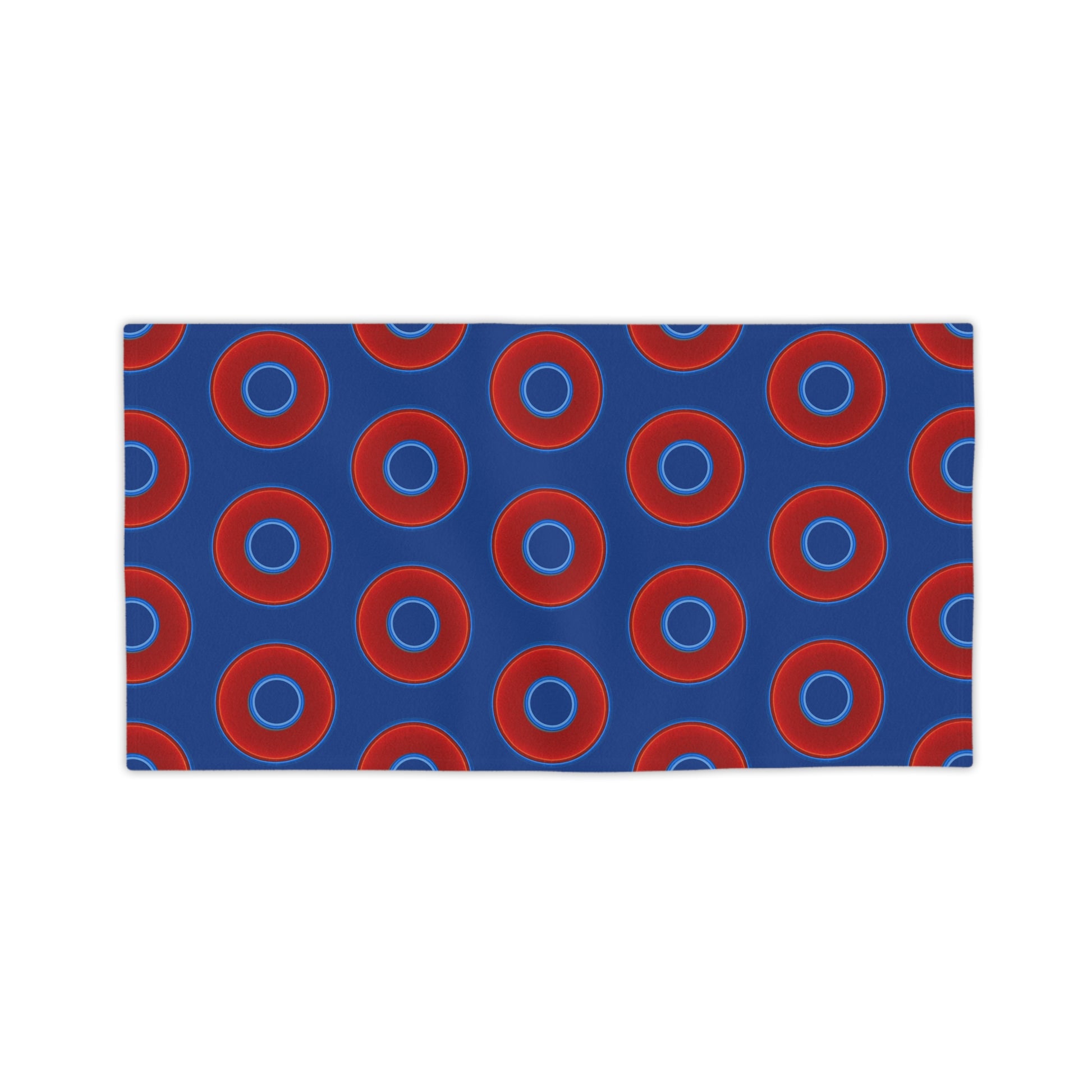 Lumpy Donut Towels - vivid red donuts w/dark blue background